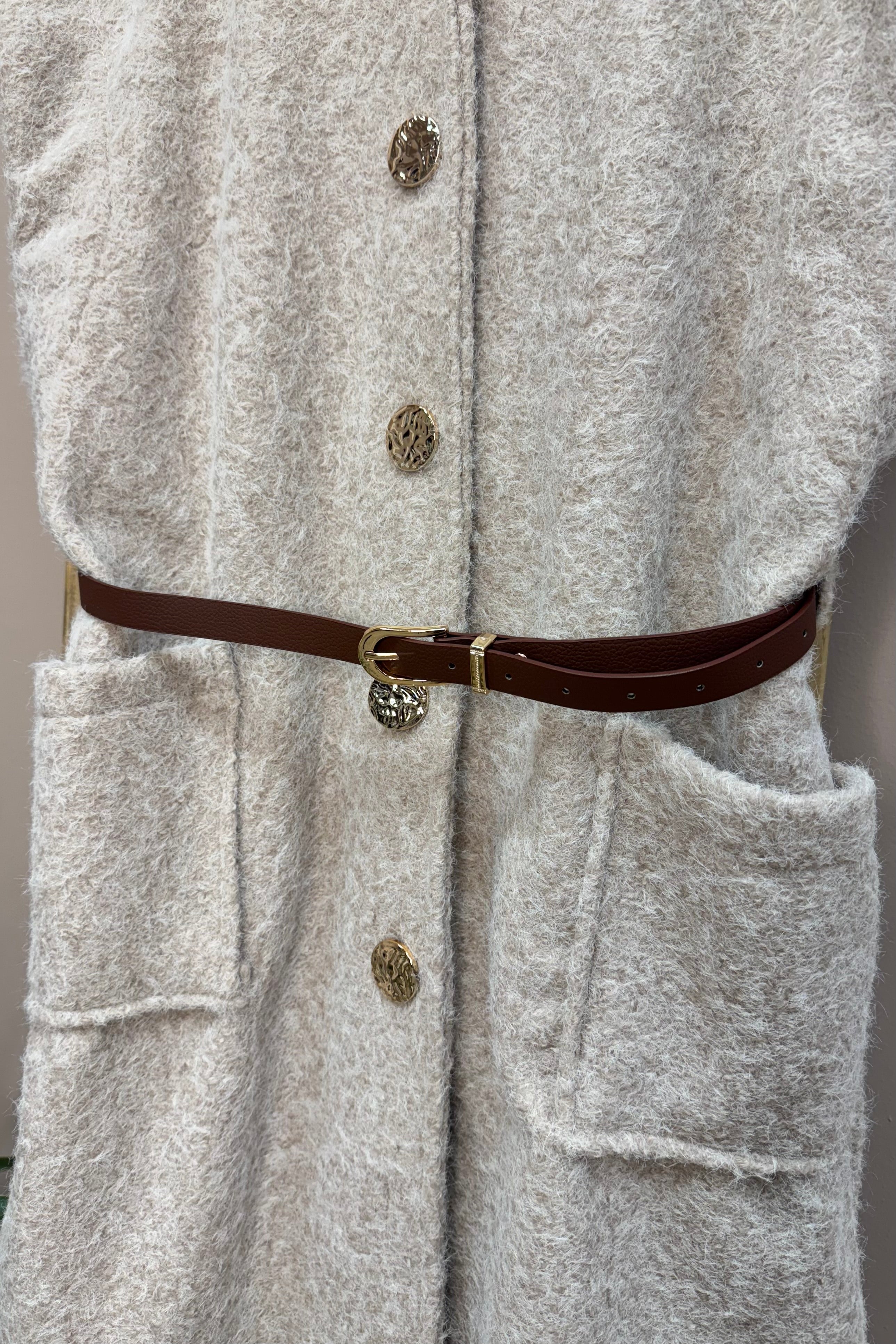 This long waistcoat is designed for versatility and style. Wear it as a dress or layer it as an extra piece for added flair. It features standout gold buttons, handy front pockets, and a brown belt to cinch the waist, offering both functionality and a polished look.