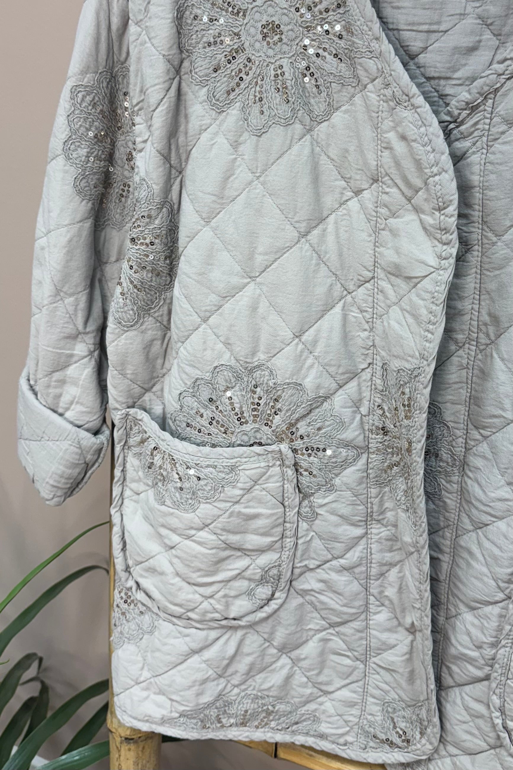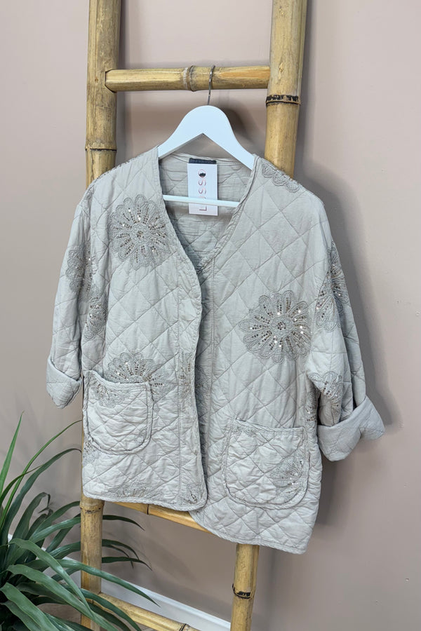 Turn heads this autumn and winter with the Beige Padded Sequin Jacket. Featuring daring embroidered sequin floral details, this jacket combines bold style with cozy comfort. Two practical pockets keep your hands warm while the padded design shields you from the chill. Make a statement while staying snug in this standout piece.