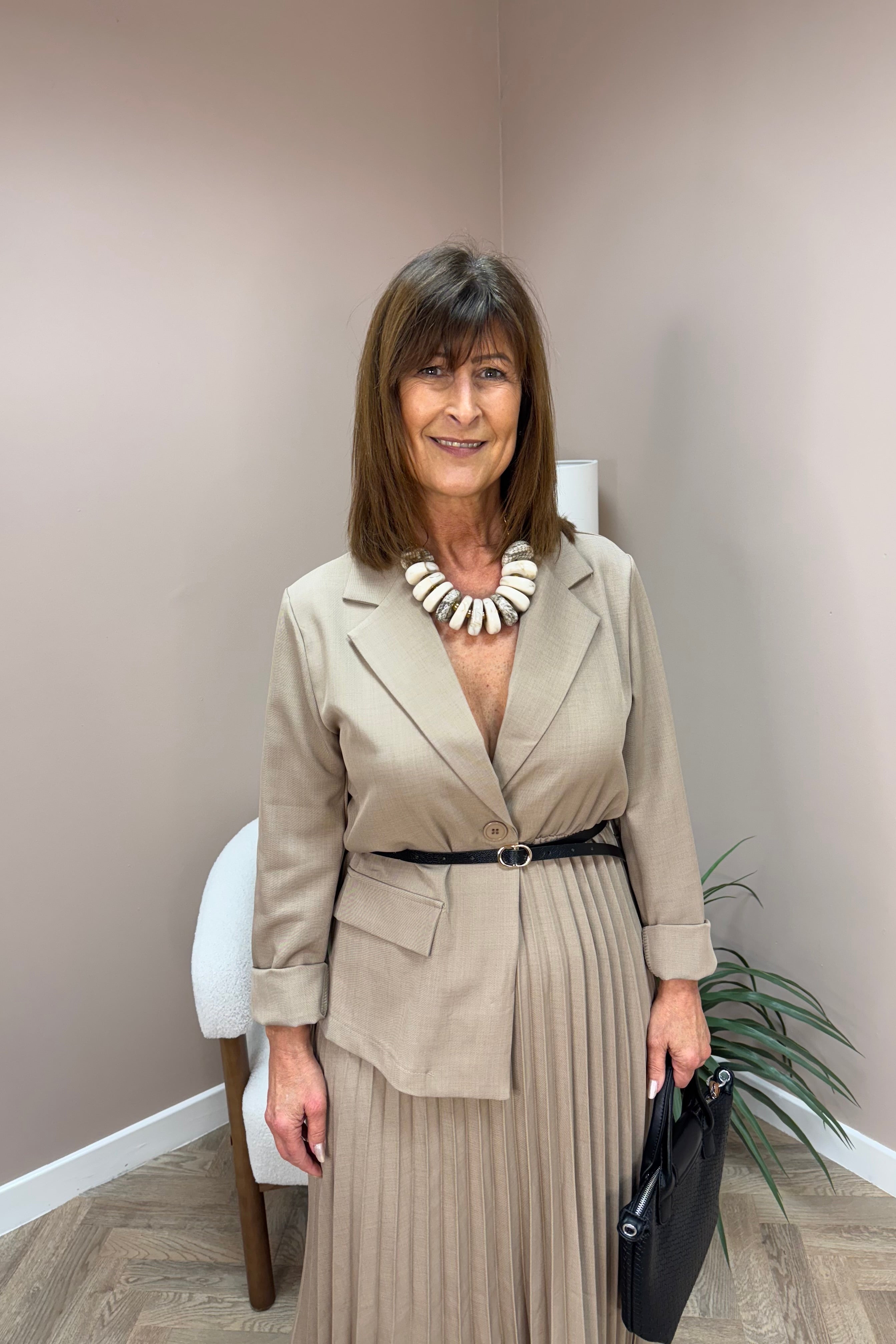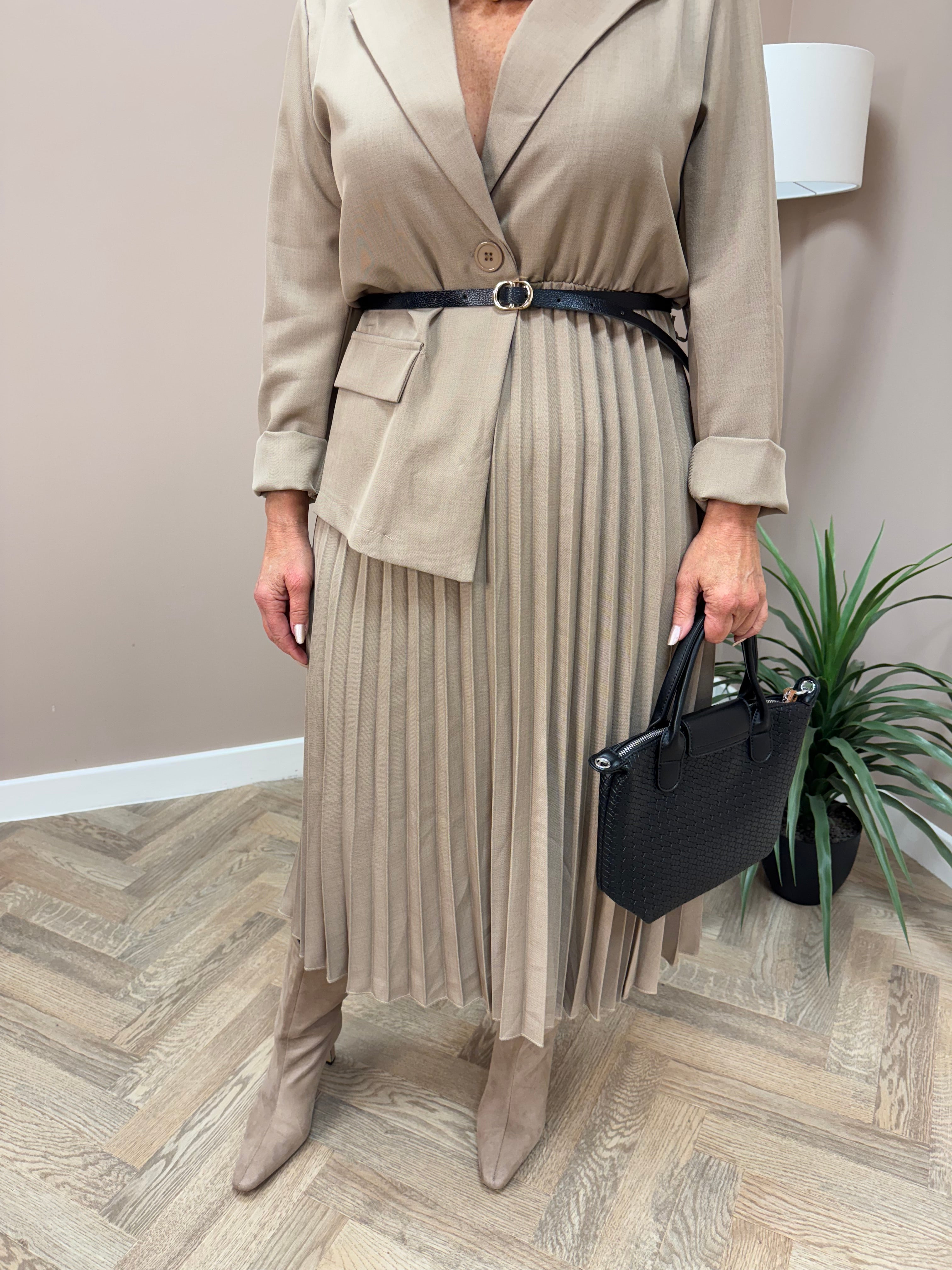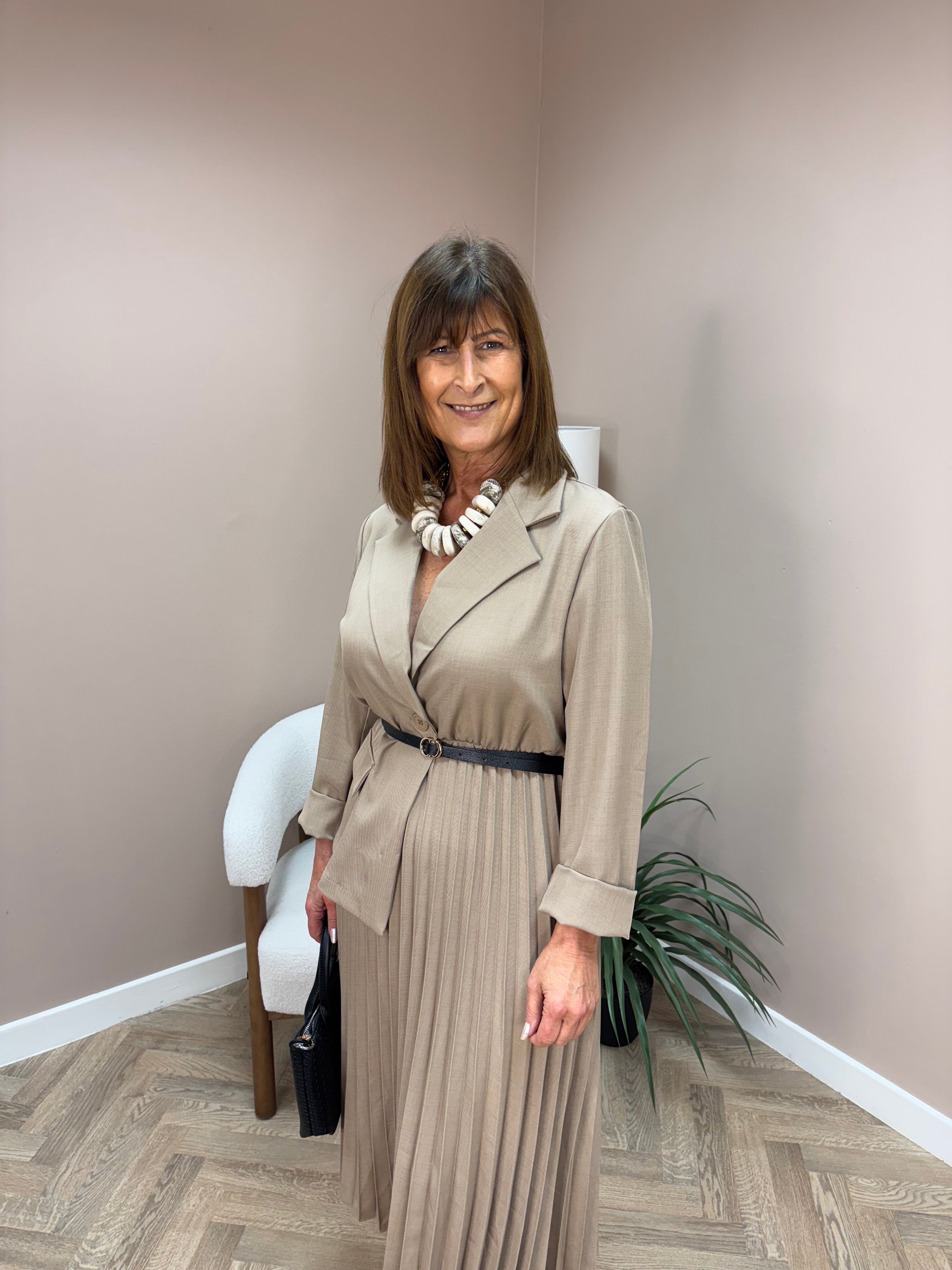 Elevate your wardrobe with the Beige Pleated Blazer Dress, combining sharp tailoring with feminine pleated details. Its rich brown tone adds warmth and versatility, perfect for both professional settings and stylish evenings. Designed to flatter your silhouette, this dress offers a comfortable fit while making a confident statement. Ideal for those who want to blend classic blazer sophistication with a modern, elegant twist.