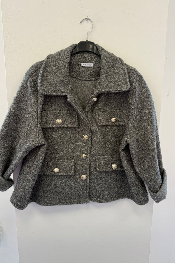 This Italian-crafted short boucle knit jacket embodies classic sophistication. Cut to a chic cropped silhouette, it’s detailed with gleaming gold buttons that add a luxurious finish. Designed with four elegant faux pockets and long sleeves, it offers the perfect balance of style and versatility. A polished piece that layers seamlessly from day to evening.