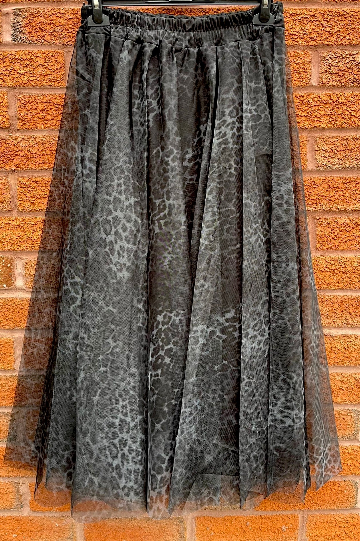 Black Grey Leopard Printed Tulle Maxi Skirt