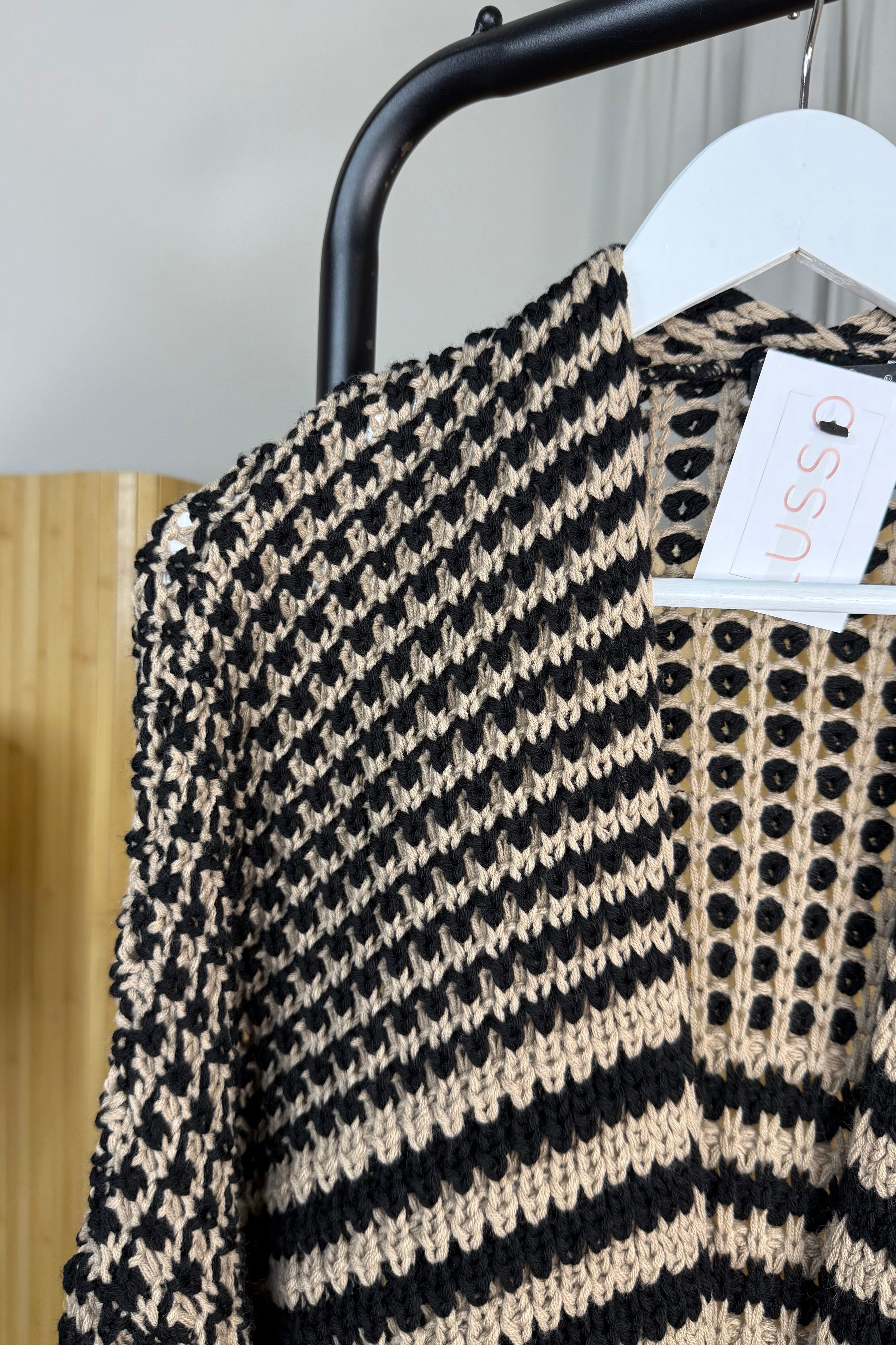 This chunky crochet cardigan is your new go-to for effortless style and comfort. The striking black and mocha design brings personality to every outfit, whilst the hip-length cut offers a flattering silhouette. Throw it on for instant cosiness and undeniable charm because looking good shouldn't feel like hard work.