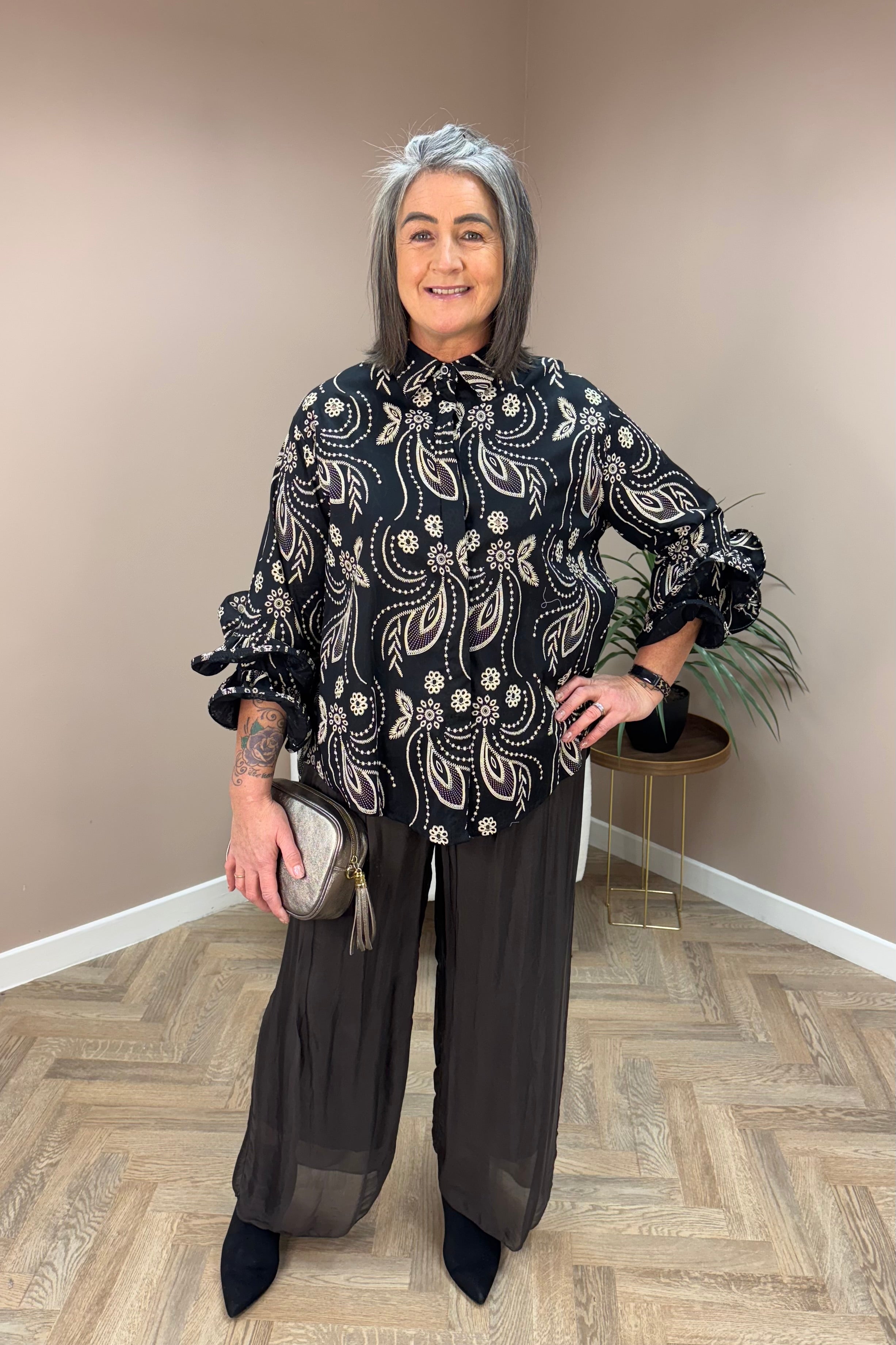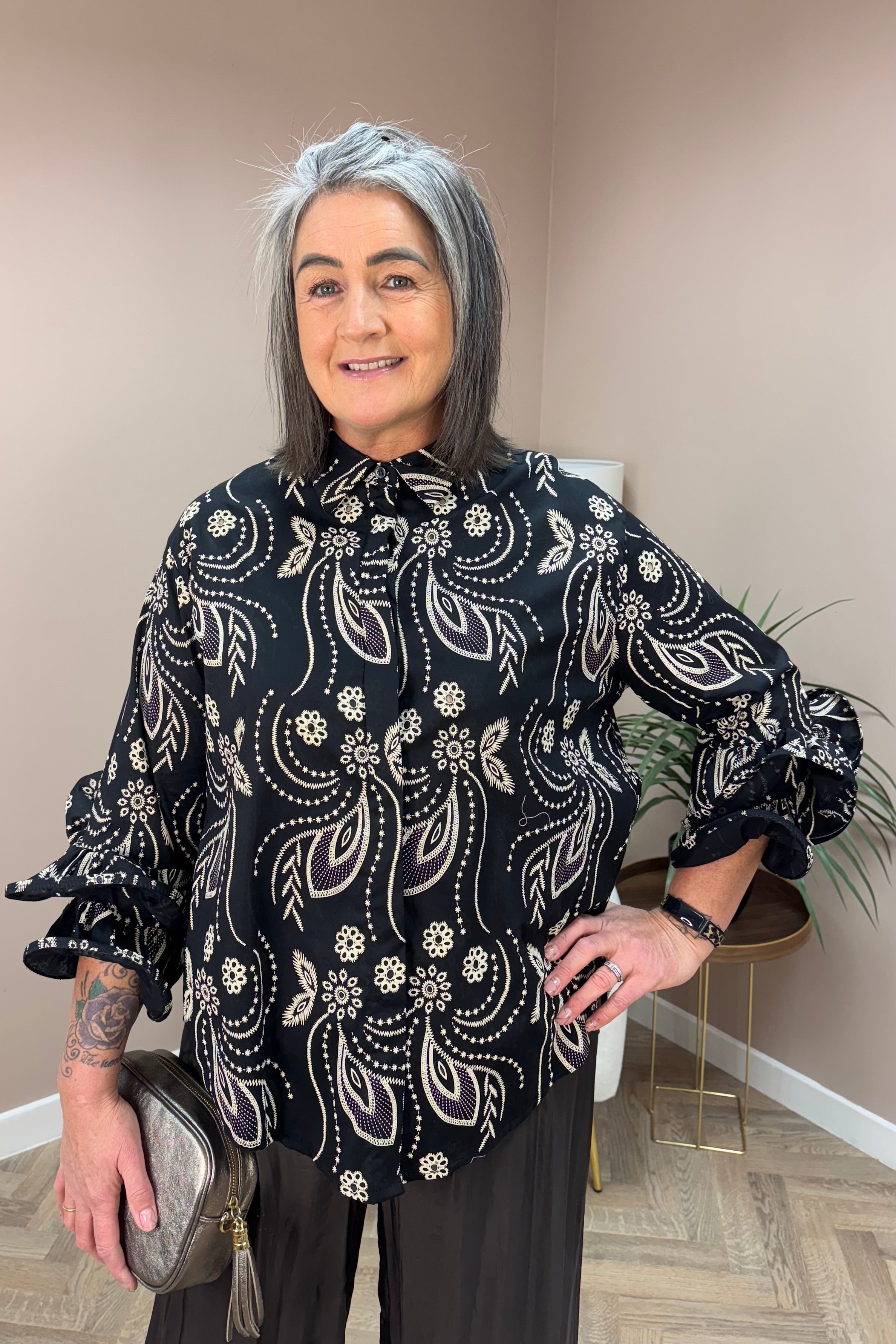 Make a bold impression with the Black Printed Statement Sleeve Blouse. Its vivid boho floral design and eye-catching sleeves create the perfect look for special occasions where you want to stand out with confidence and style.