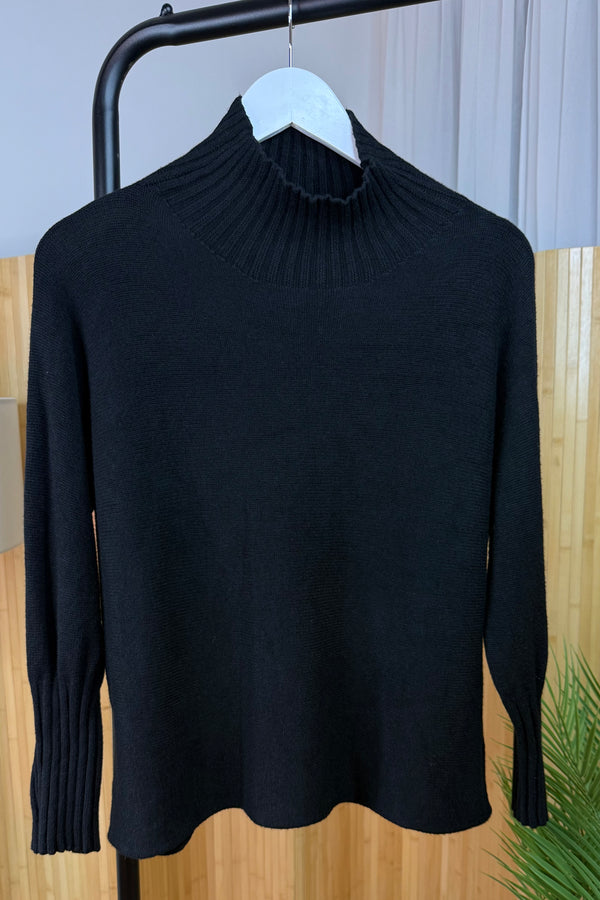 Black Ribby Knit Jumper. This cosy high-neck design delivers warmth without the bulk, while tapered ribbed sleeves add a touch of refined structure. Perfect for layering or wearing solo, it's the kind of piece that feels as good as it looks effortlessly chic for any season.