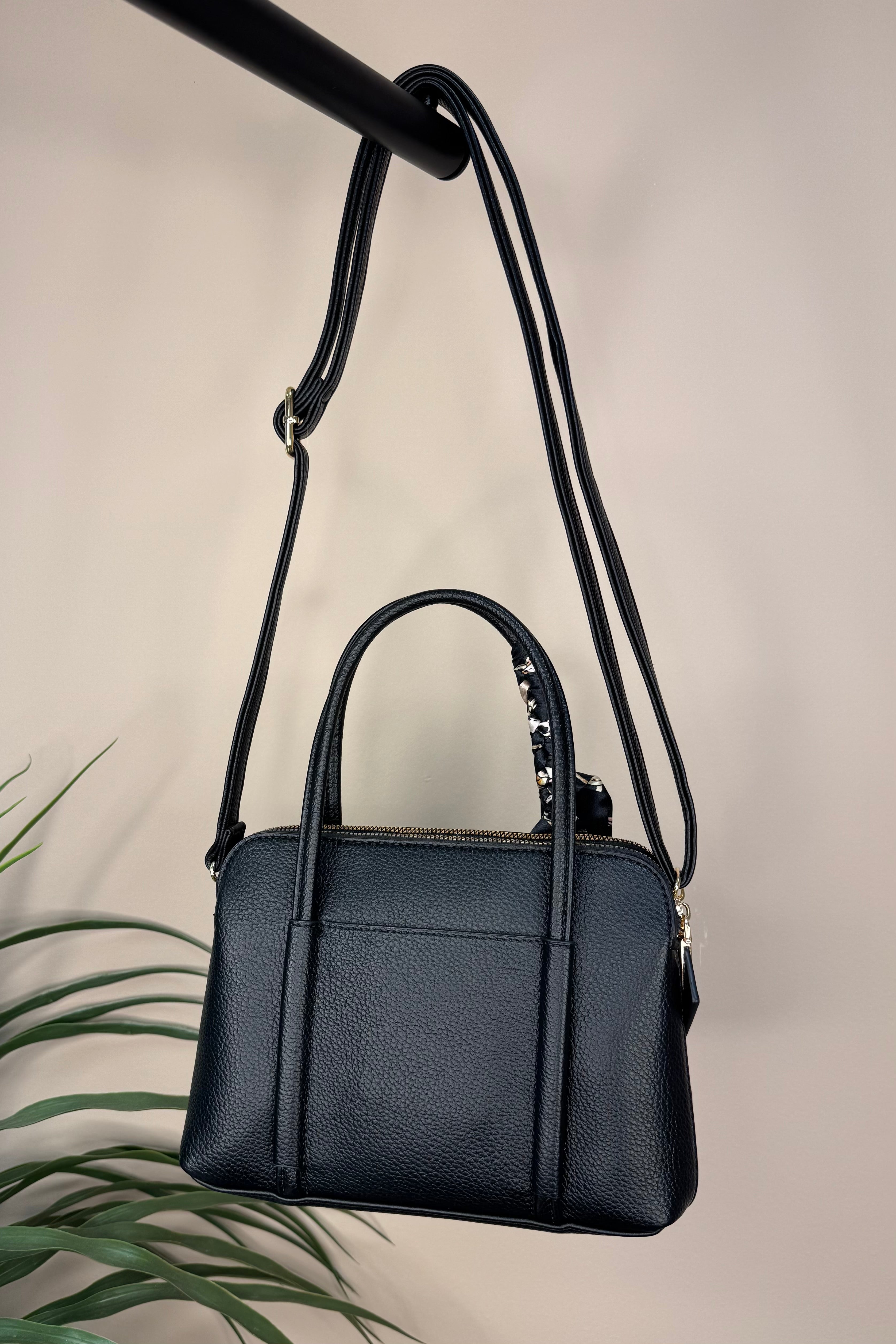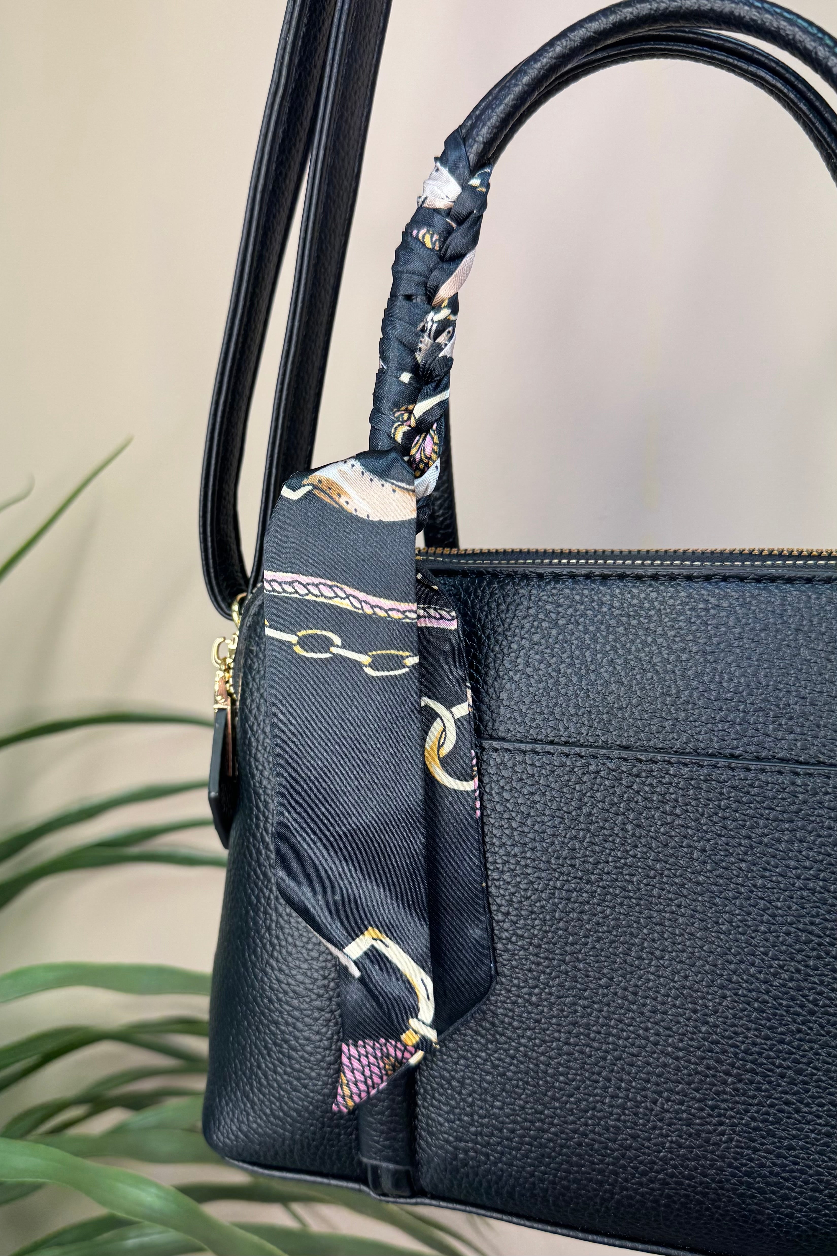 The Black Silk Tie Handbag is a stylish and practical addition to your wardrobe essentials. It offers two zippered compartments and a handy side pockets to keep your items organised. Designed with large handles for easy carrying and a crossbody strap for versatility, it adapts to your daily needs. Finished with a luxurious silk tie featuring a chic chain design, this handbag combines elegance with everyday functionality.