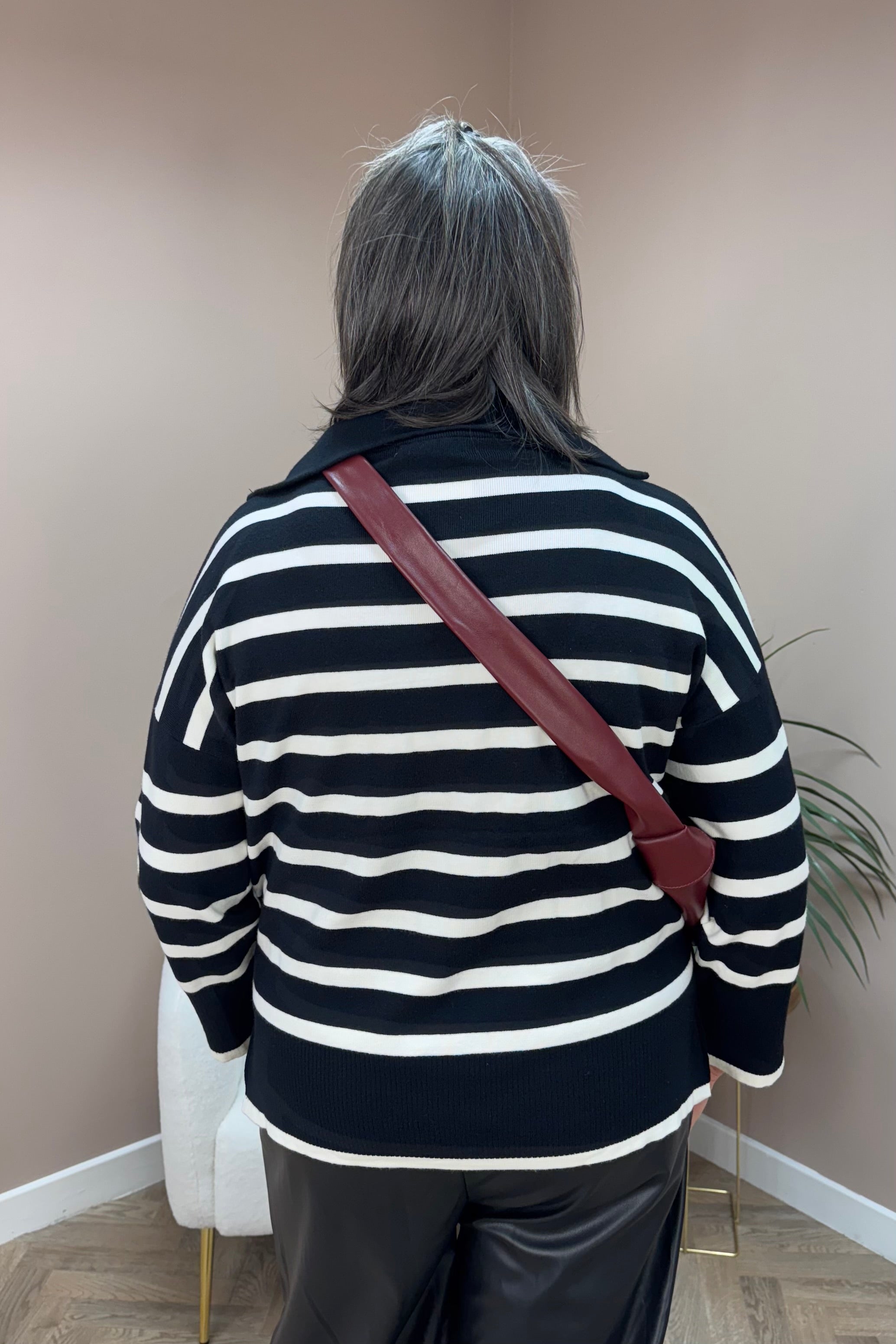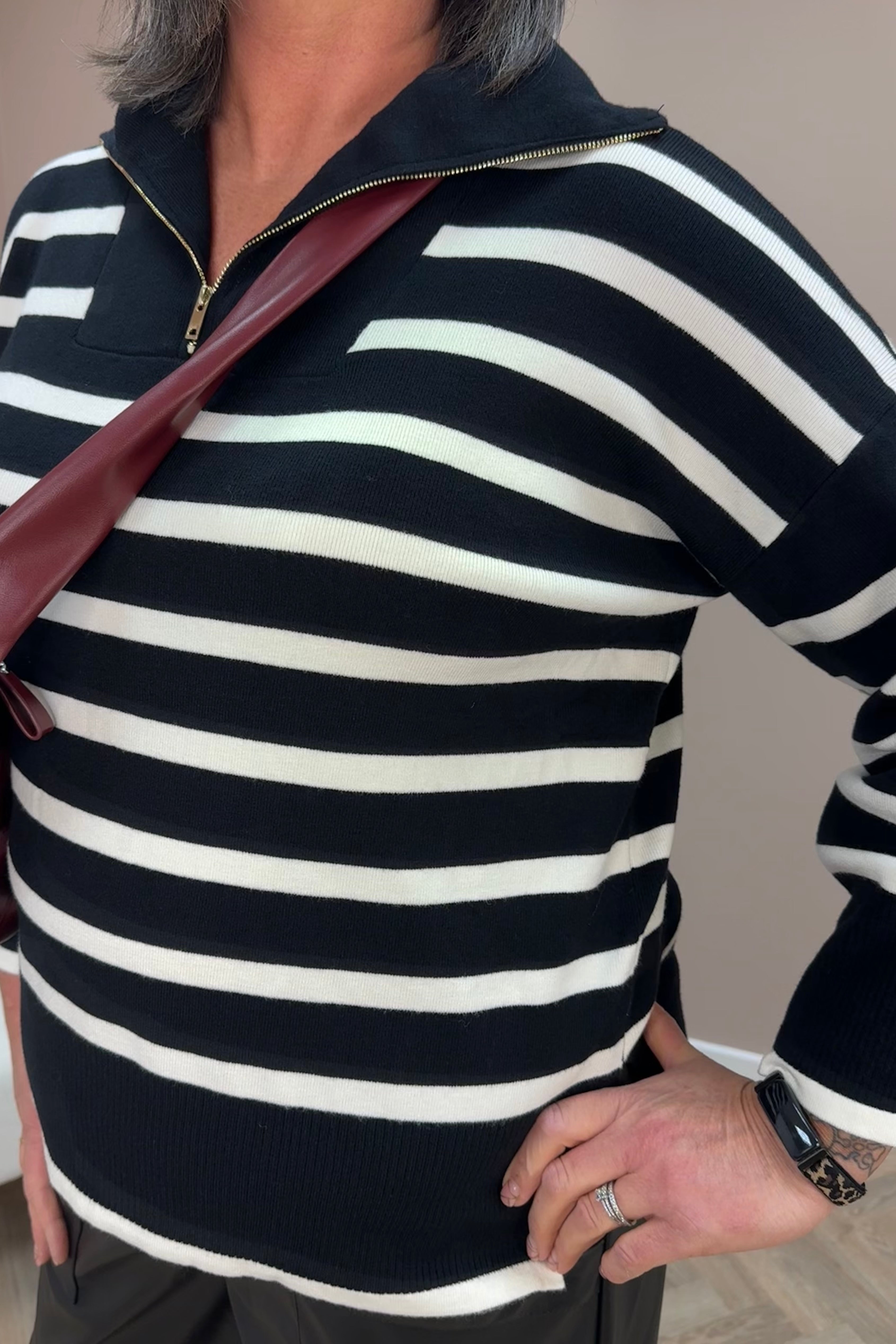This Black Striped Sweater offers both cozy comfort and stylish flair. The elegant gold zip detail adds a refined touch, making it perfect for dressing up or down. Soft and warm, it’s designed to keep you comfortable throughout your day while elevating your look with its classic stripes. A reliable wardrobe staple that supports your style with ease.