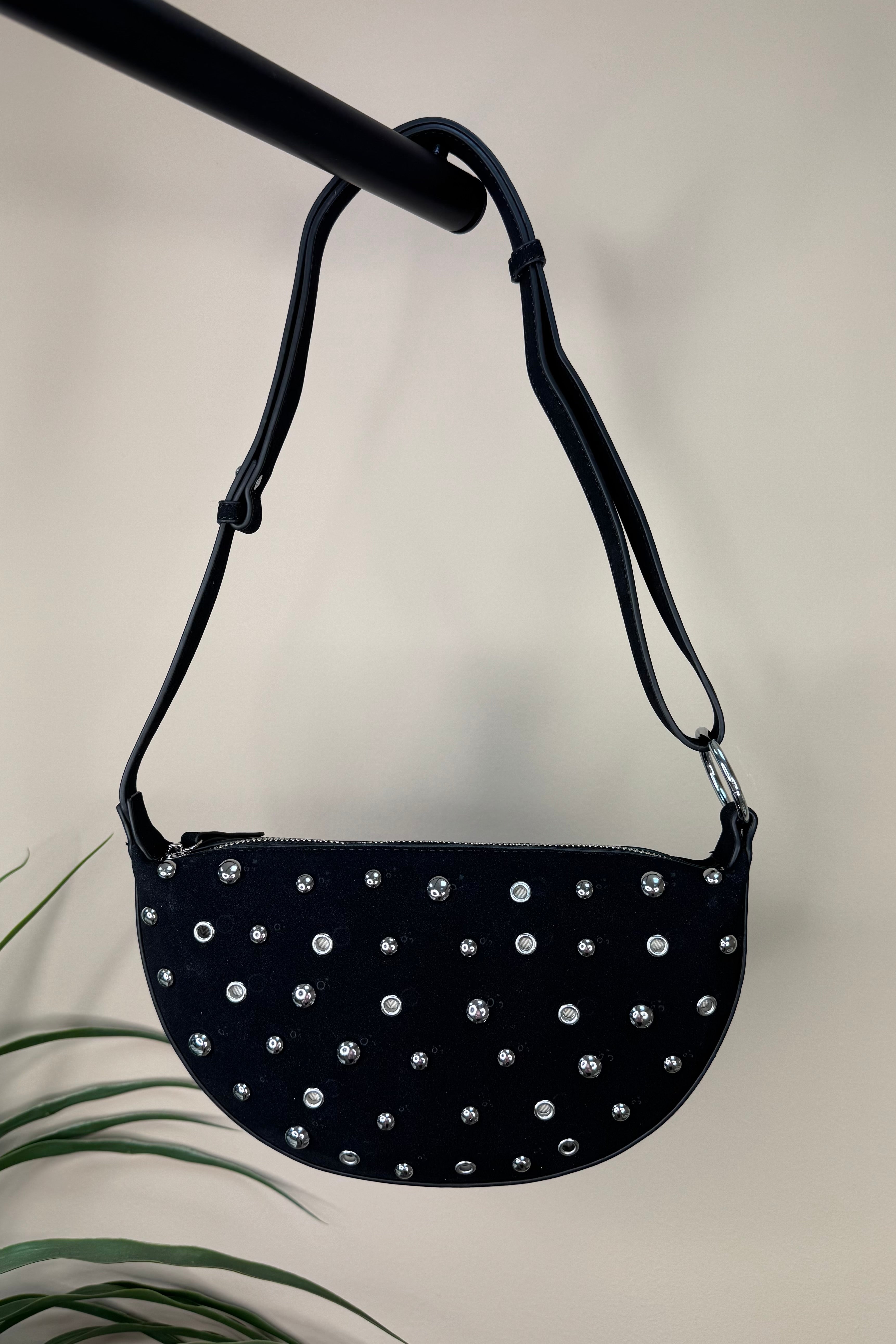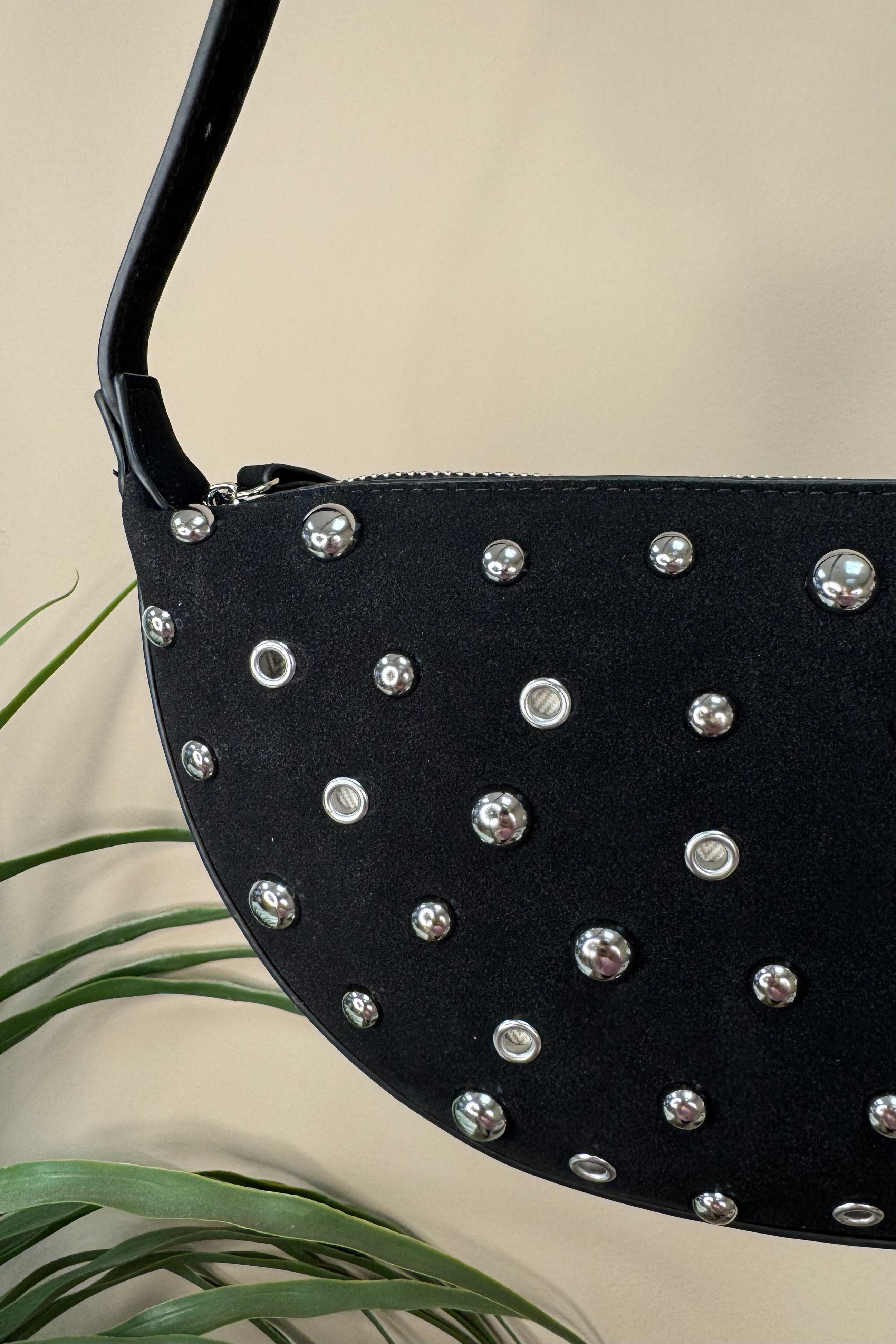 This sleek black suede shoulder bag is the daring choice for carrying your essentials. Its compact size keeps your must-haves close, while the striking silver studs add an edgy, confident touch to any outfit. Perfect for making a bold statement wherever you go.