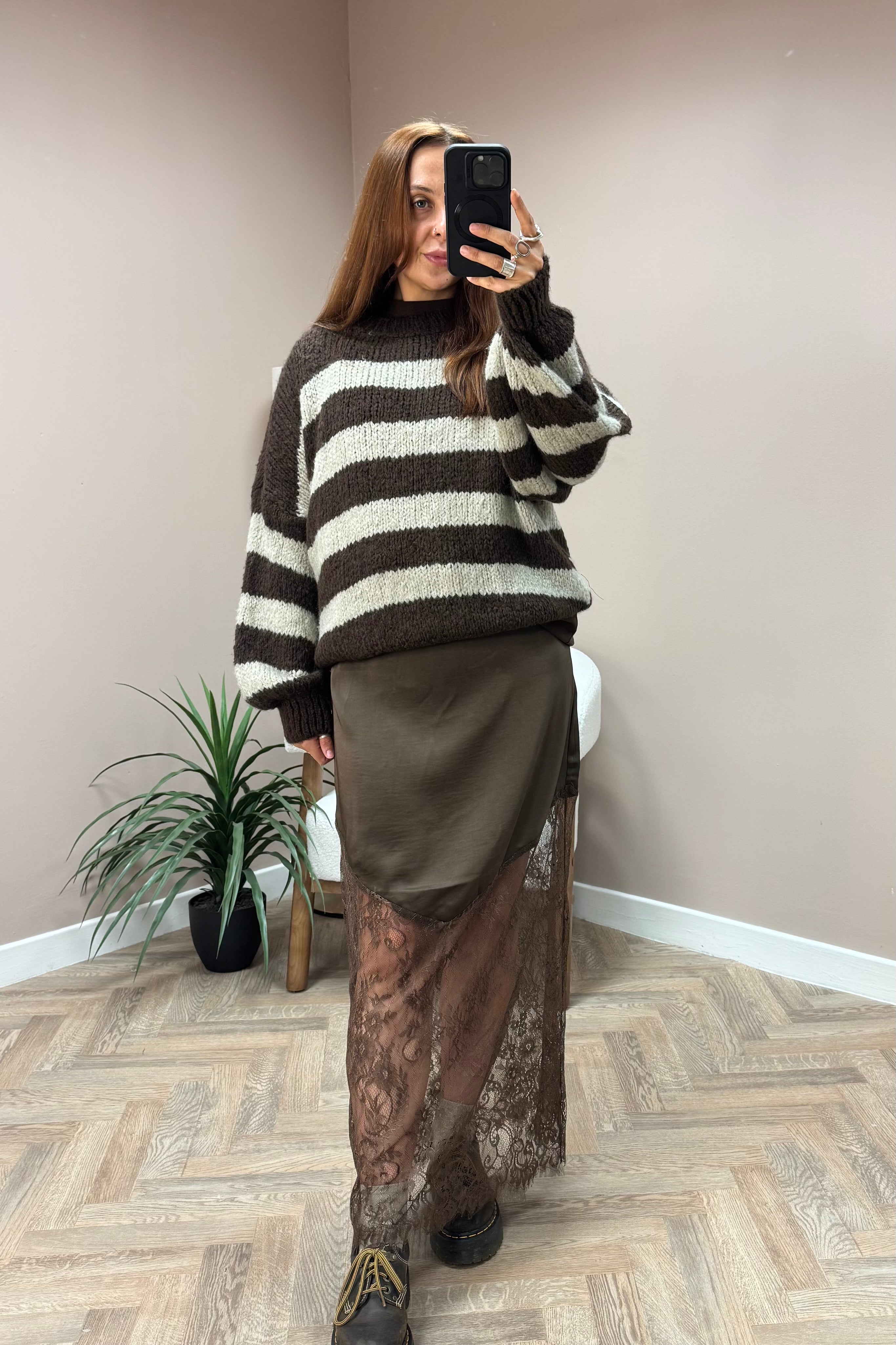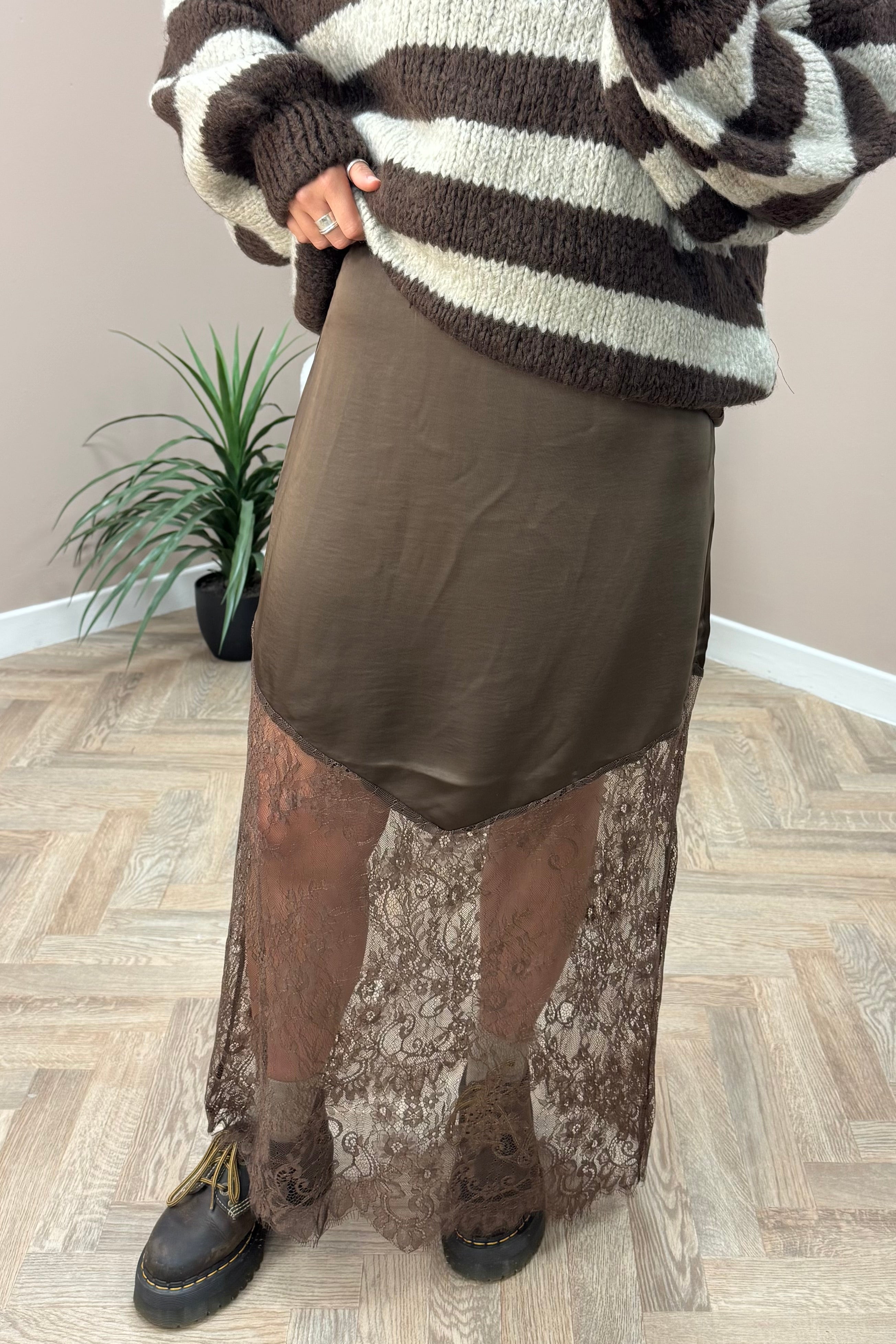 Brown Lace Trim Satin Skirt