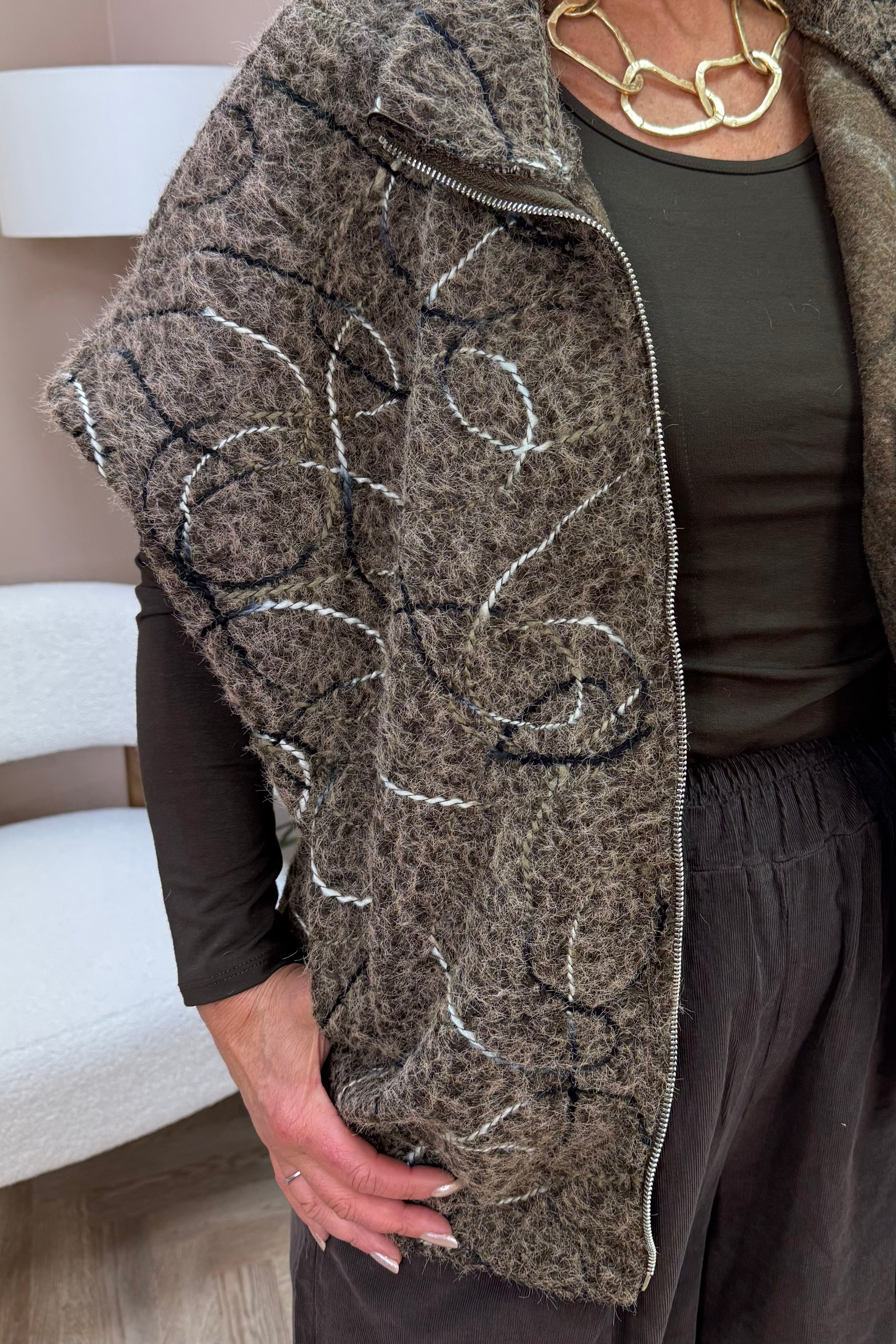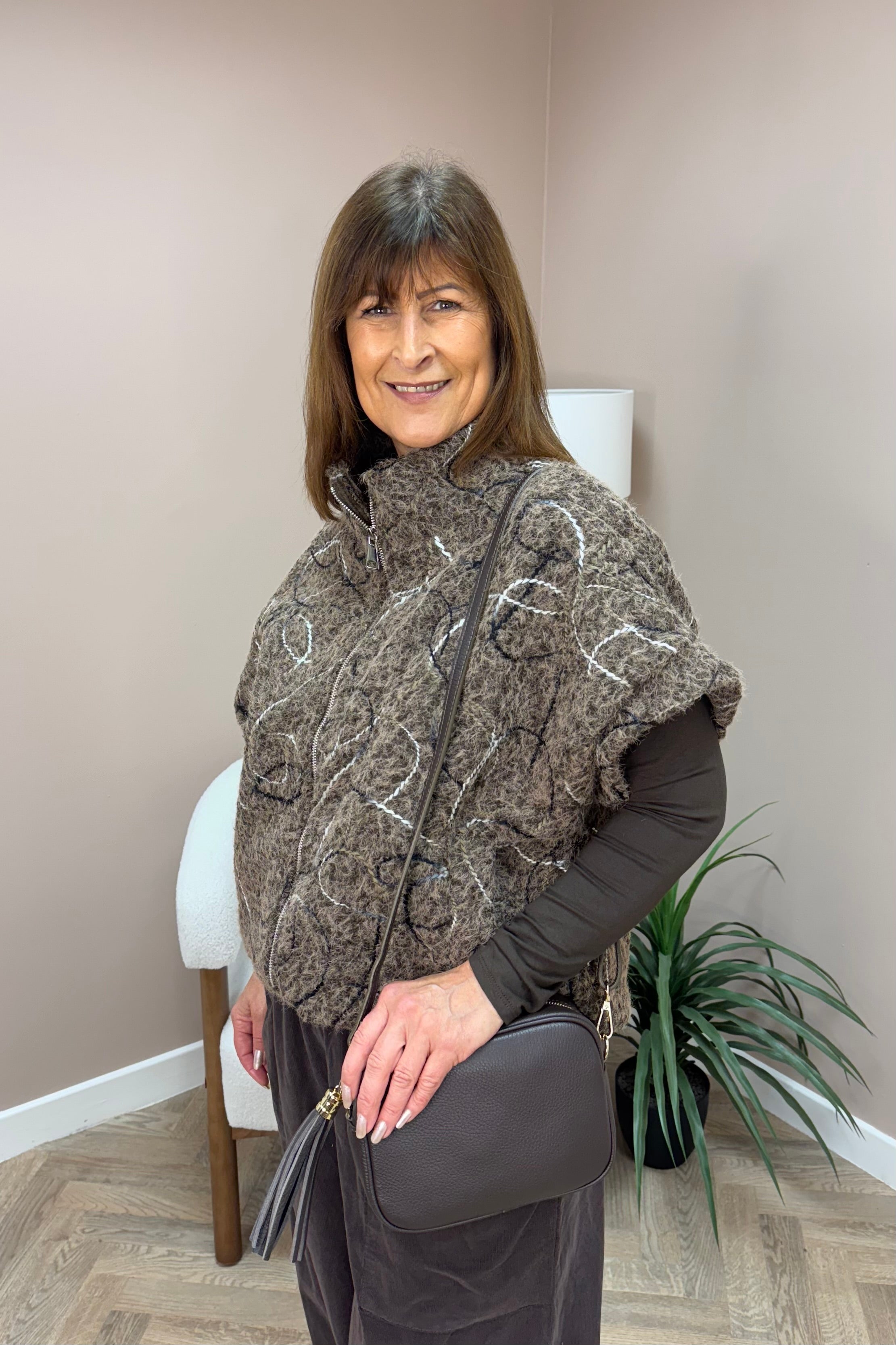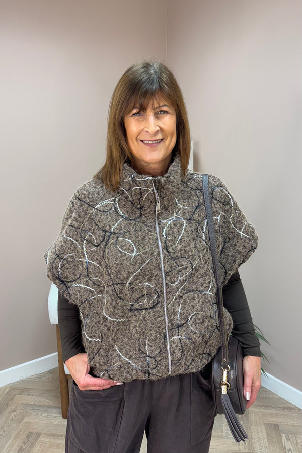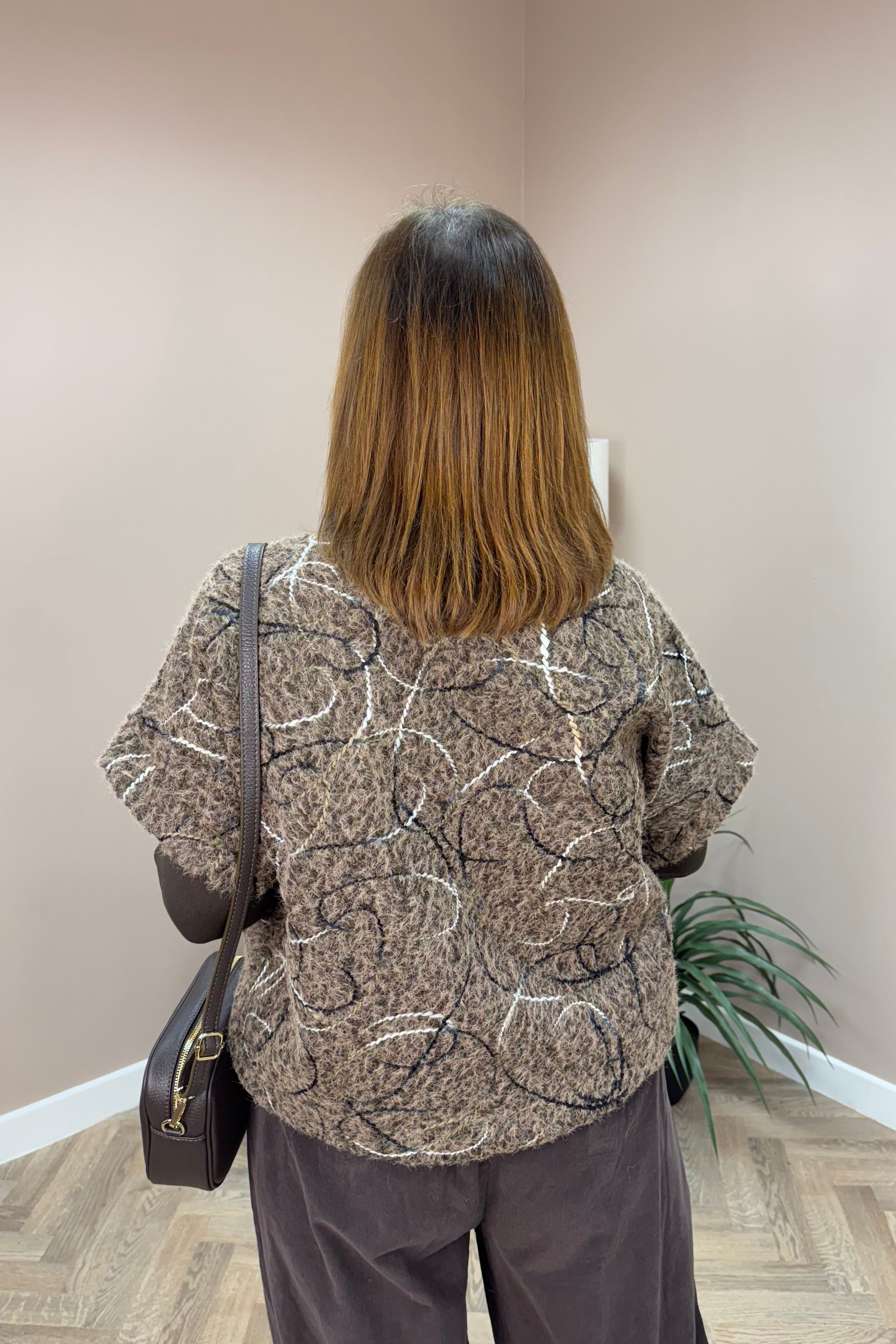 Add a fun twist to your wardrobe with the Brown Short Sleeve Swirl Jacket. Featuring a boxy fit and lively swirl pattern, this jacket brings playful charm to any outfit. The high neck offers a cosy touch, while the soft fabric makes it a joy to wear all day long. Perfect for layering and making a statement with ease!