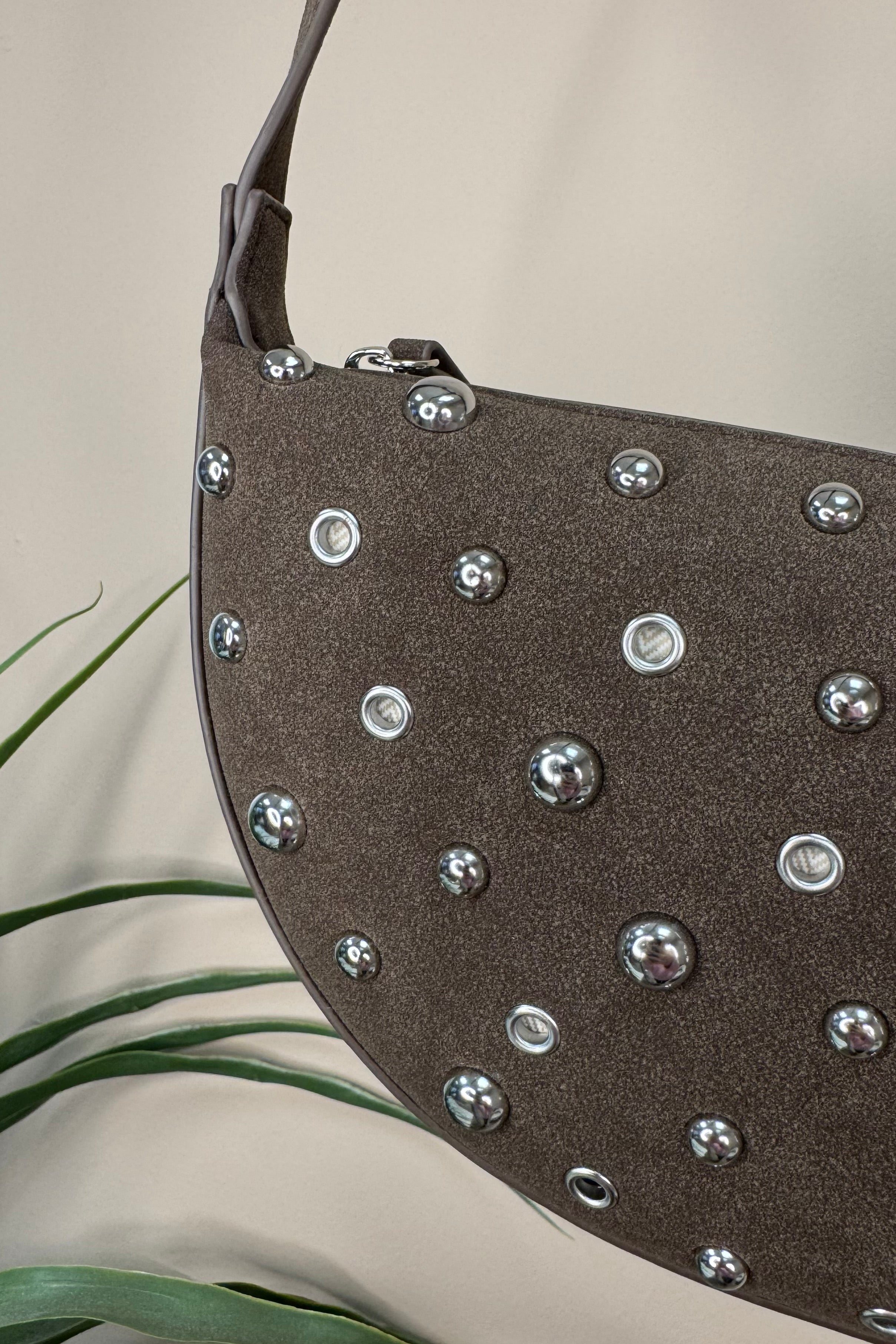This sleek brown suede shoulder bag is the daring choice for carrying your essentials. Its compact size keeps your must-haves close, while the striking silver studs add an edgy, confident touch to any outfit. Perfect for making a bold statement wherever you go.