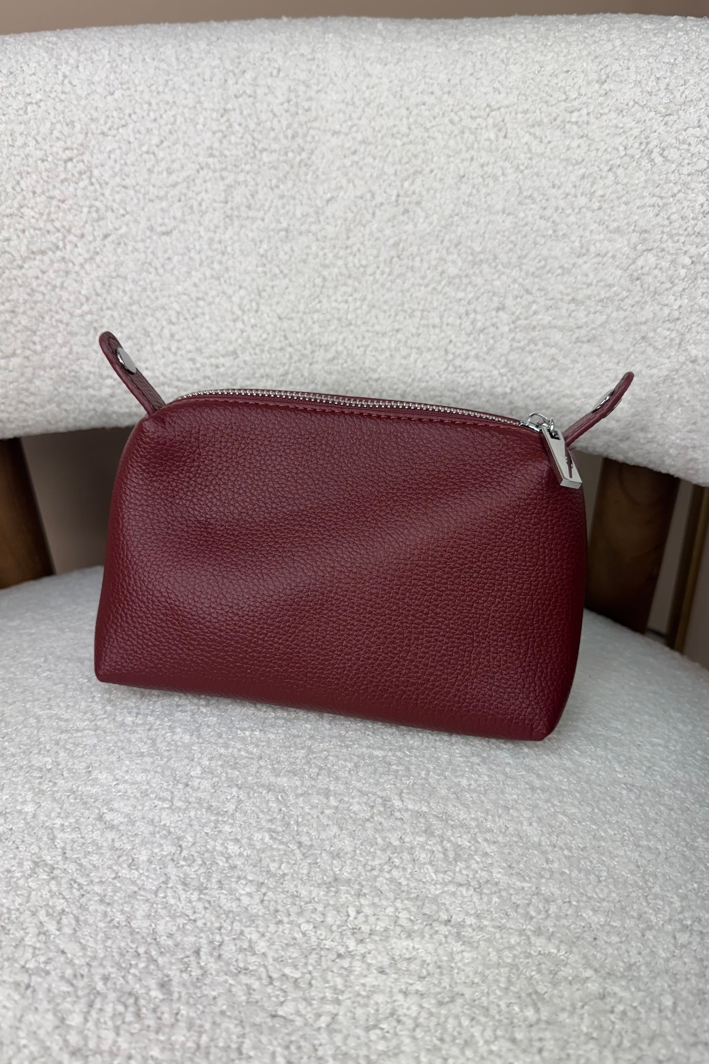 The Burgundy Bucket Bag features a stylish chain handle and versatile crossbody wear for comfortable, hands-free use. A detachable centre pouch lets you keep your essentials organised, making this bag both practical and chic for any occasion.