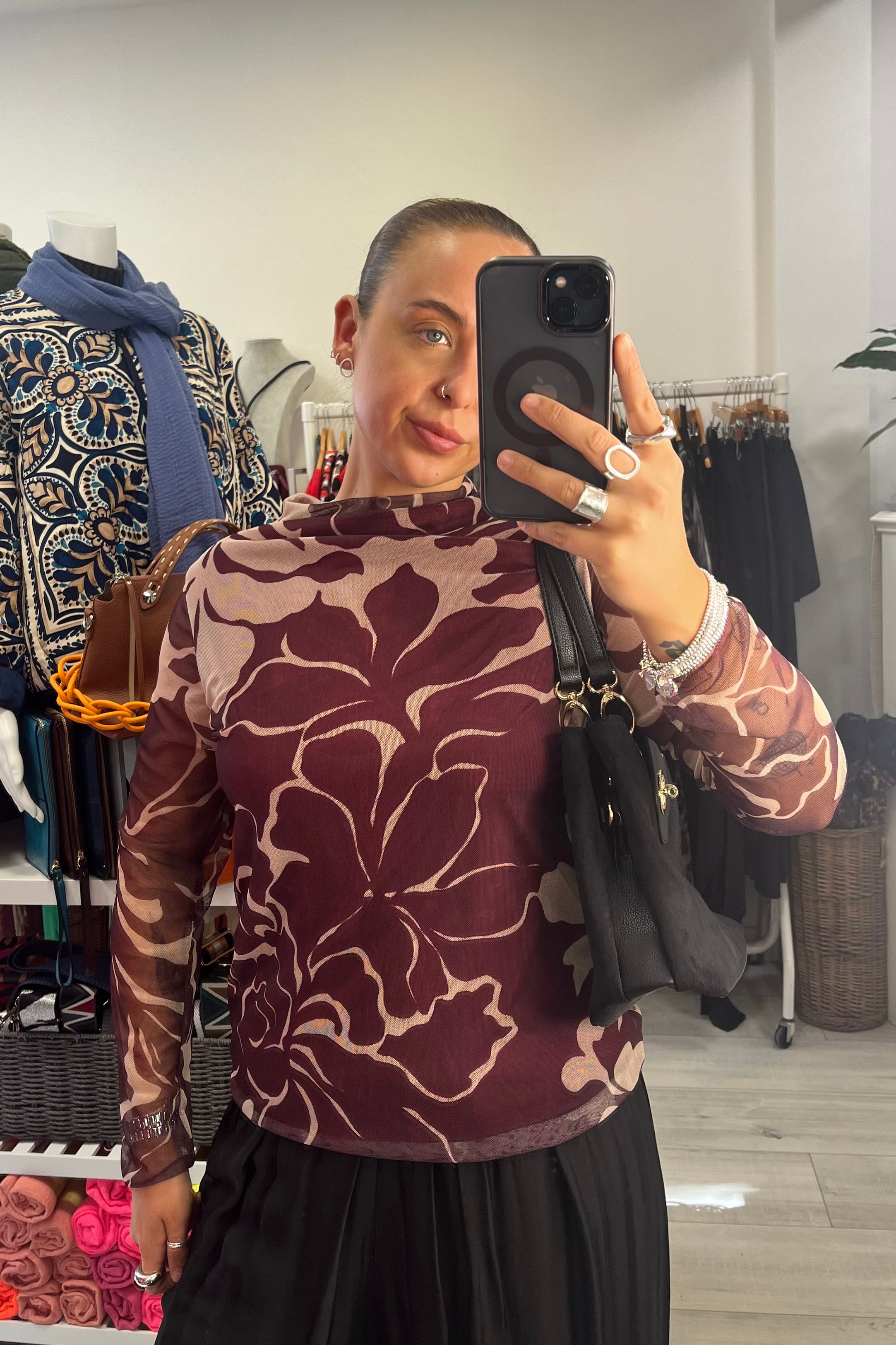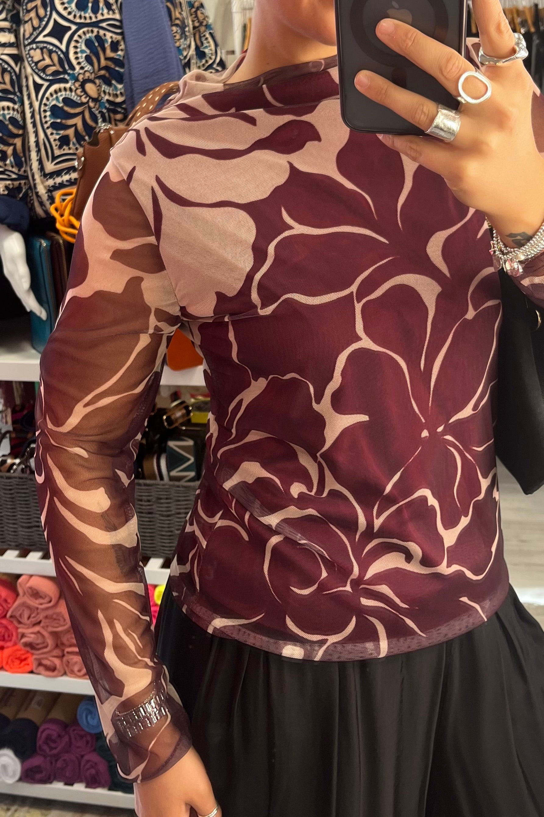 Burgundy Lined Flower Printed Mesh Top