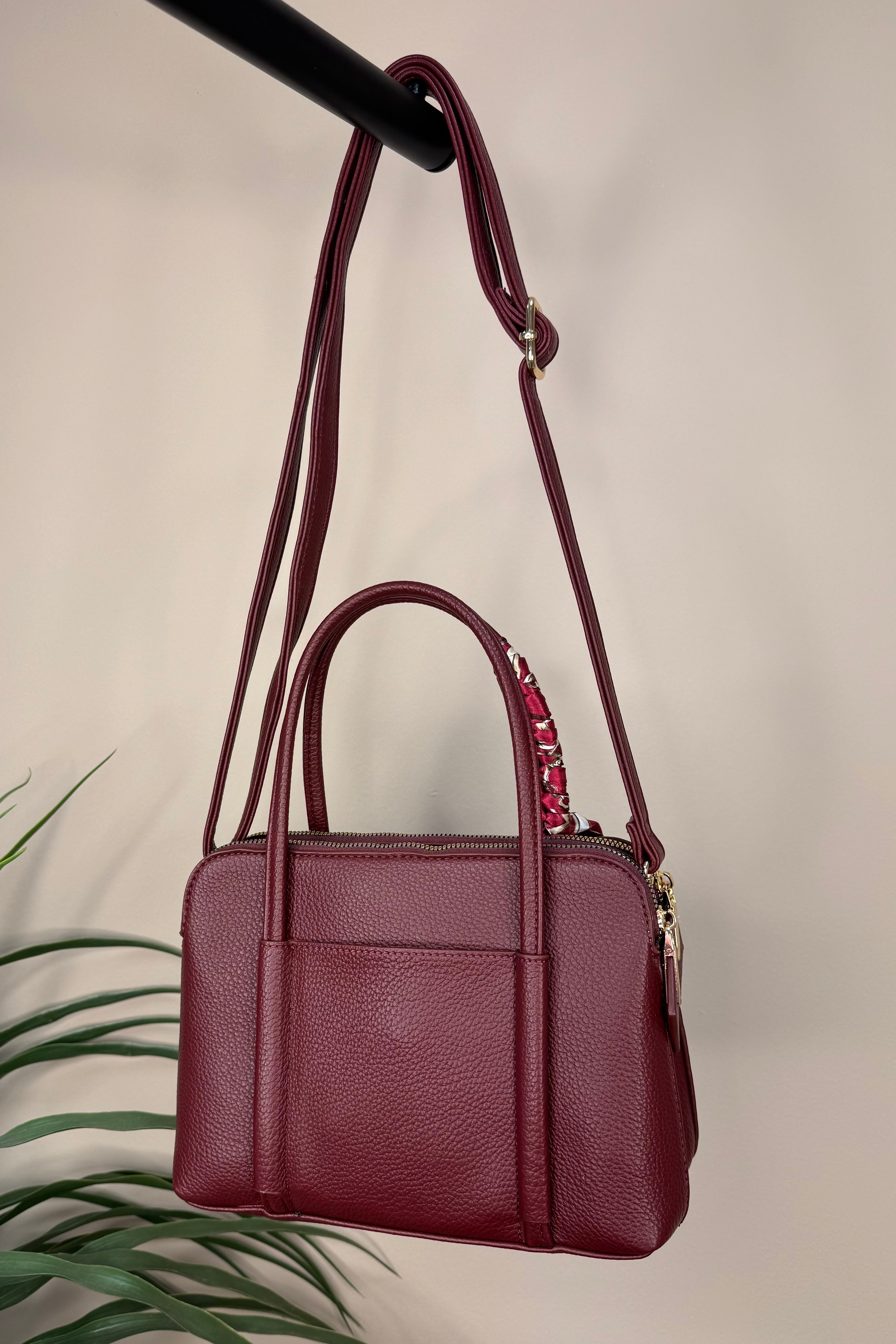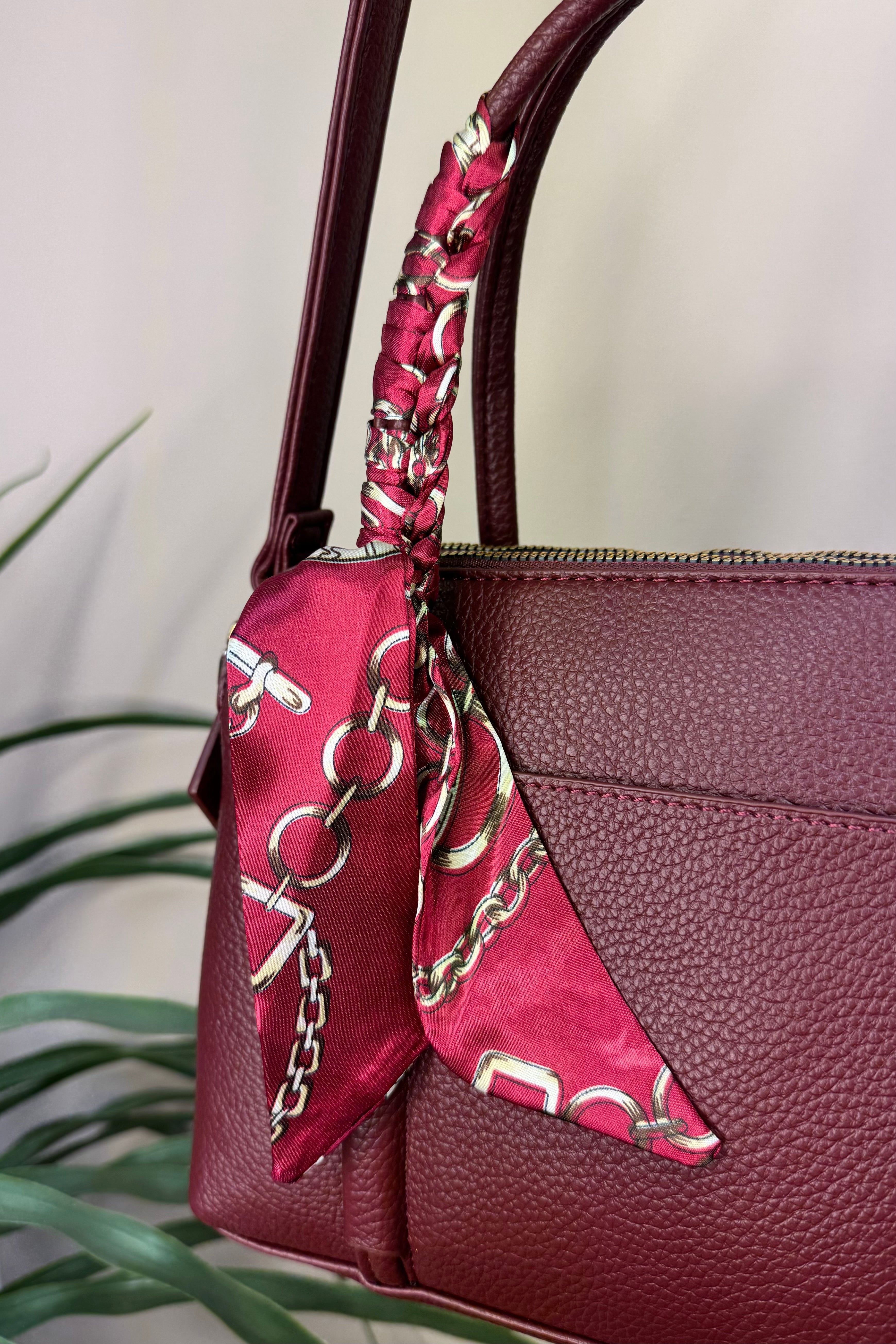 The Burgundy Silk Tie Handbag is a stylish and practical addition to your wardrobe essentials. It offers two zippered compartments and a handy side pockets to keep your items organised. Designed with large handles for easy carrying and a crossbody strap for versatility, it adapts to your daily needs. Finished with a luxurious silk tie featuring a chic chain design, this handbag combines elegance with everyday functionality.