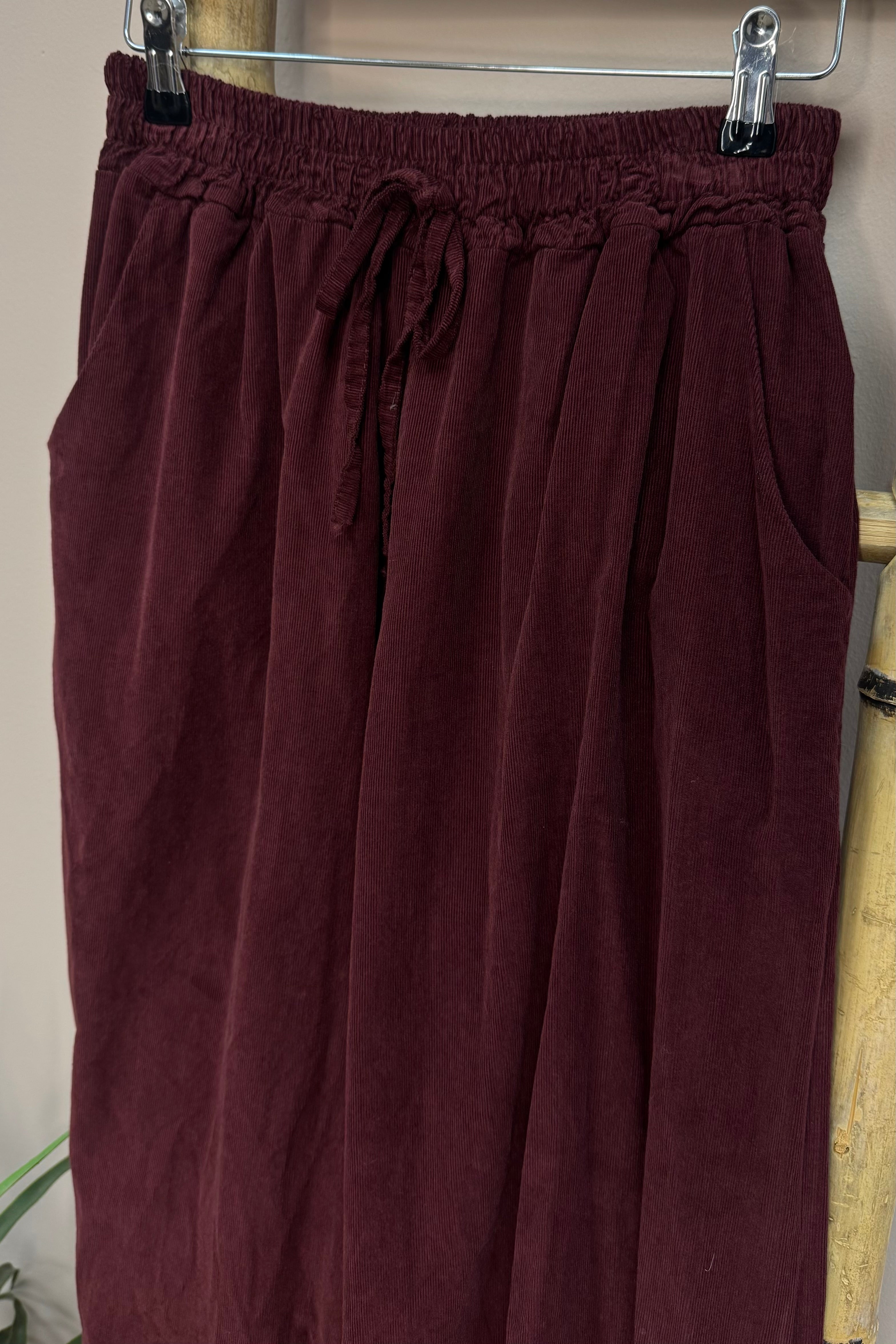 Step up your style game with these Burgundy Wide Leg Needle Cord Trousers. Featuring a stretchy waistband and a faux tie front, they offer comfort and a chic twist. Their wide-leg cut makes them the ideal wardrobe filler—perfect for layering and adding a pop of colour to any outfit. Playful, cosy, and effortlessly cool!