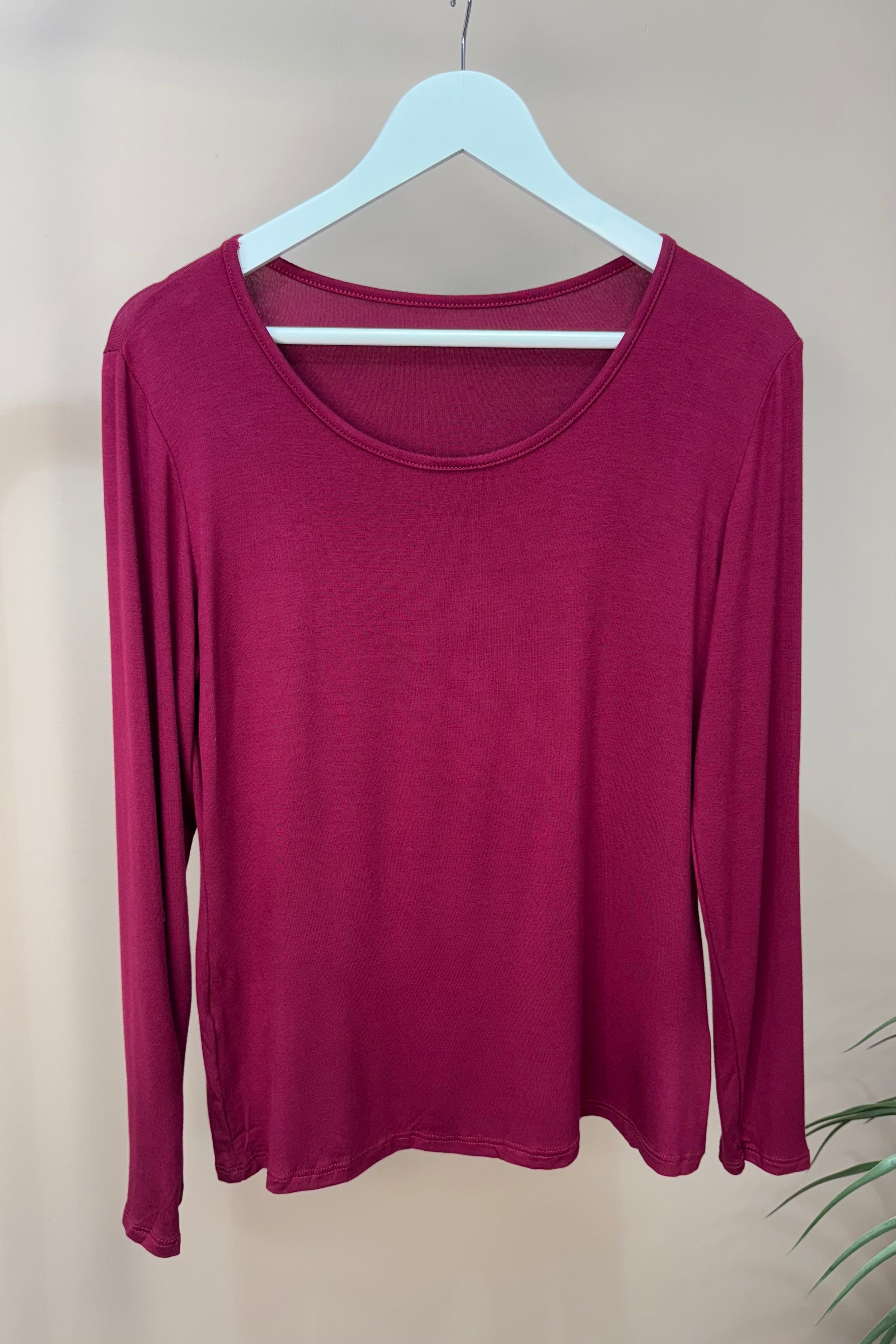 Elevate your wardrobe with this Burgundy Long Sleeve Layering Top, crafted for versatile sophistication. Its neutral tone and sleek design make it an essential piece to seamlessly layer under jackets or wear on its own, offering both comfort and understated elegance throughout the seasons.