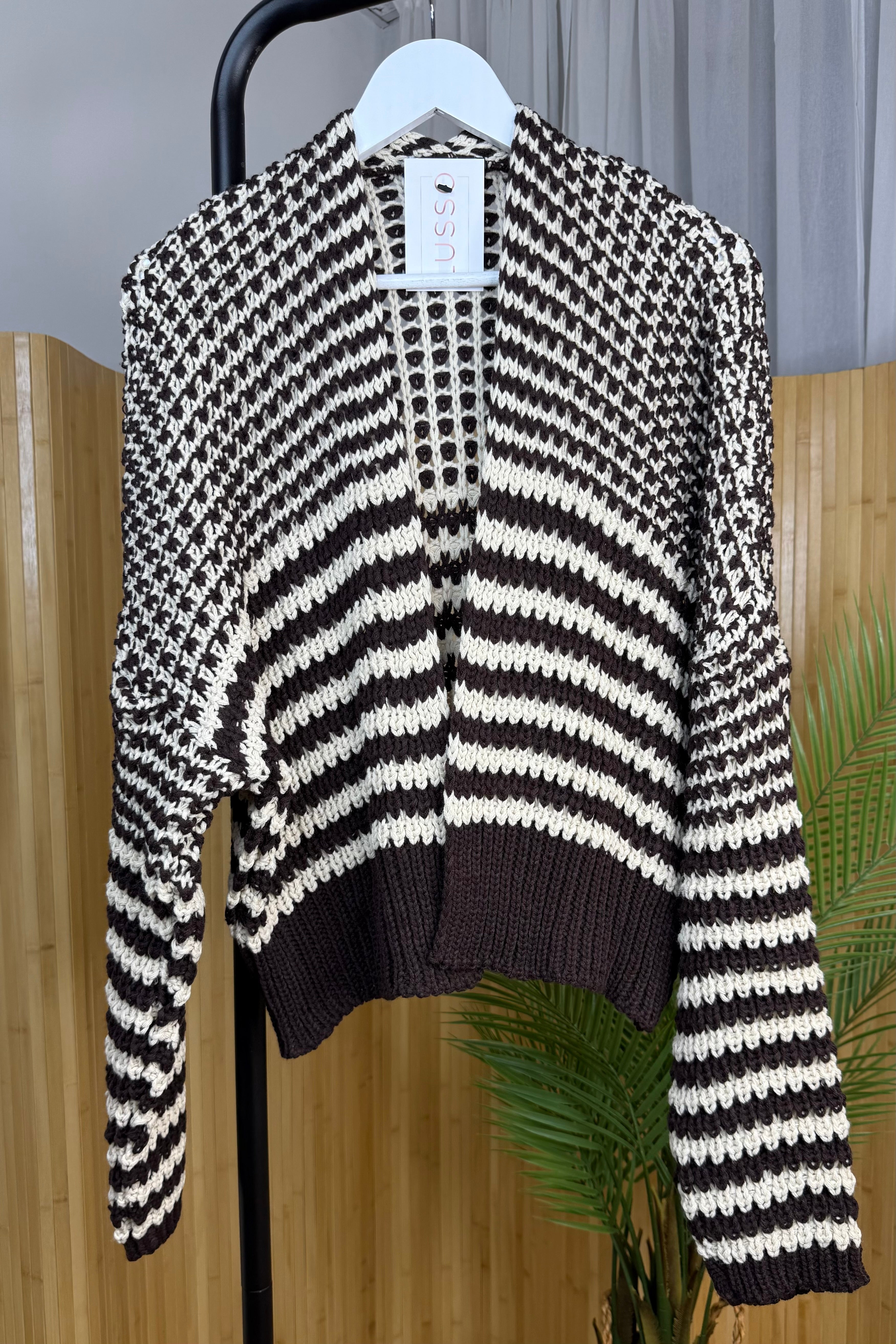 This chunky crochet cardigan is your new go-to for effortless style and comfort. The striking Chocolate Brown And Beige design brings personality to every outfit, whilst the hip-length cut offers a flattering silhouette. Throw it on for instant cosiness and undeniable charm because looking good shouldn't feel like hard work.