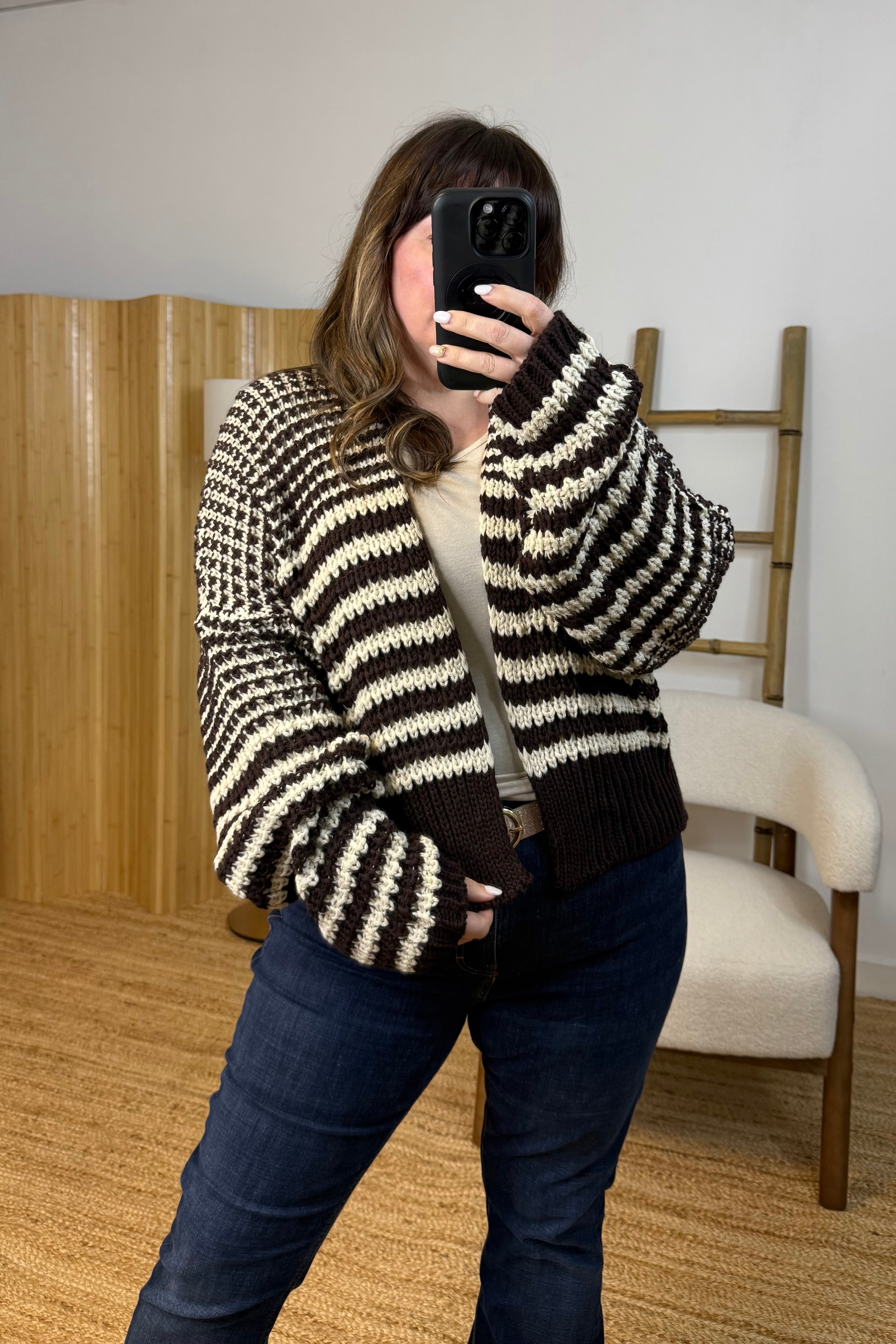 Chocolate Brown And Beige Chunky Balloon Sleeve Cardigan