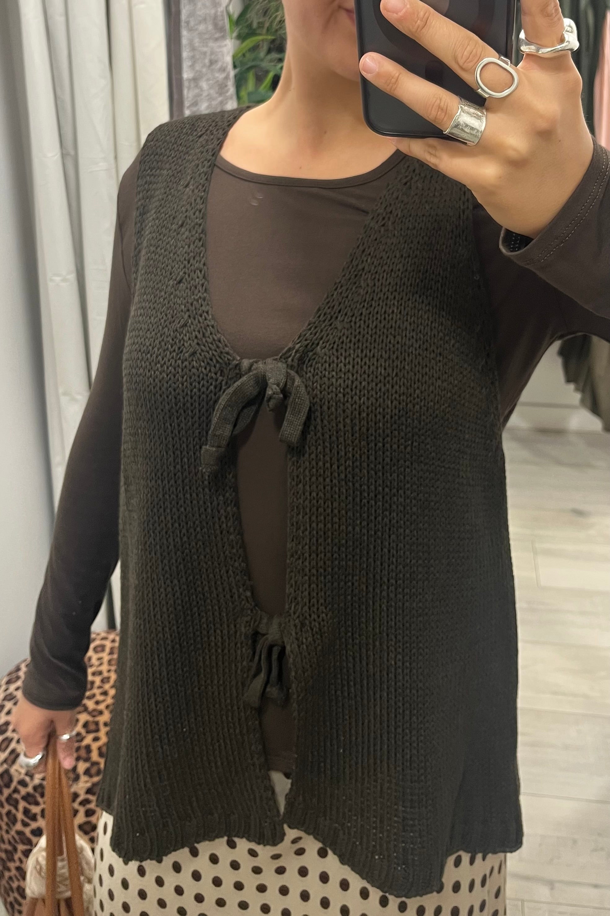 This Chocolate Knitted Tie Front Gilet brings a playful, cozy touch to any outfit. Made from soft knitted material, it’s perfect for layering on casual days out or adding a bit of charm when dressing up. The thick ties at the front let you style it open or closed, giving you versatile options to match your mood.