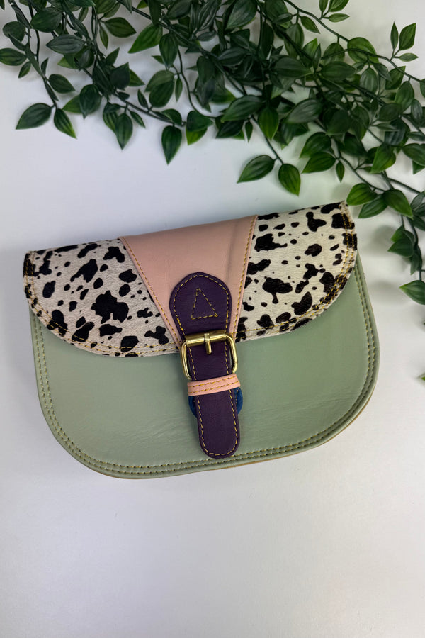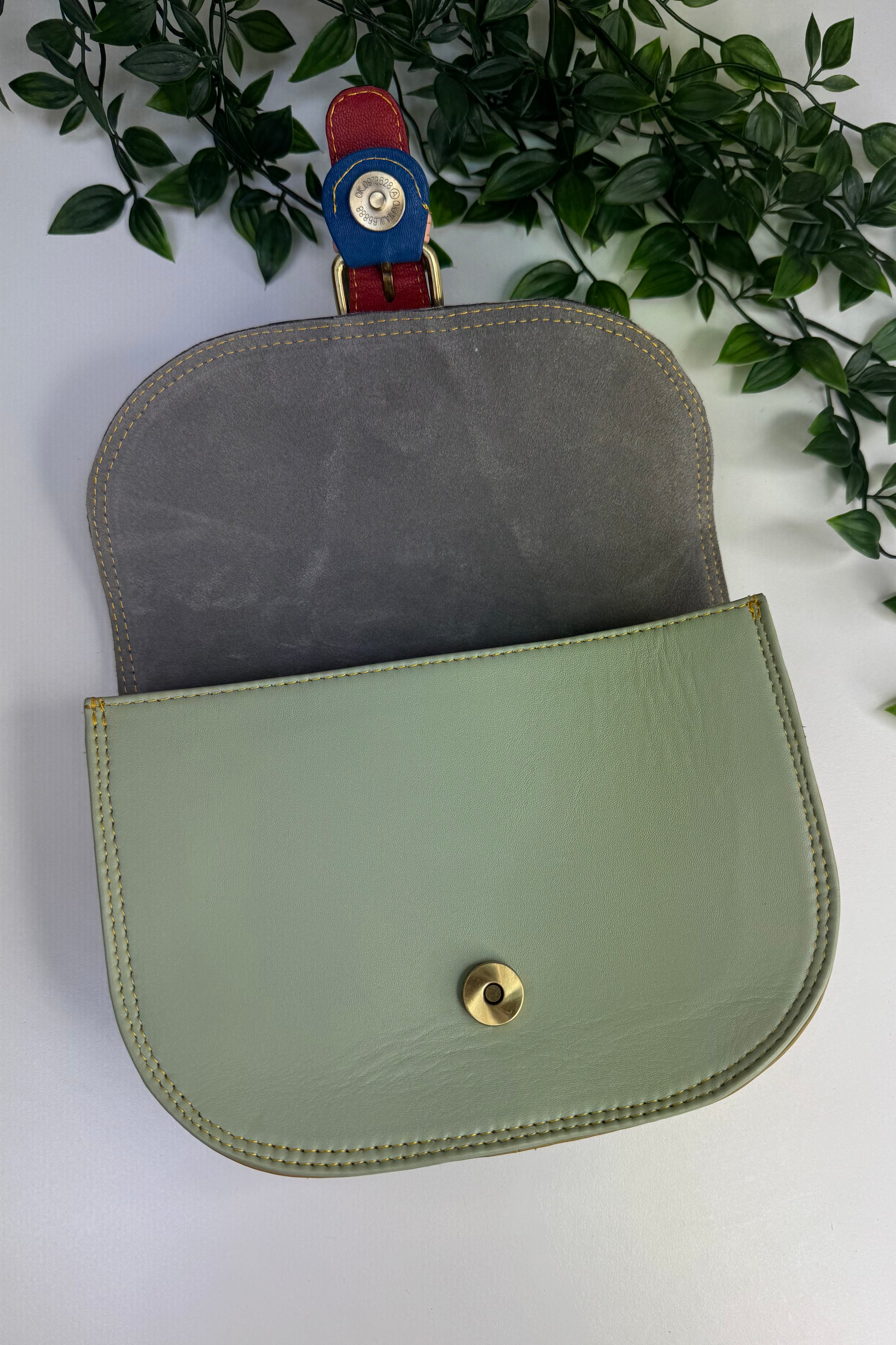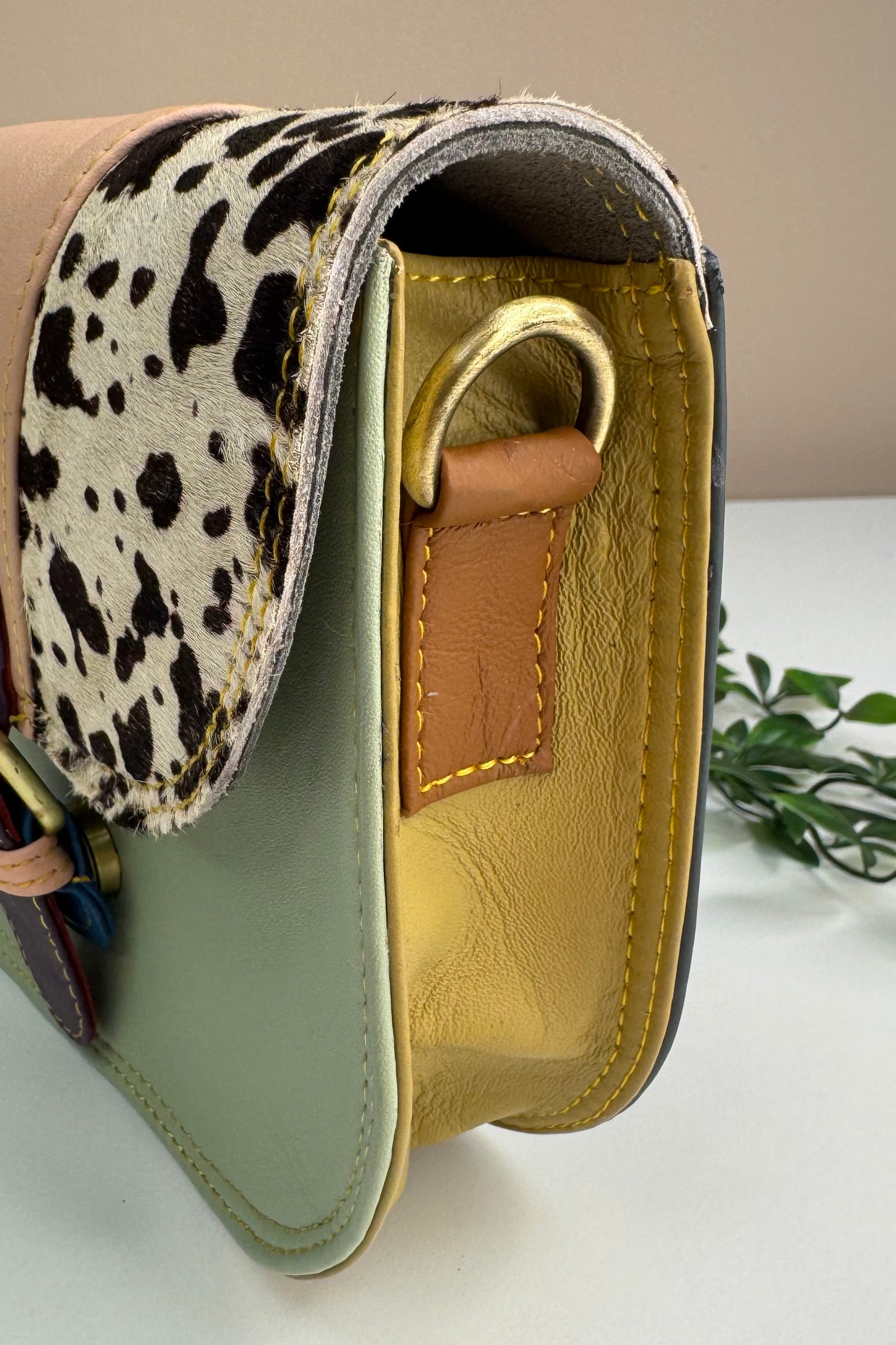 Made from recycled leather, each bag has its own unique natural marks that add charm and blend beautifully with the bright colours over time.