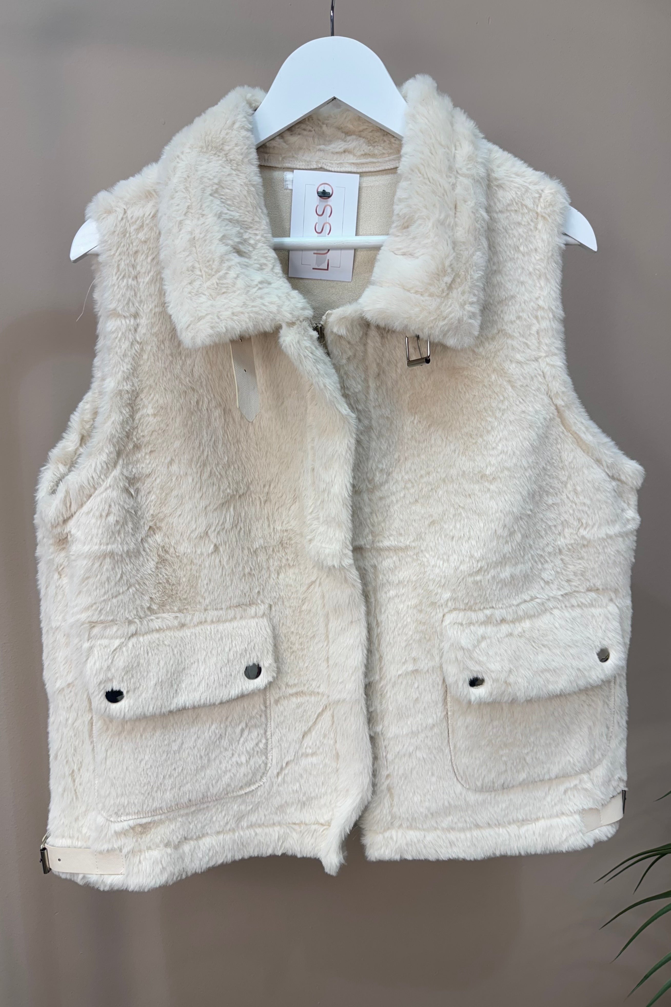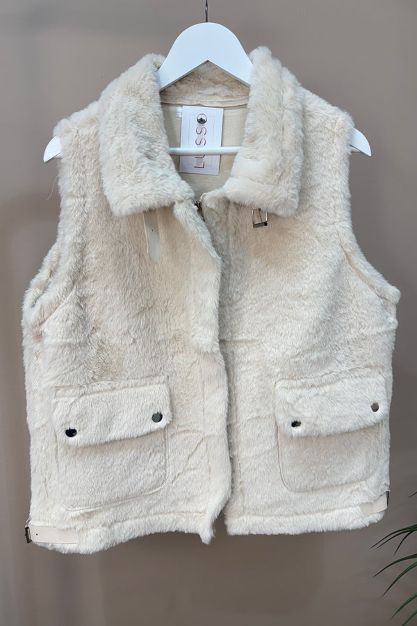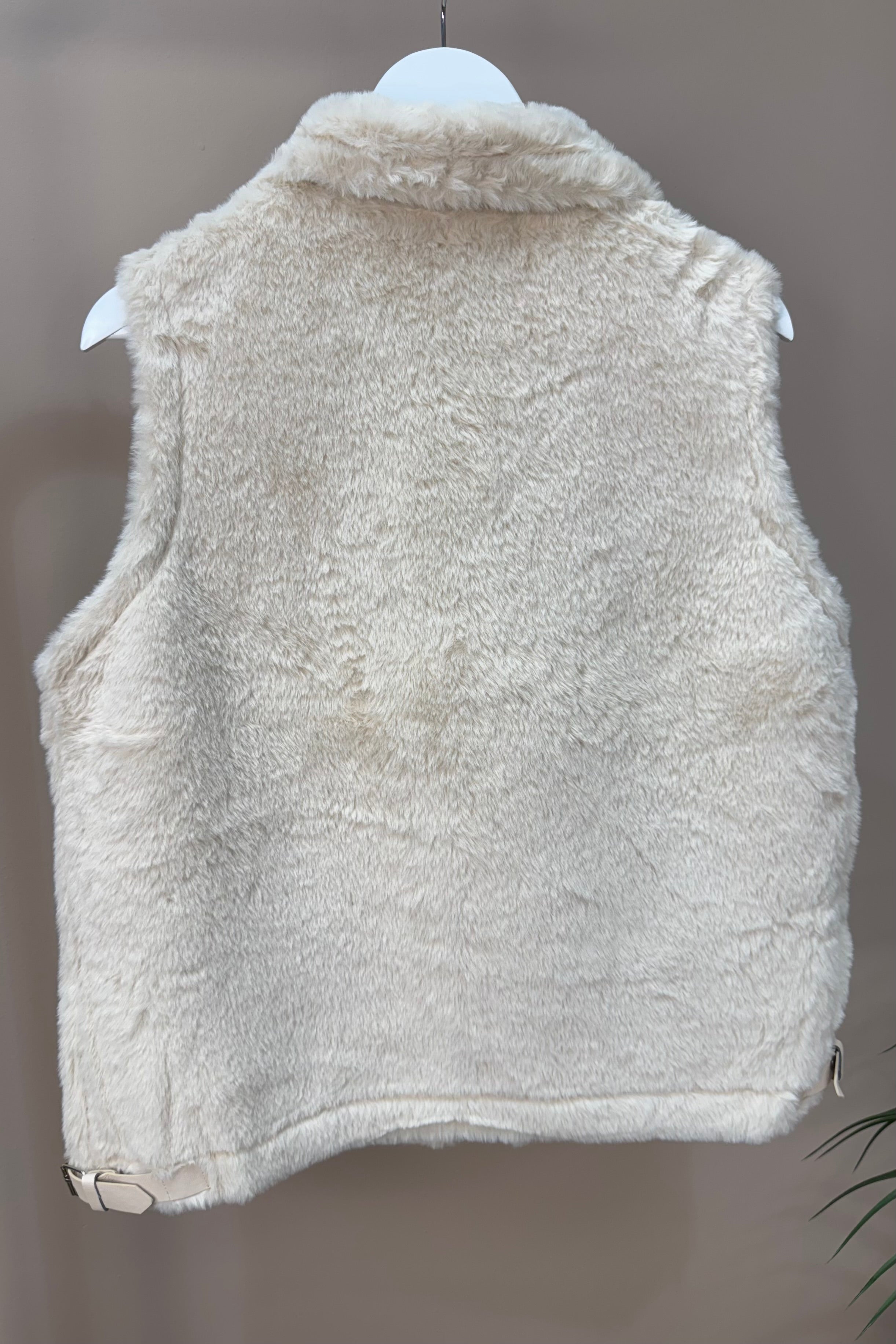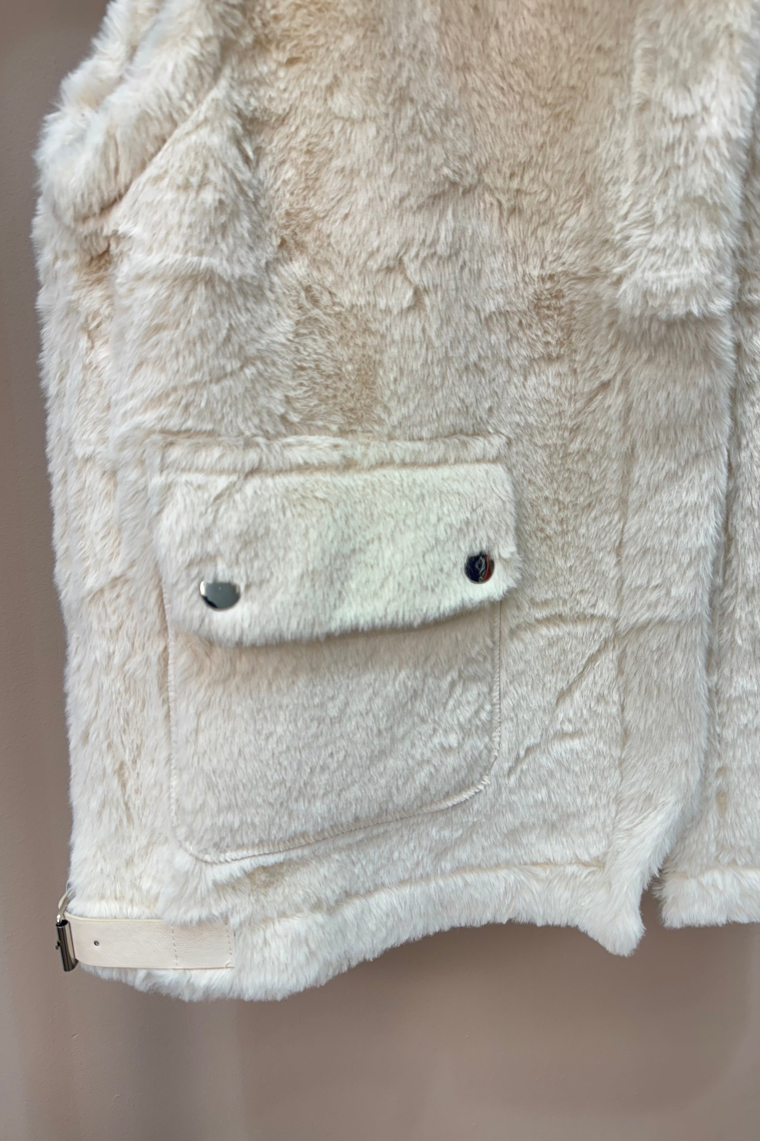 This Cream Fur Buckle Waistcoat combines softness and style with its plush fur exterior and smooth suede interior for comfortable warmth. The edgy buckle detail adds a bold touch, while the front pocket offers convenient storage. Perfect for adding texture and practical flair to your layered looks.