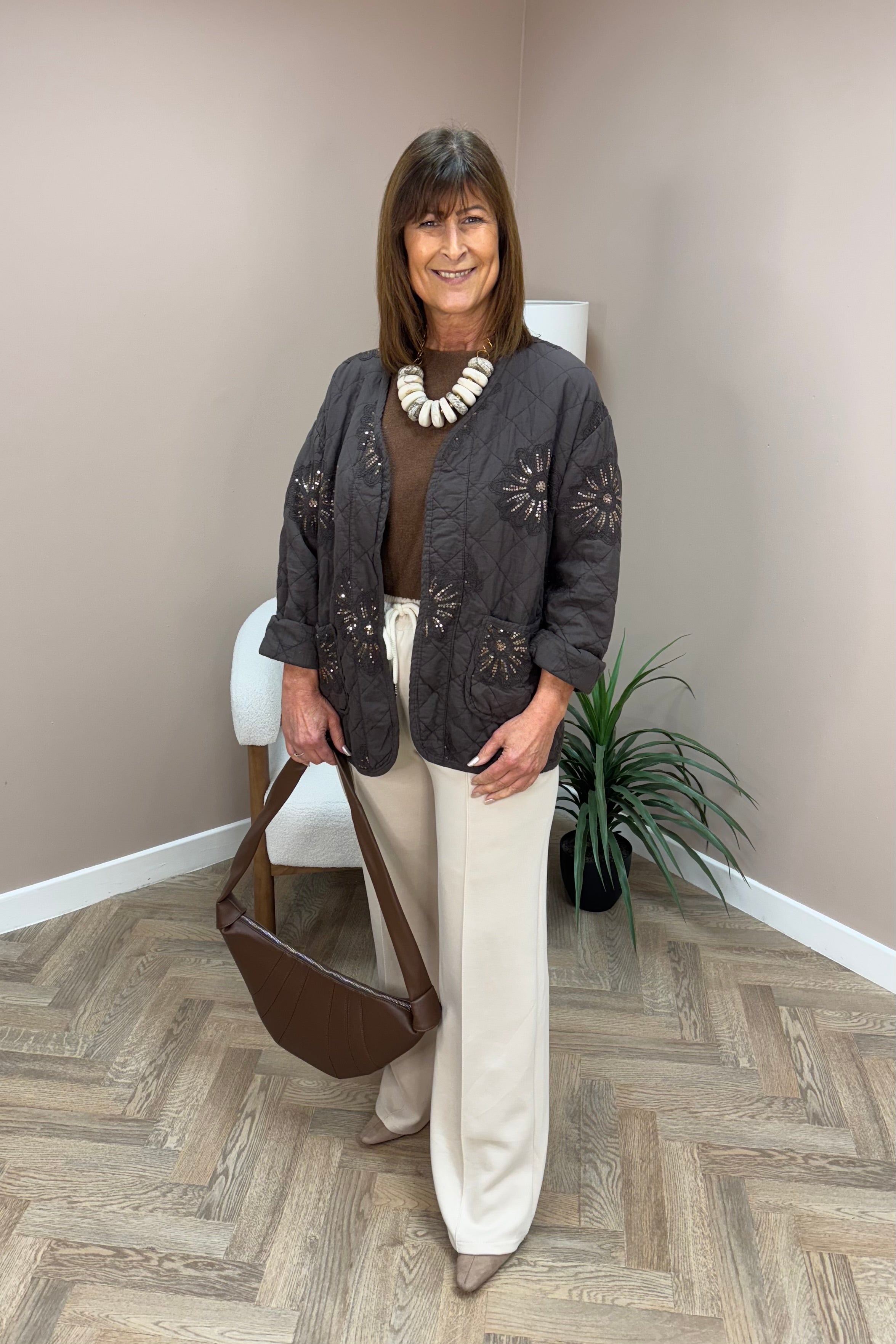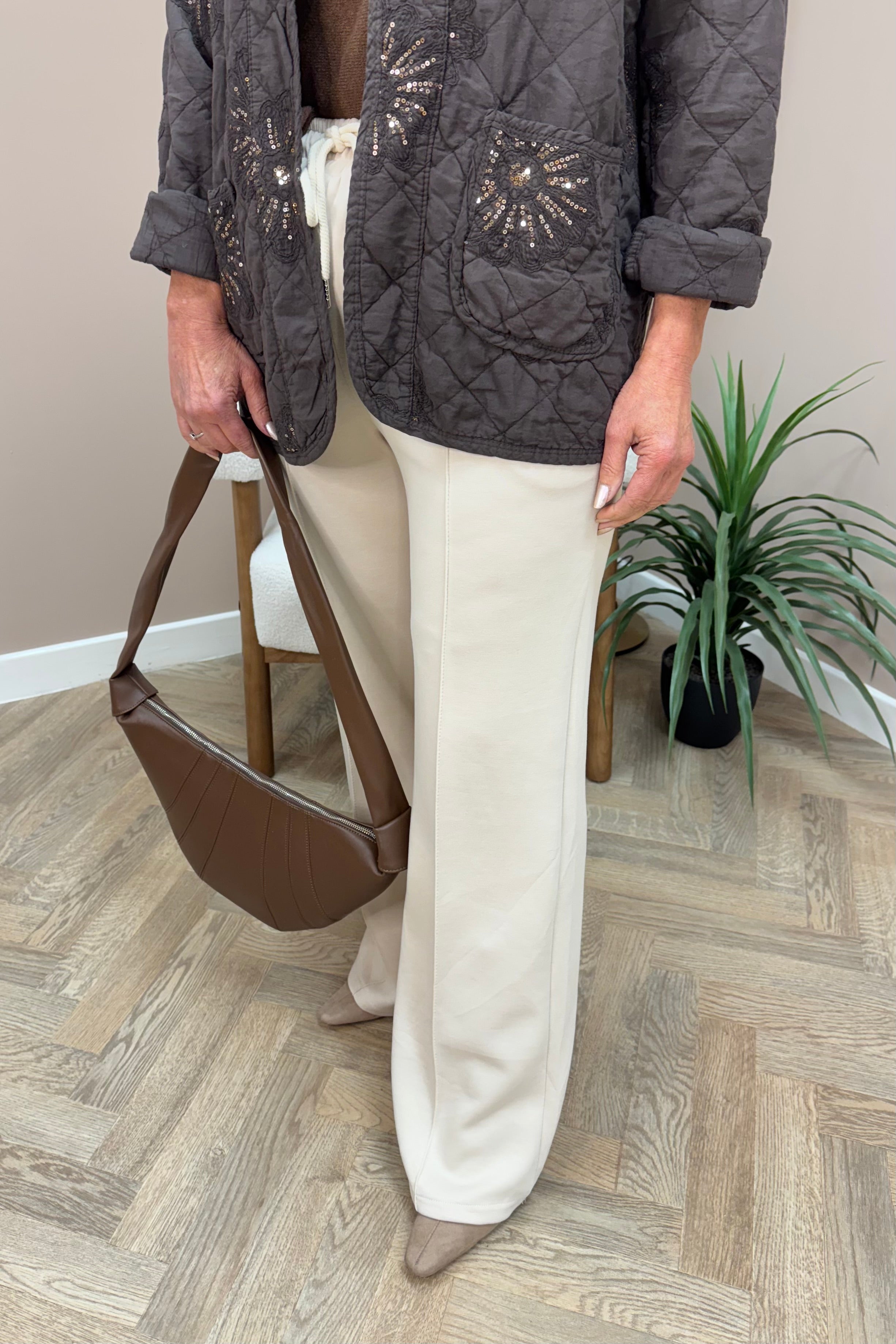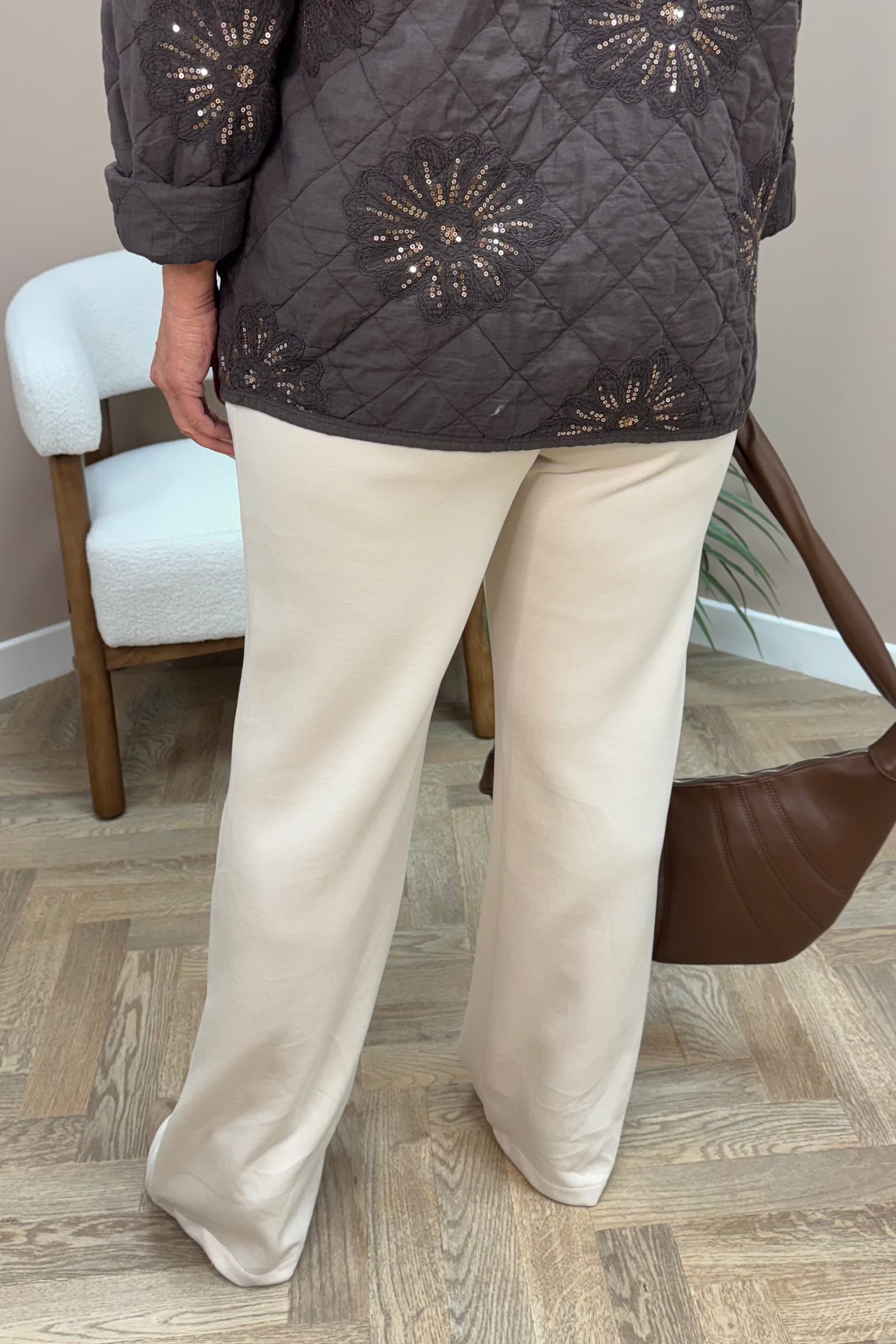 These Gayle Trousers in a refined cream jersey fabric combine comfort with understated elegance. Designed with a relaxed wide-leg silhouette, they feature an elastic waistband and adjustable pull ties for a tailored yet effortless fit. Soft, breathable material enhances all-day wearability, while discreet side pockets offer practical convenience. Perfectly suited for both relaxed lounging and stylish casual occasions, these trousers provide a sophisticated approach to leisurewear.