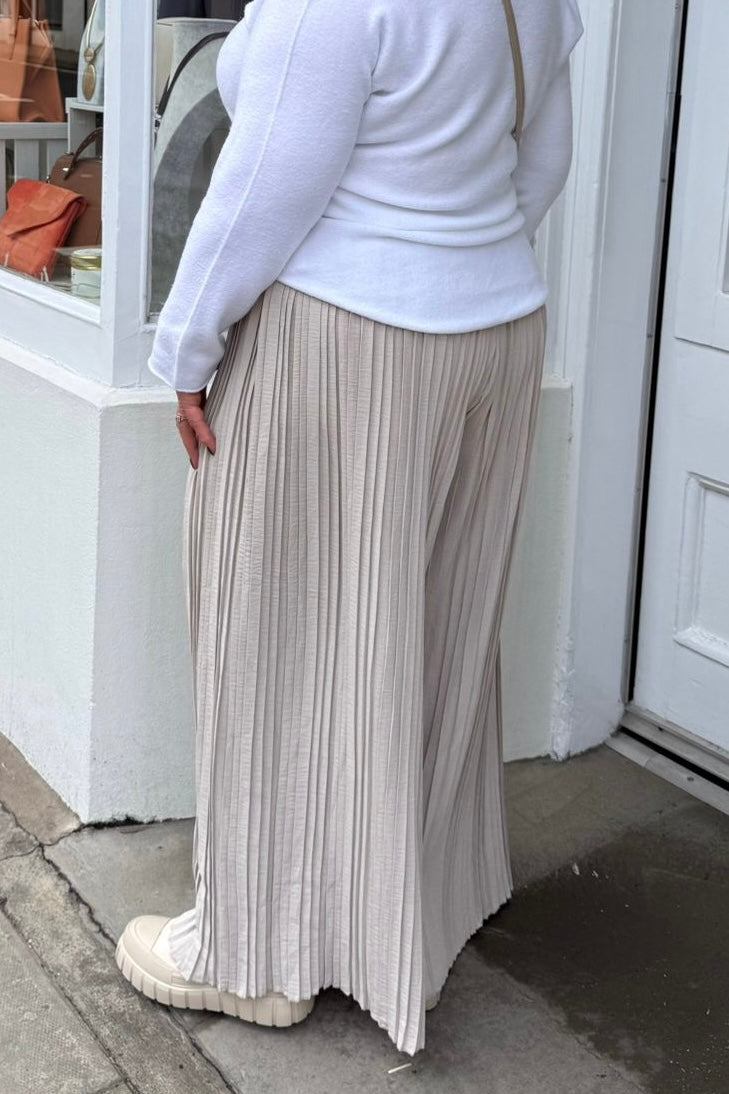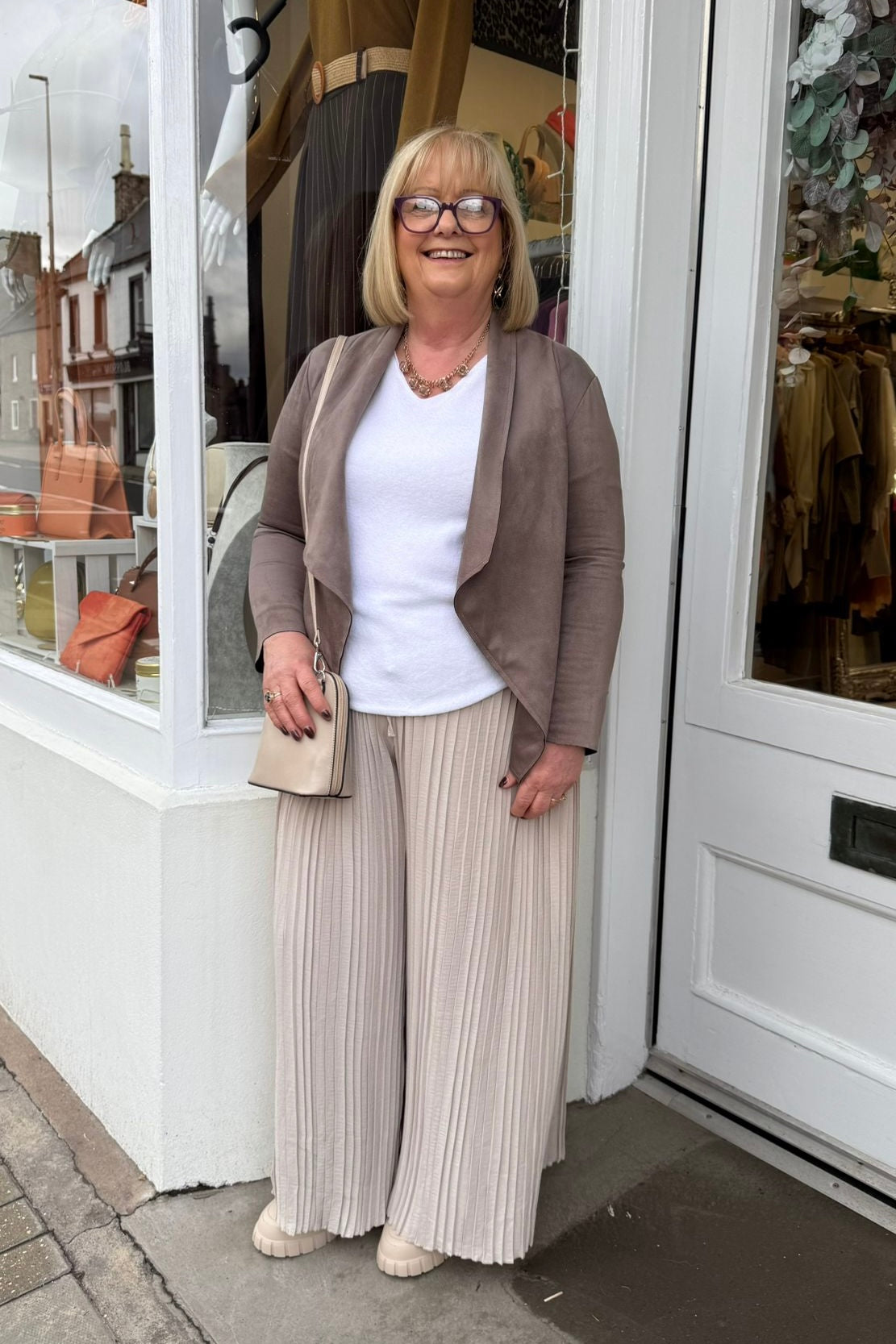 These Pleated Trousers combine elegance with comfort through their flowy, flattering silhouette. Designed with a faux drawstring and an elasticated waist, they offer a refined fit without compromising ease of wear. Perfect for a polished look that moves gracefully throughout your day.
