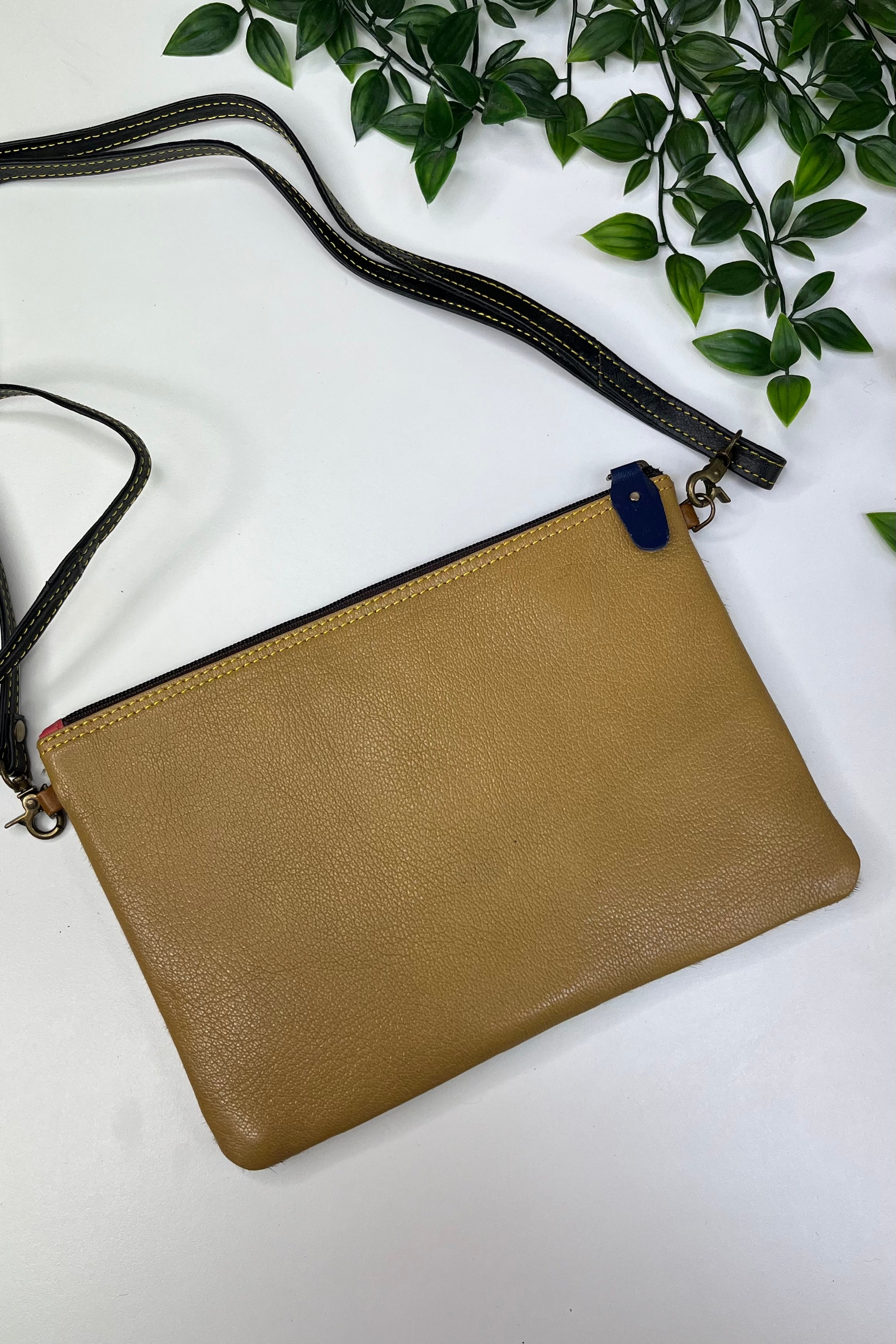 Made from recycled leather, each pouch has its own unique natural marks that add charm and blend beautifully with the bright colours over time.