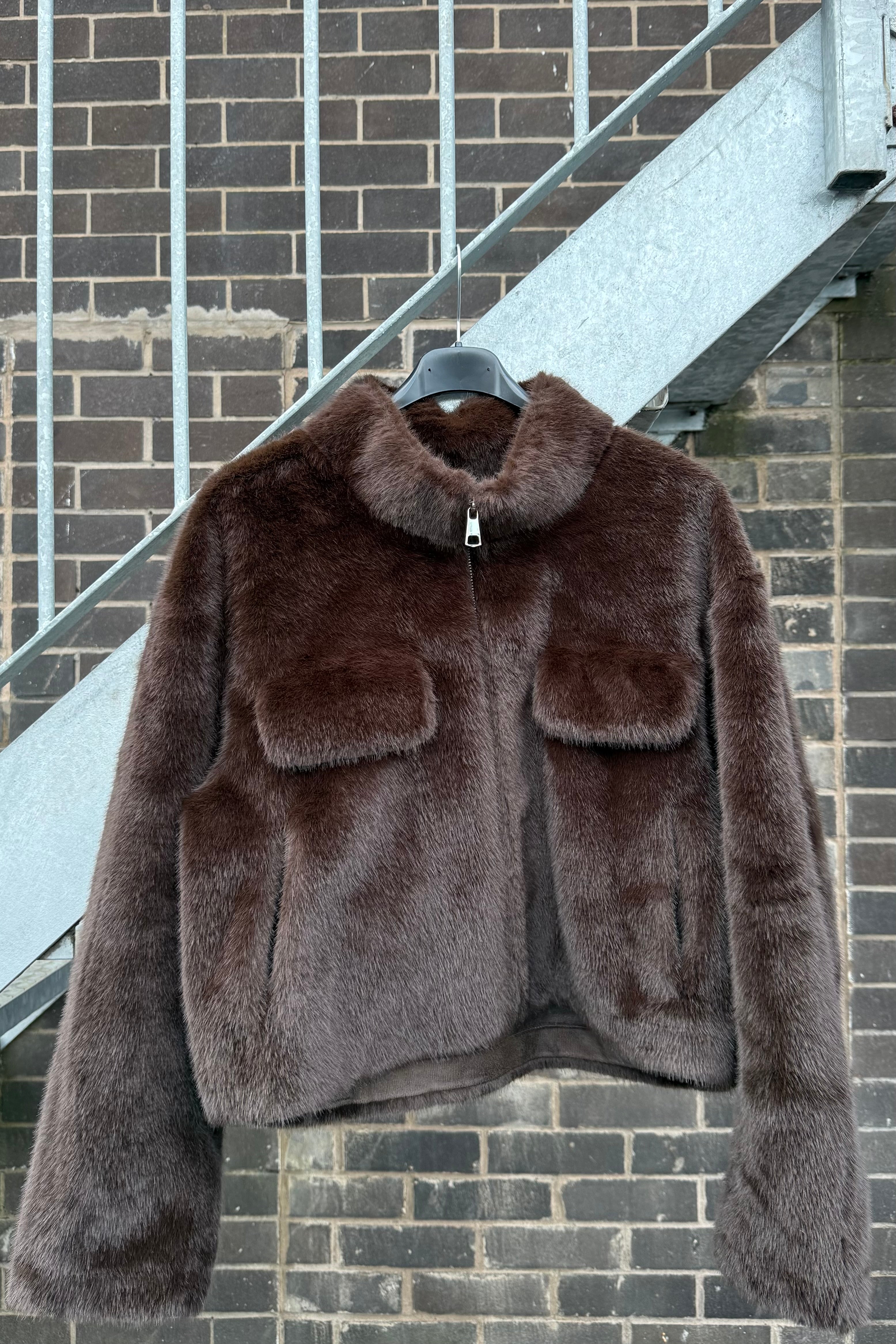 Indulge in the richness of this deep chocolate faux fur jacket — a statement piece that radiates sophistication. Cut in a flattering silhouette that fits comfortably up to size 16/18, it blends elegance with versatility. The plush texture and polished details give it that covetable high-end look, whether styled casually with jeans or layered over chic evening wear. Effortless, timeless, and undeniably luxe.