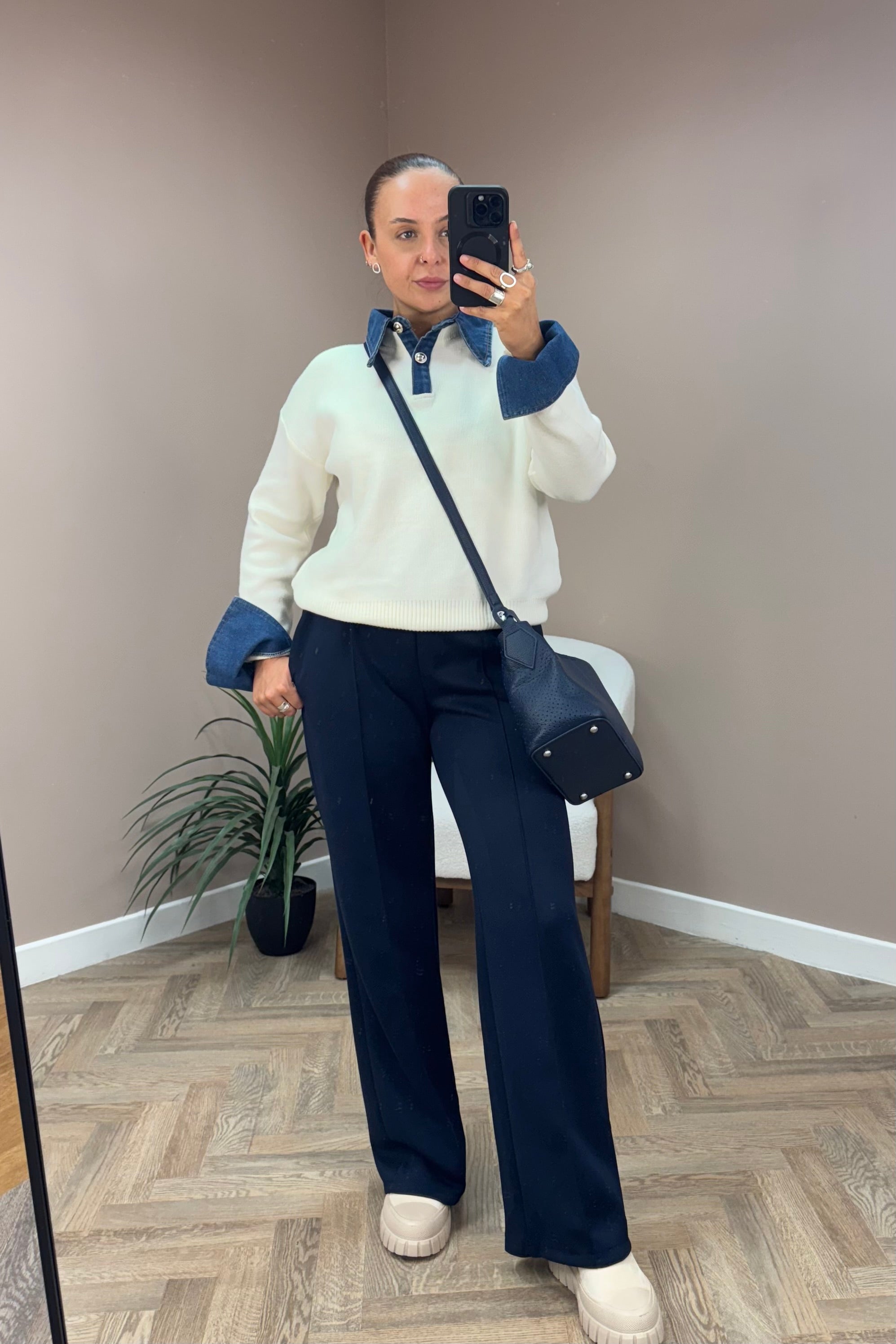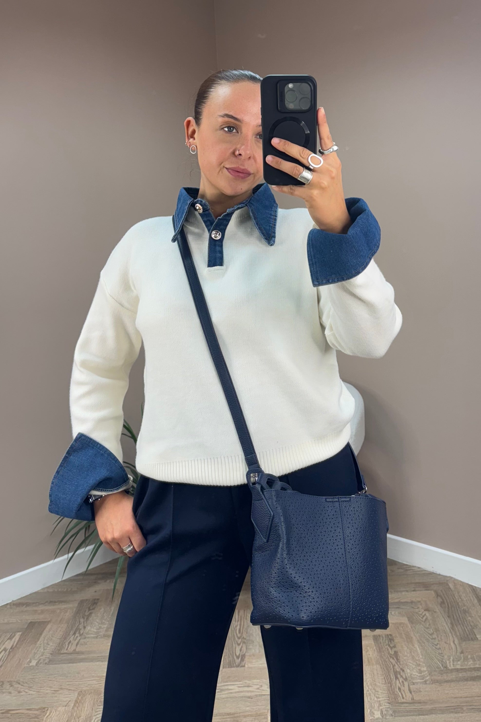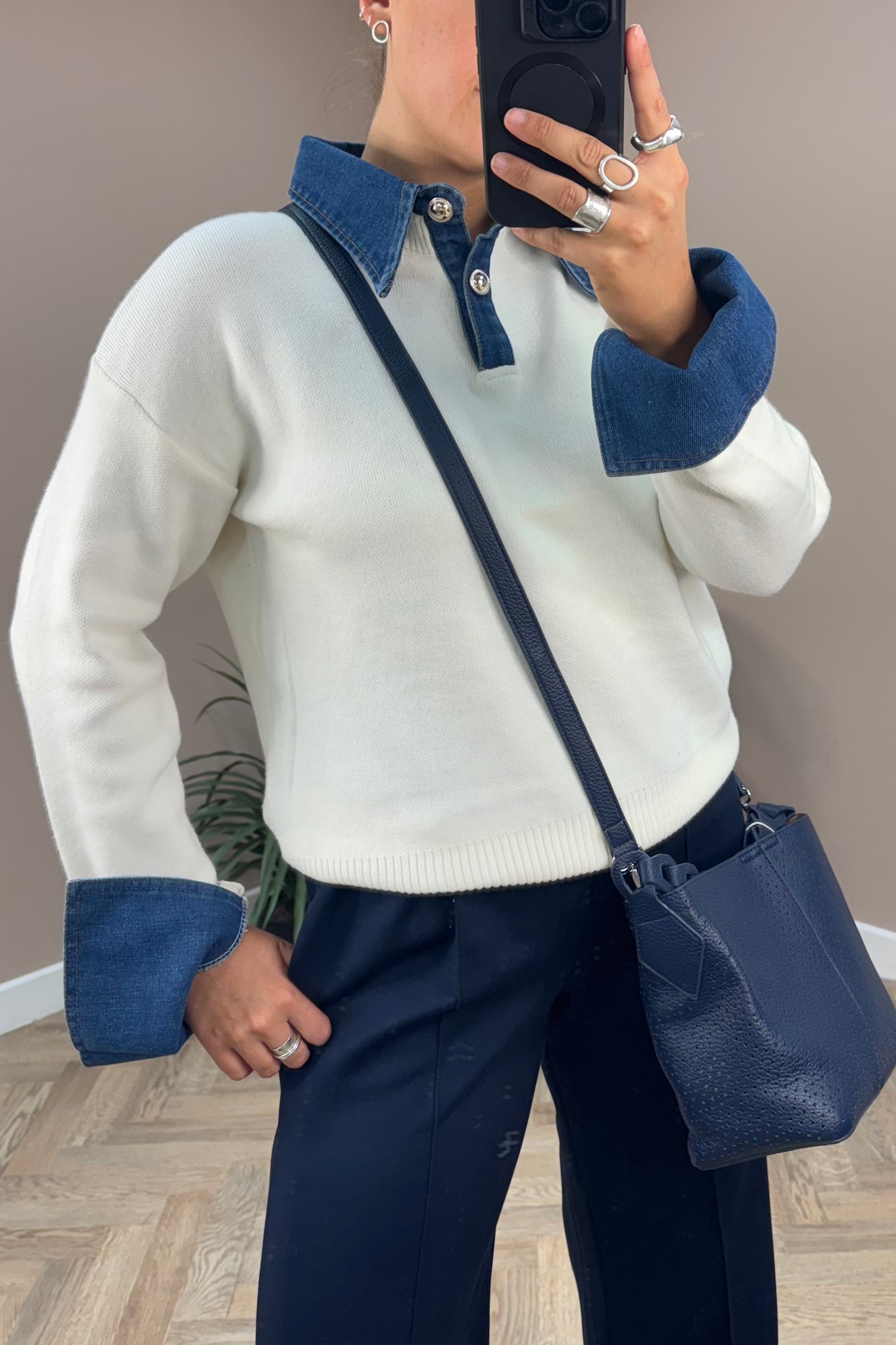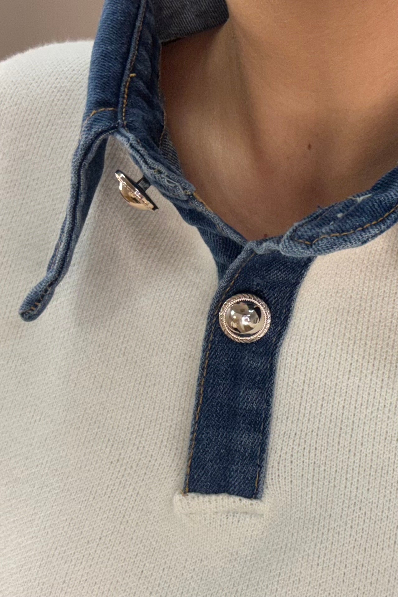 This elegant soft knit sweater features a refined denim collar and cuffs, accented with gold buttons for a touch of luxury. Its combination of textures offers both comfort and style, making it a sophisticated choice for versatile, polished looks.