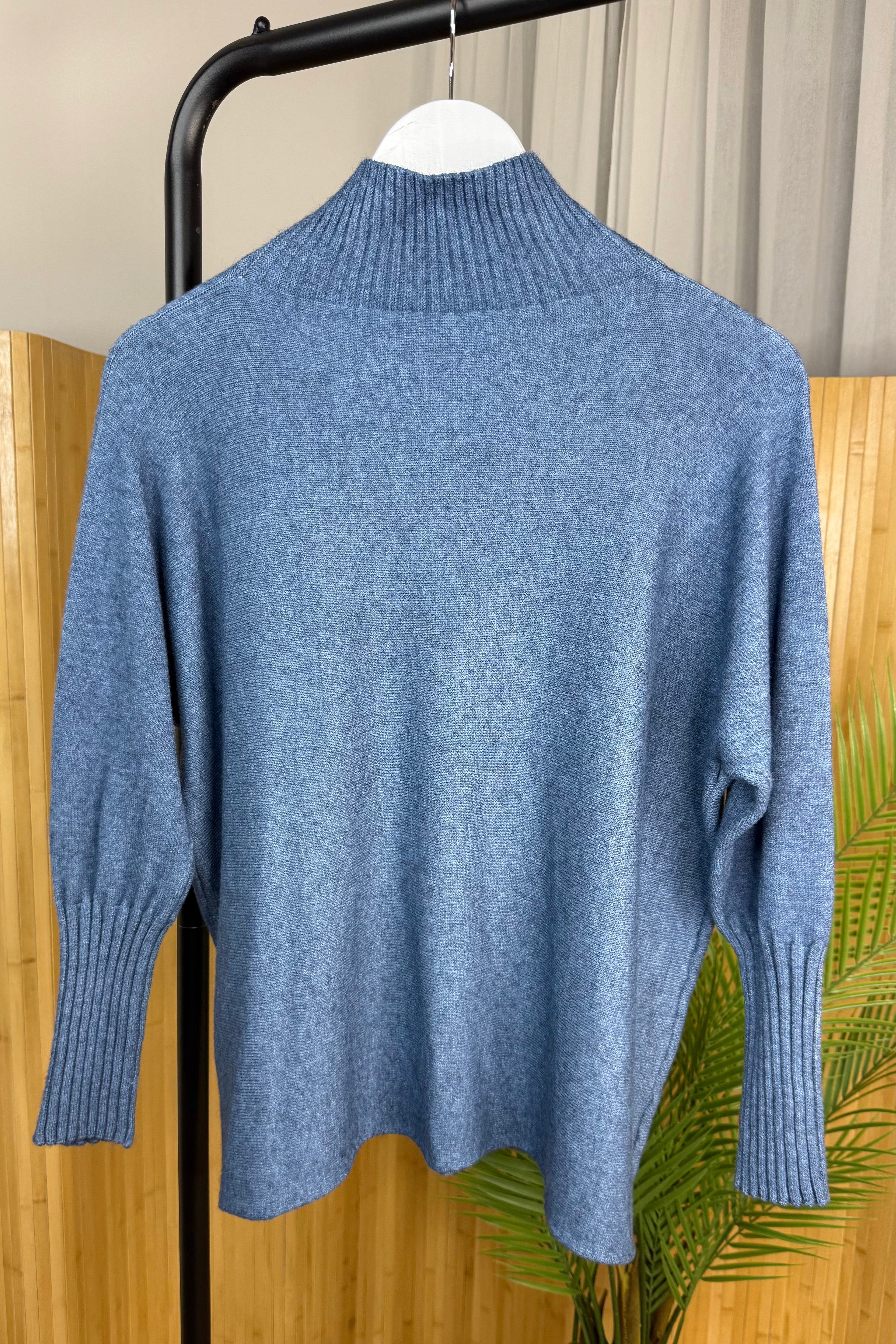 Denim Blue Ribby Knit Jumper. This cosy high-neck design delivers warmth without the bulk, while tapered ribbed sleeves add a touch of refined structure. Perfect for layering or wearing solo, it's the kind of piece that feels as good as it looks effortlessly chic for any season.