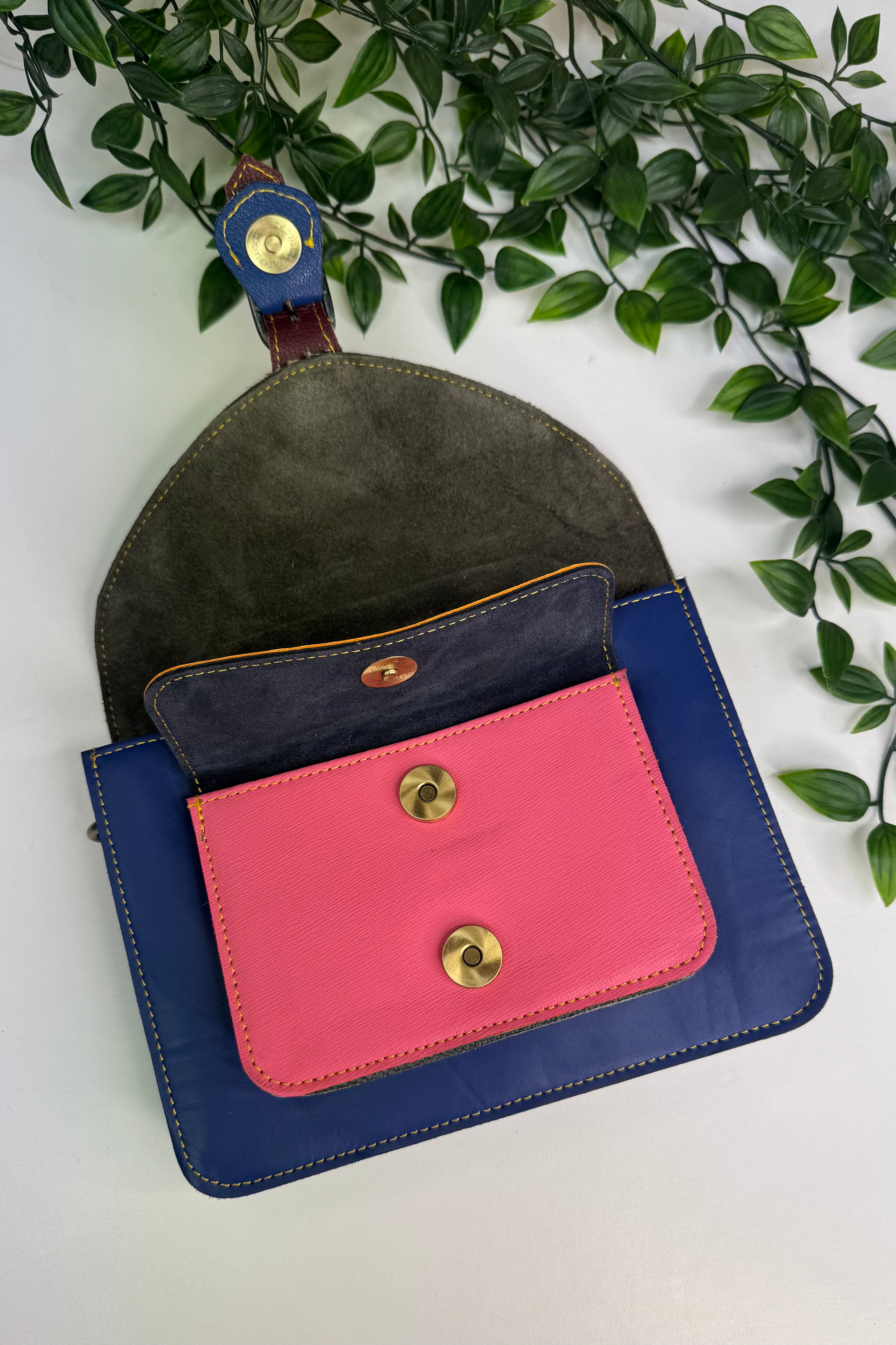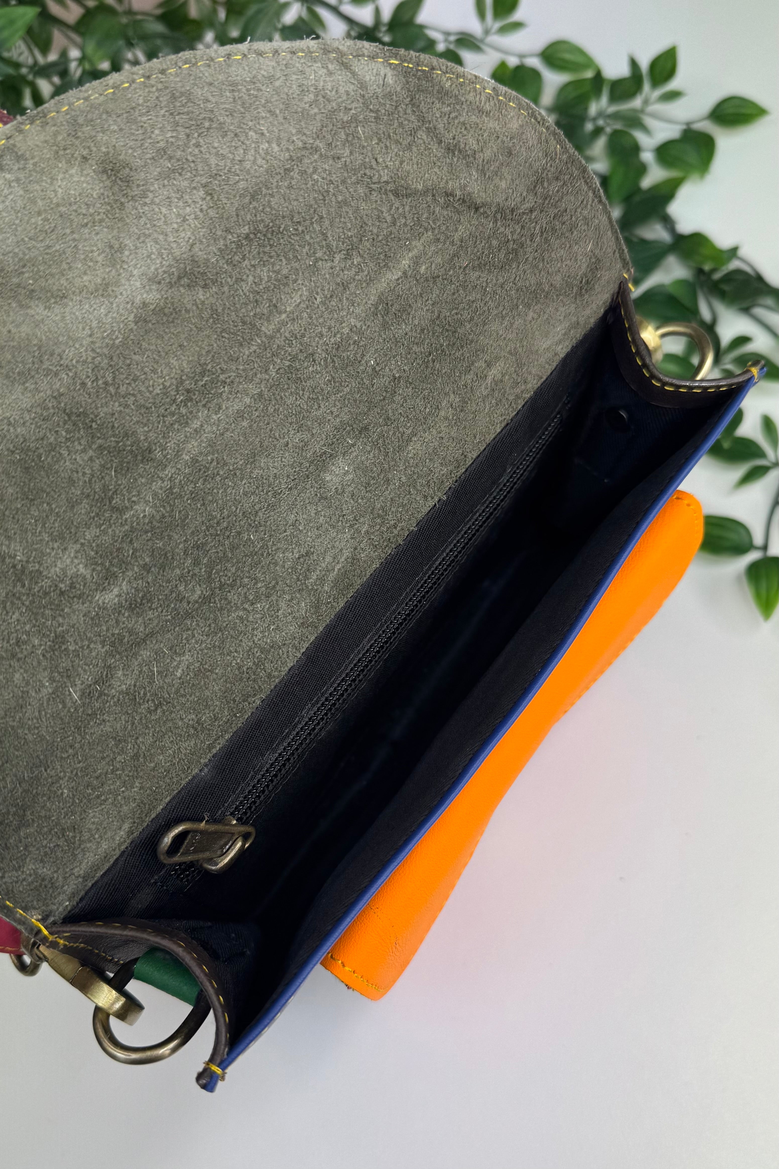 Made from recycled leather, each bag has its own unique natural marks that add charm and blend beautifully with the bright colours over time.