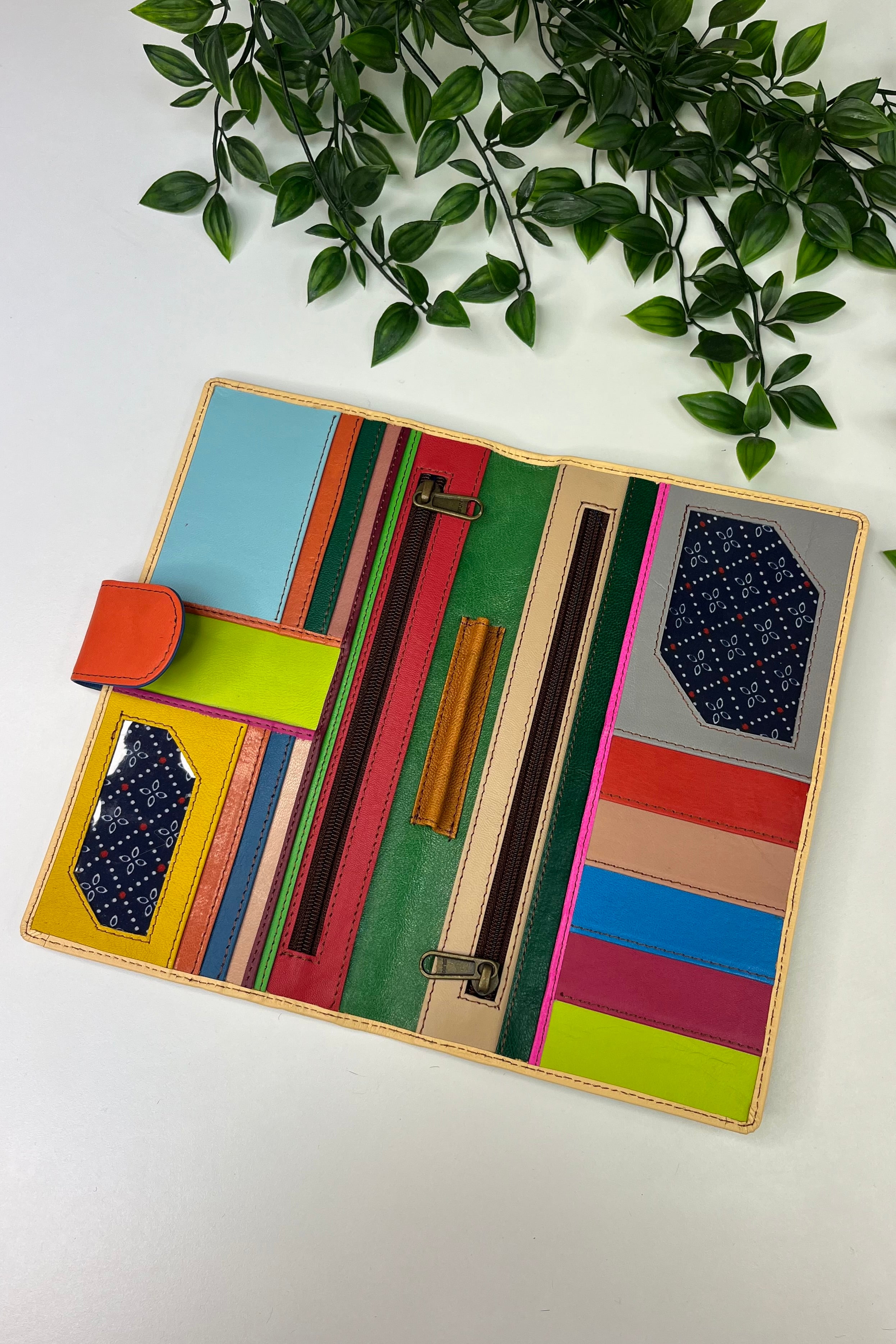 Made from recycled leather, each pouch has its own unique natural marks that add charm and blend beautifully with the bright colours over time.