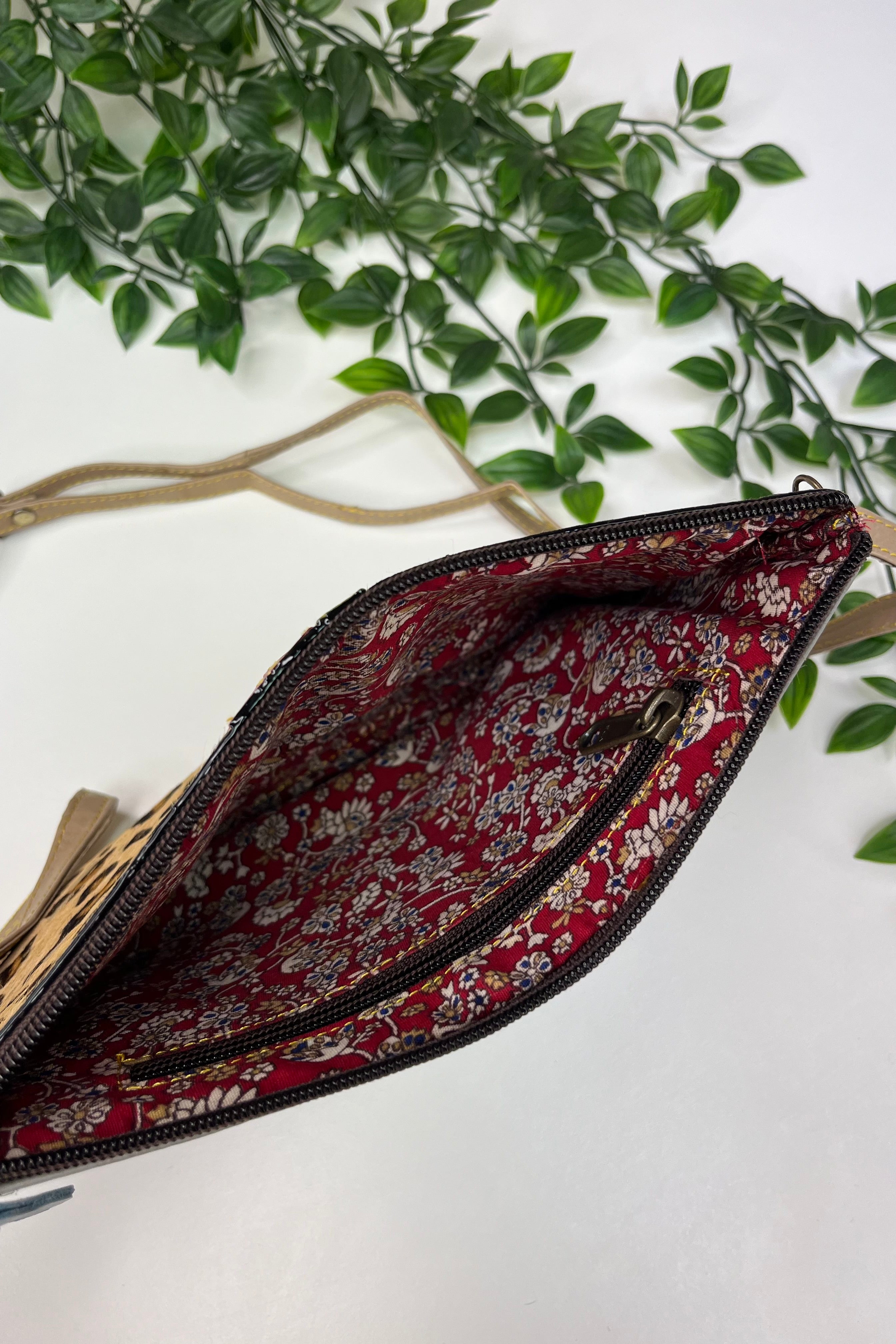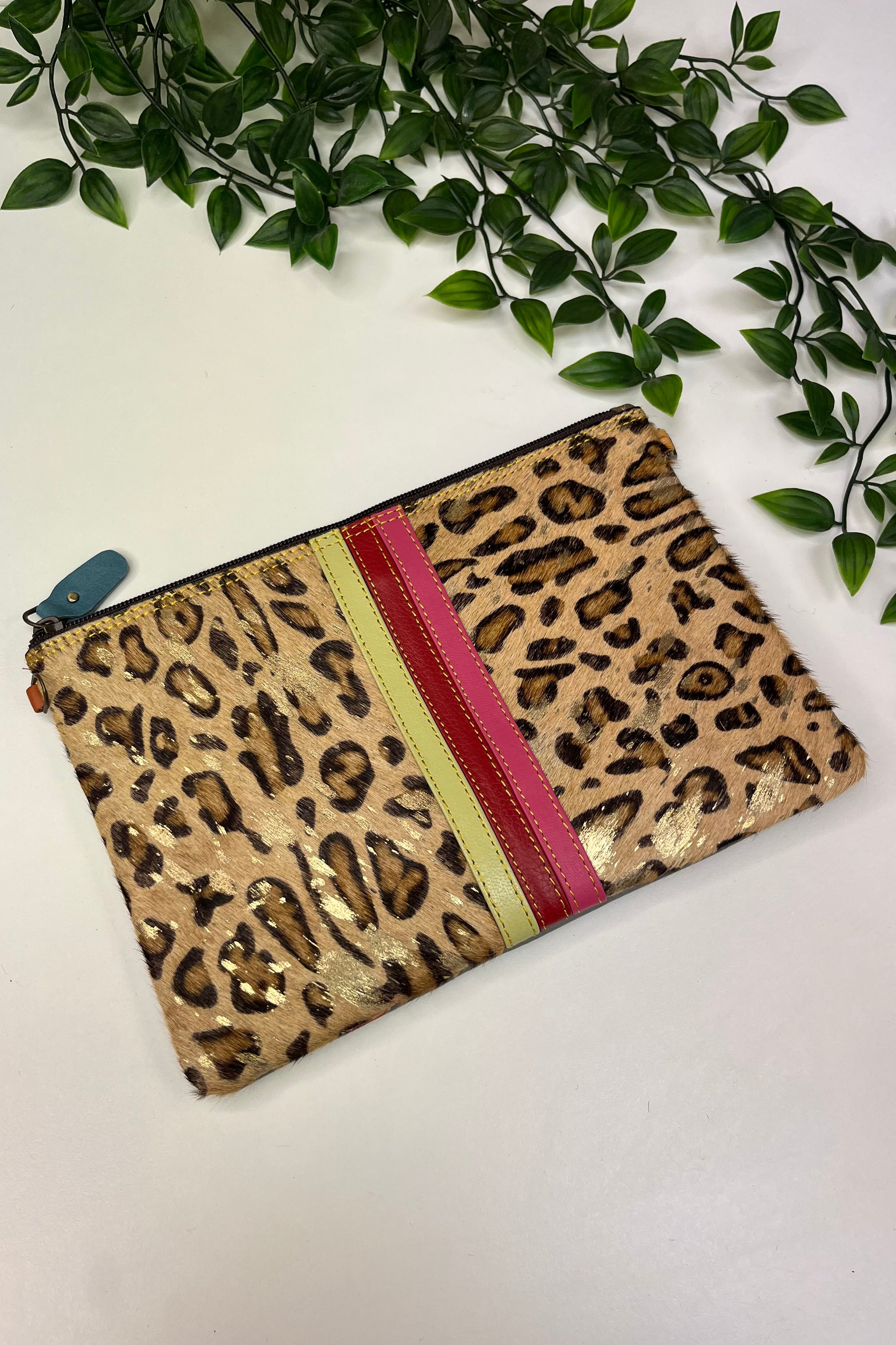Made from recycled leather, each pouch has its own unique natural marks that add charm and blend beautifully with the bright colours over time.