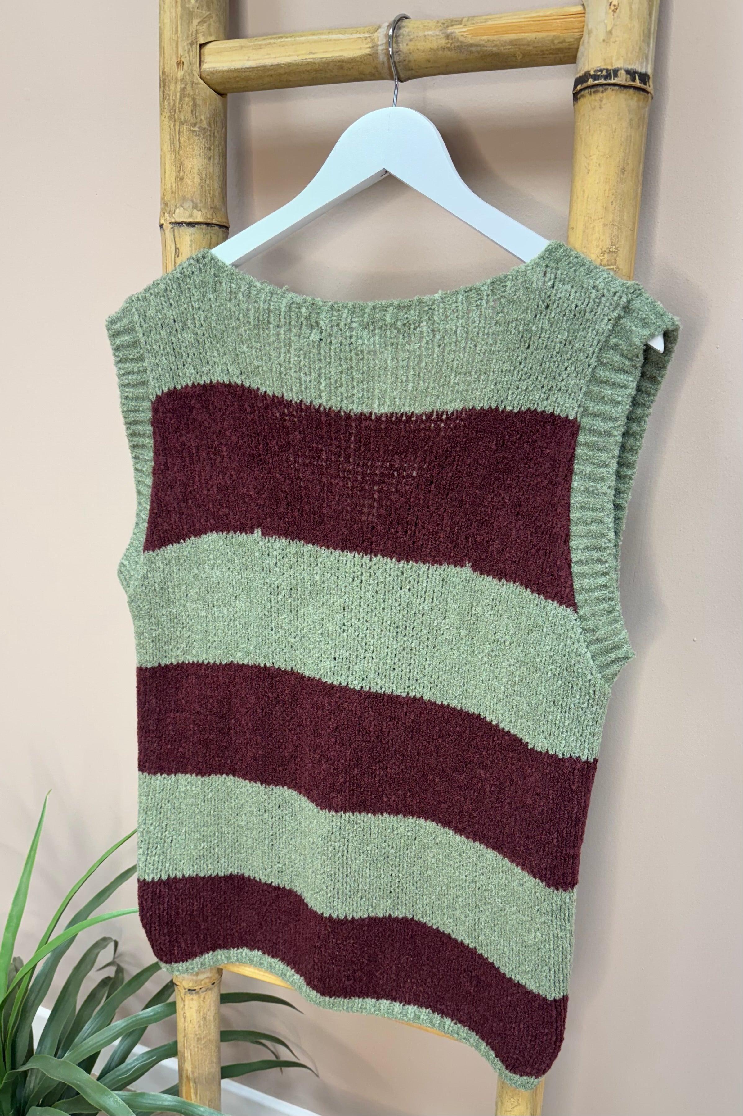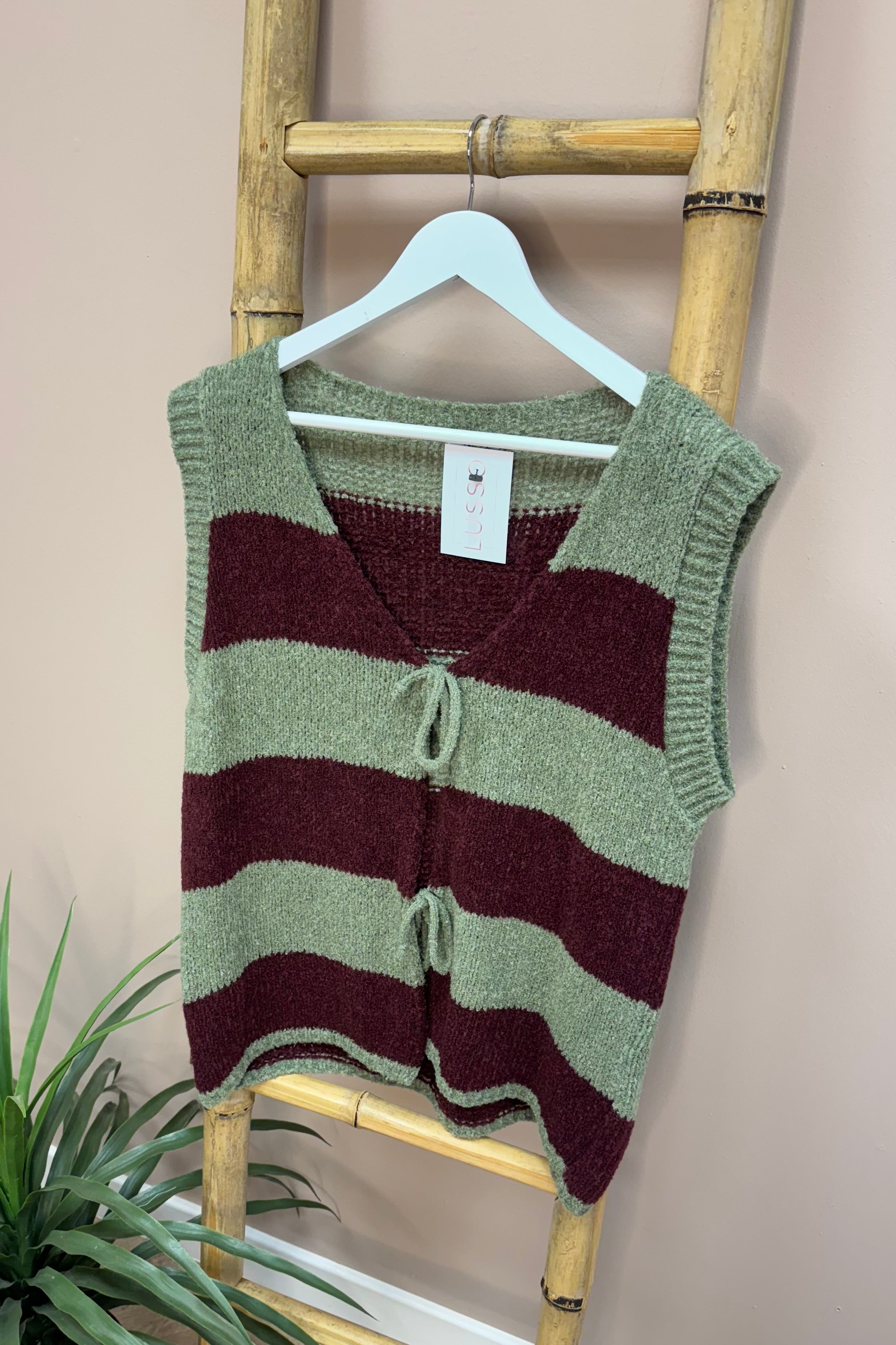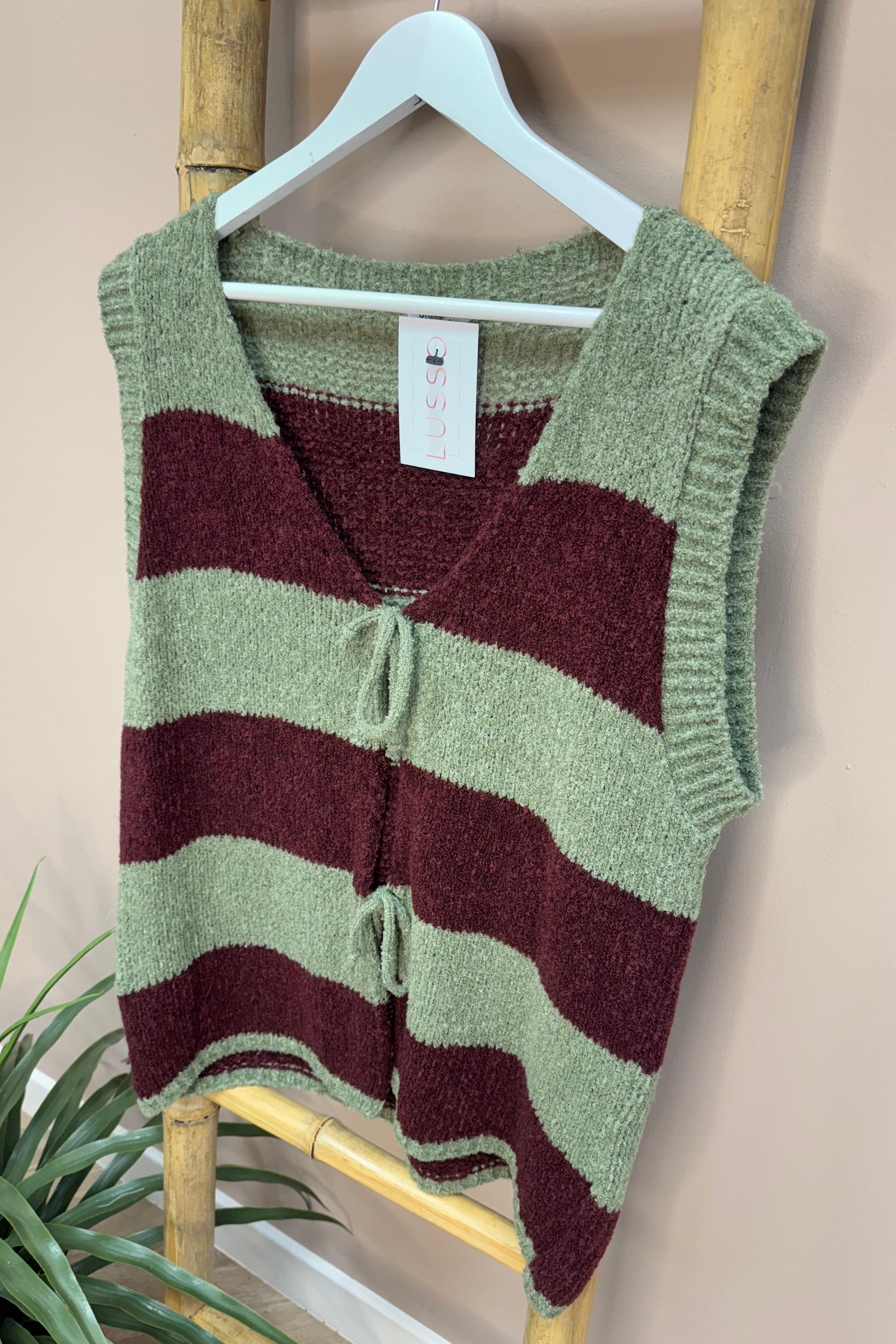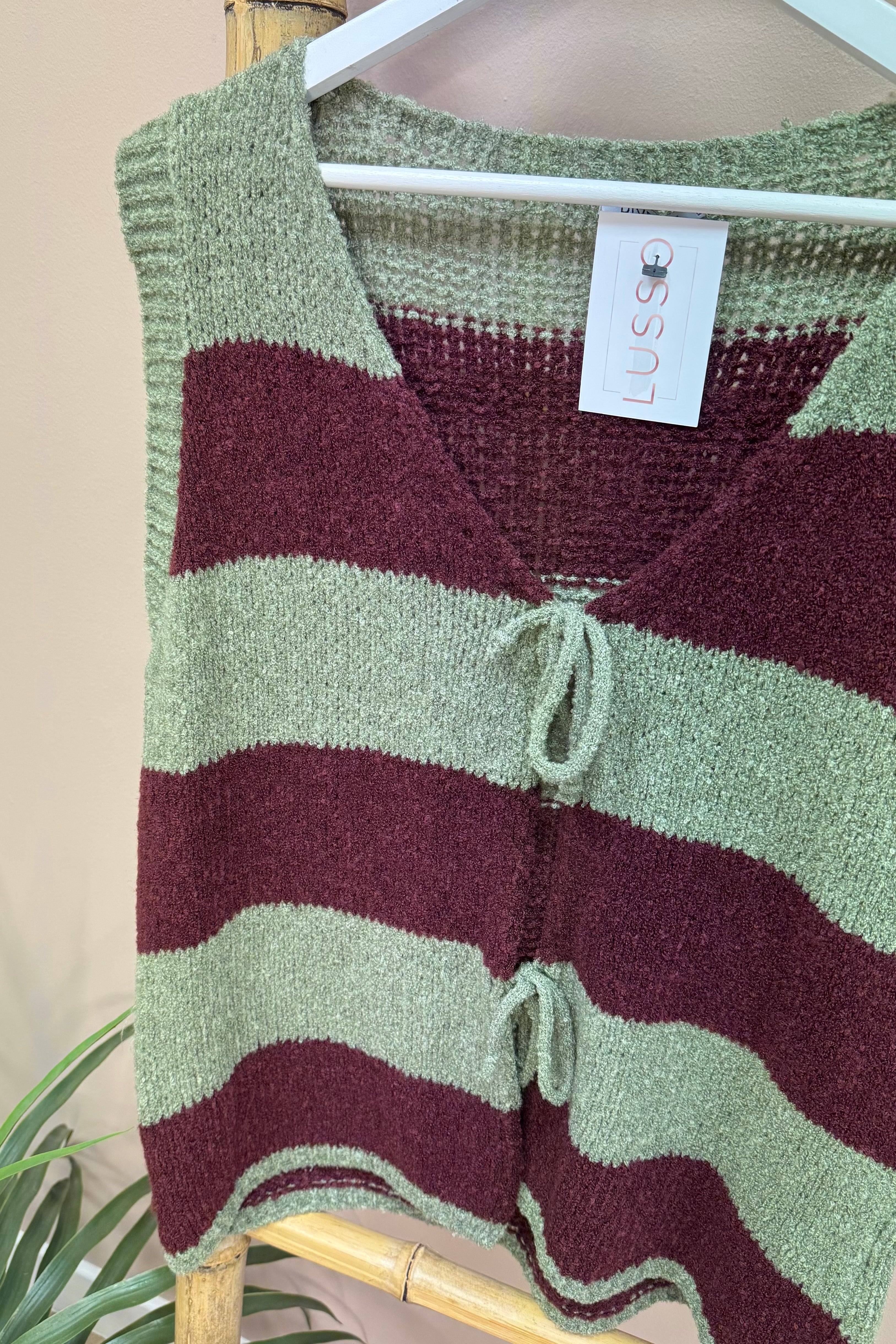 This Khaki And Burgundy Striped Tie Front Gilet features a cosy, soft fabric that wraps you in comfort. The playful tie strings at the front add a touch of fun, making it easy to style and brighten up any outfit. Perfect for layering with a pop of colour and charm.