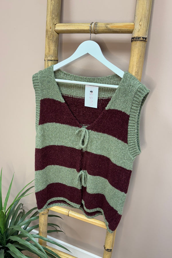 Khaki And Burgundy Striped Tie Front Gilet