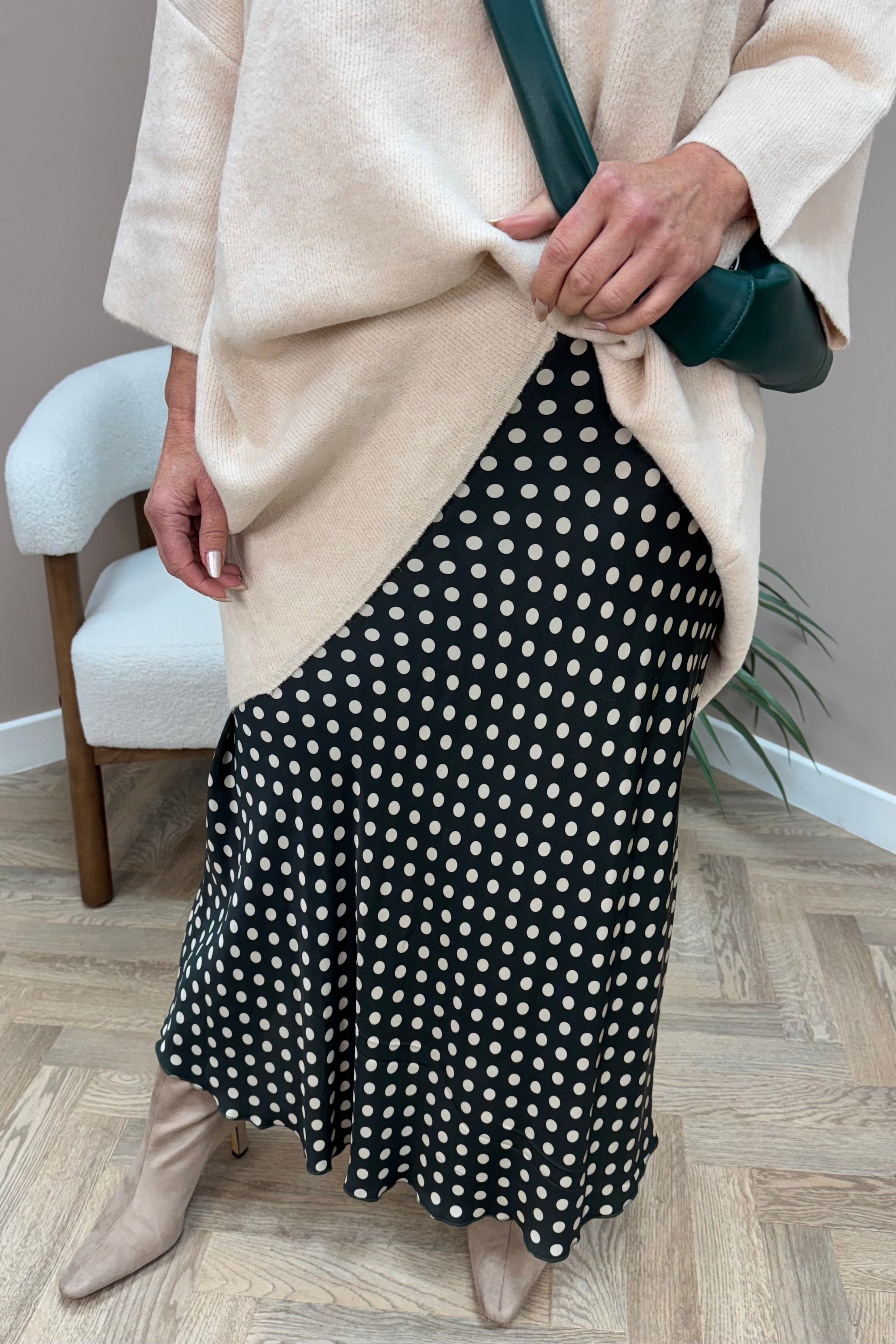 Made from soft, silky material, the Khaki and Cream Spotty Maxi Skirt combines luxurious comfort with a subtle spotty pattern that adds refined texture. This expertly designed skirt offers graceful movement and versatile elegance, making it a sophisticated addition to any wardrobe.