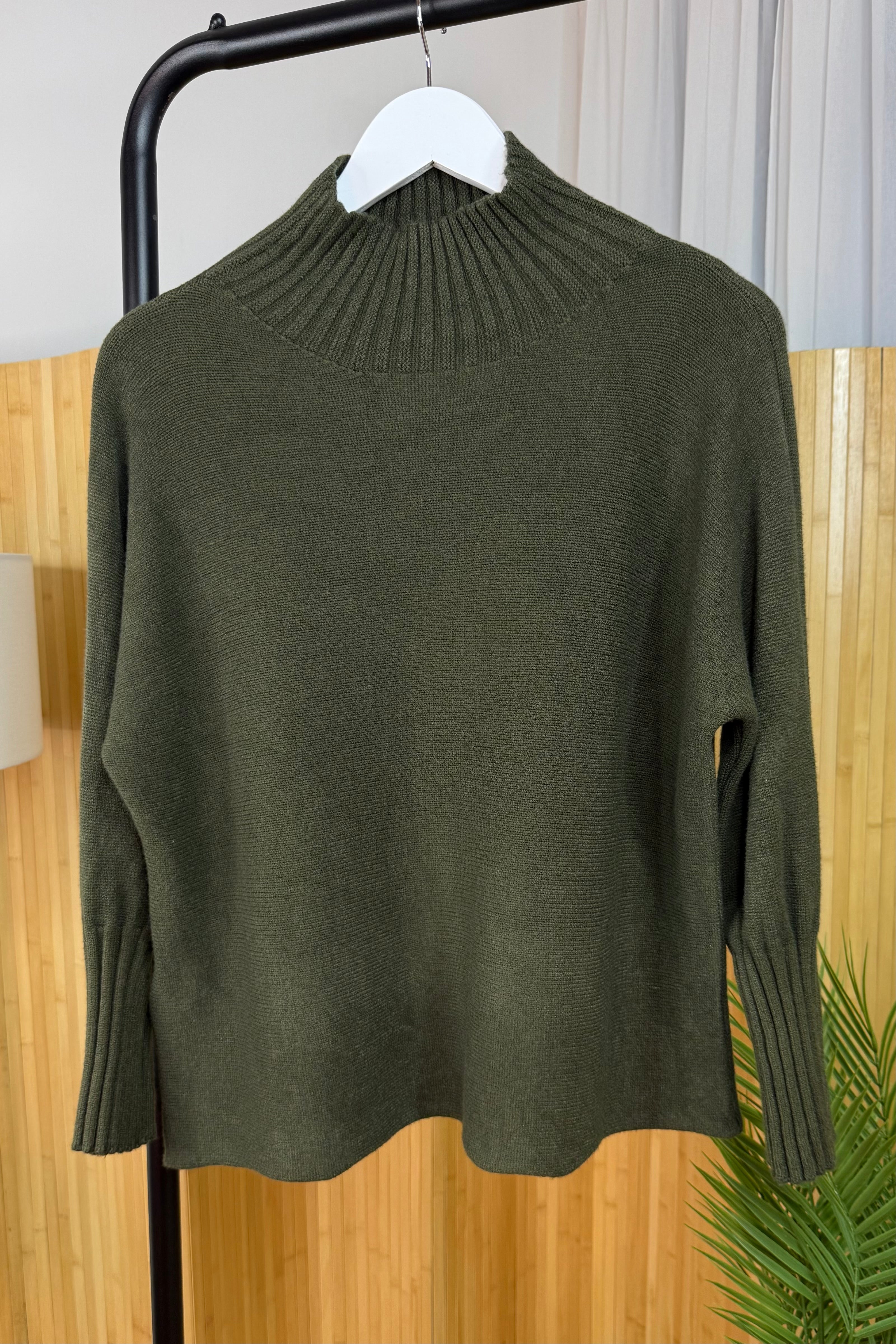 Wrap yourself in understated elegance with our Khaki Green Ribby Knit Jumper. This cosy high-neck design delivers warmth without the bulk, while tapered ribbed sleeves add a touch of refined structure. Perfect for layering or wearing solo, it's the kind of piece that feels as good as it looks effortlessly chic for any season.