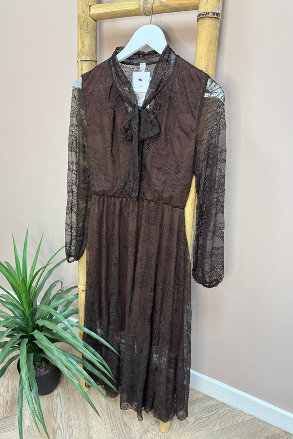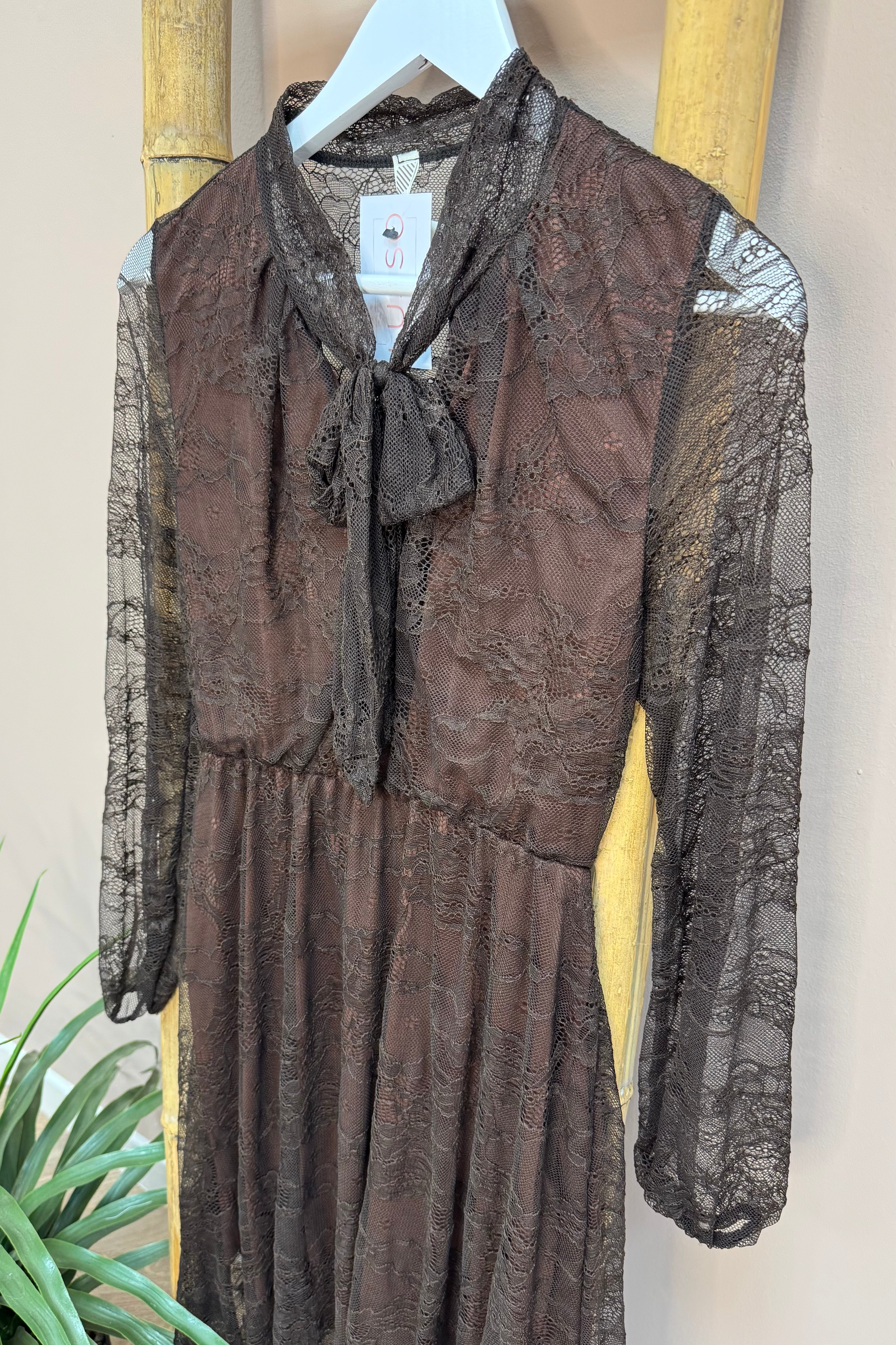 The Lace Pussy Bow Dress features exquisite full lace detailing complemented by a soft lining for gentle wear. A delicate tie at the neck enhances its elegant silhouette, while the mid-length design offers timeless sophistication suitable for any refined occasion.