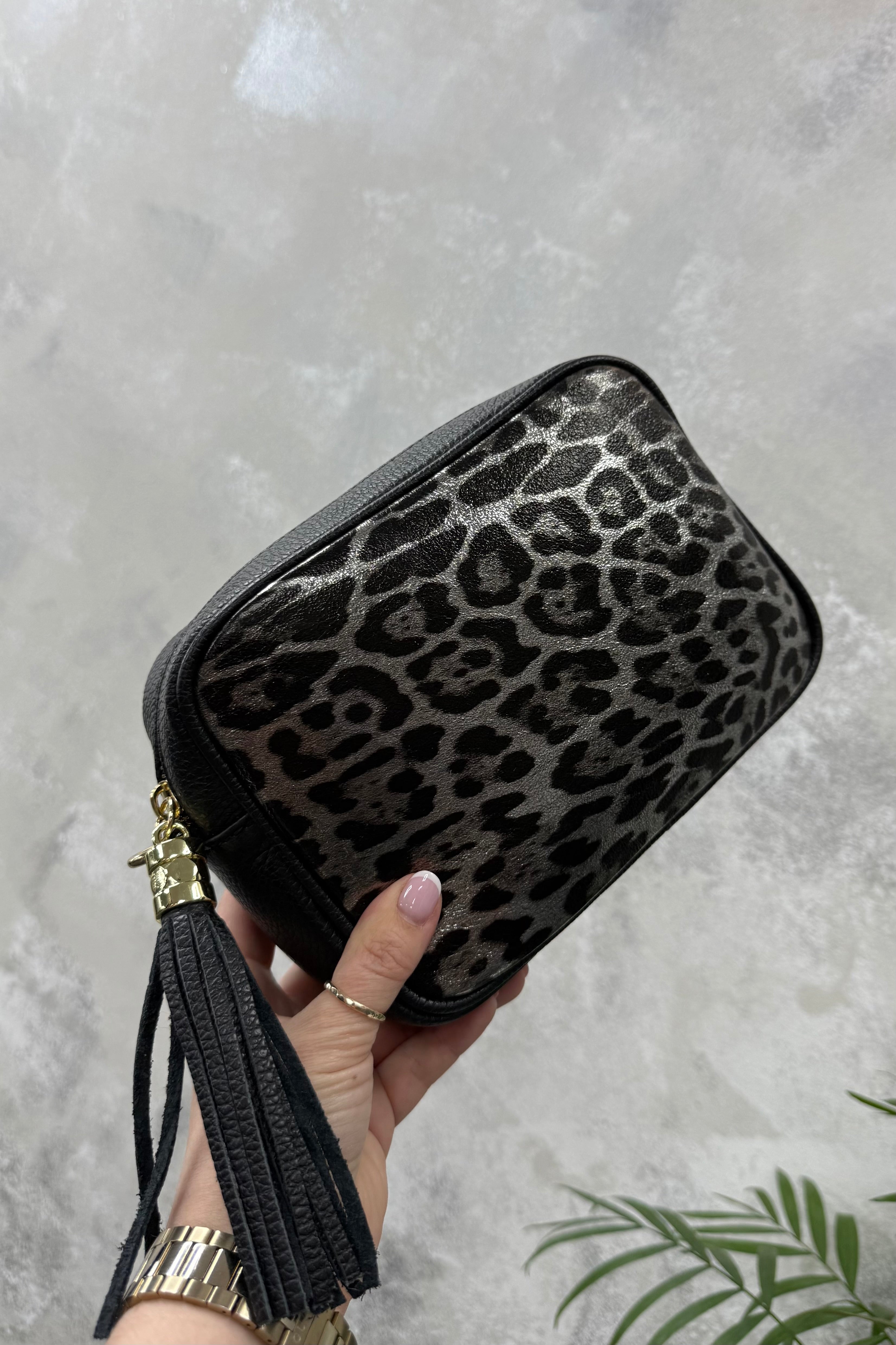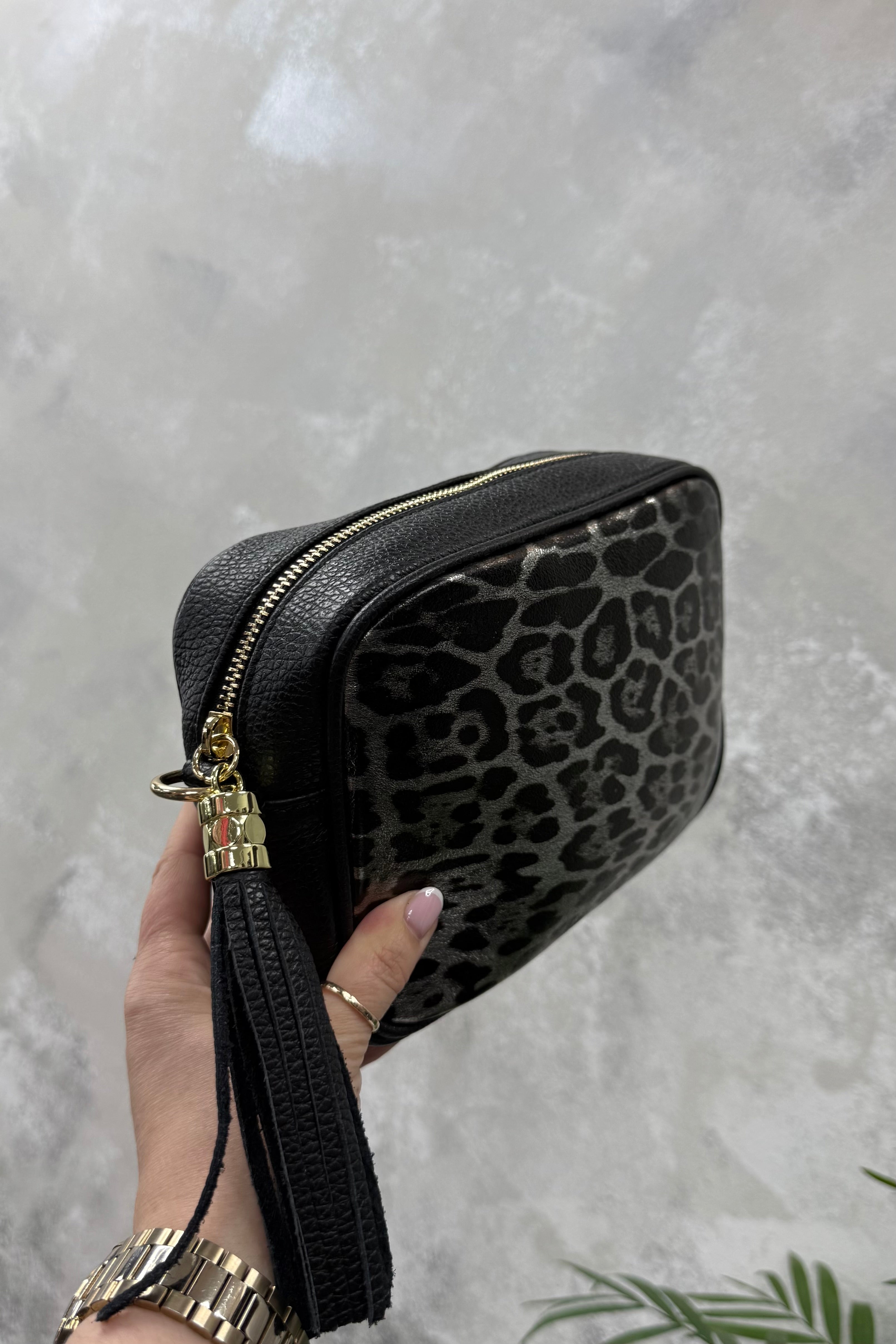 Turn heads with this sleek and stylish leather crossbody bag, crafted in a striking black leopard print design. The luxurious textured finish gives it a chic, modern edge, while the statement gold hardware and oversized leather tassel add a touch of glamour.