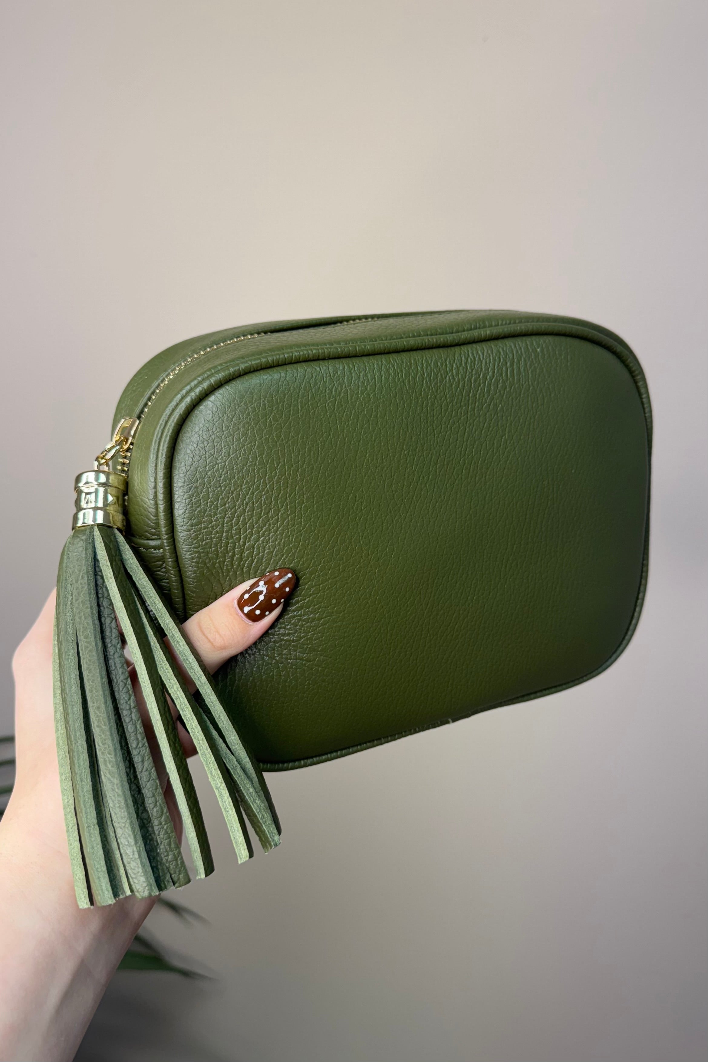 Turn heads with this sleek and stylish leather crossbody bag, crafted in a striking khaki colour. The luxurious textured finish gives it a chic, modern edge, while the statement gold hardware and oversized leather tassel add a touch of glamour.