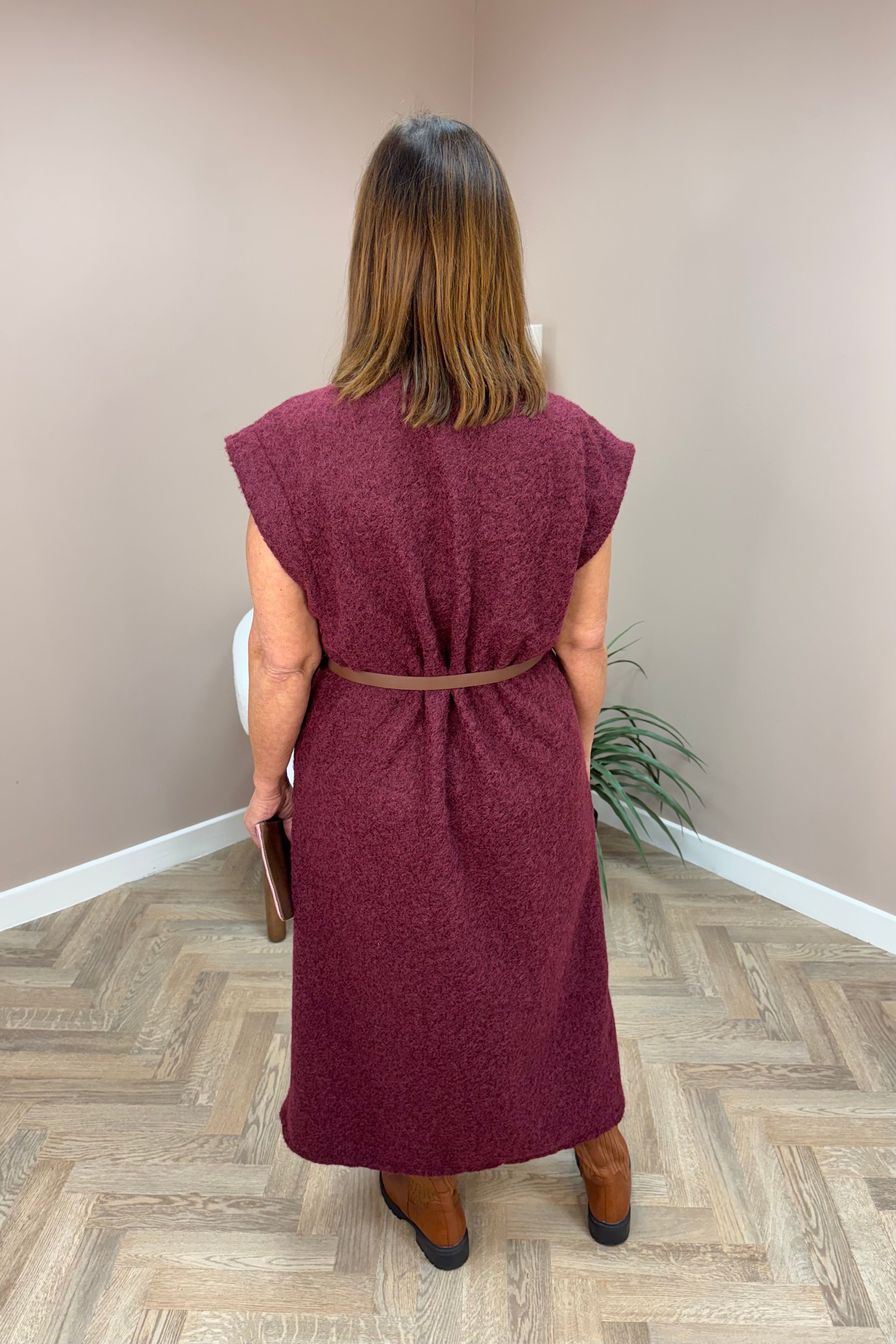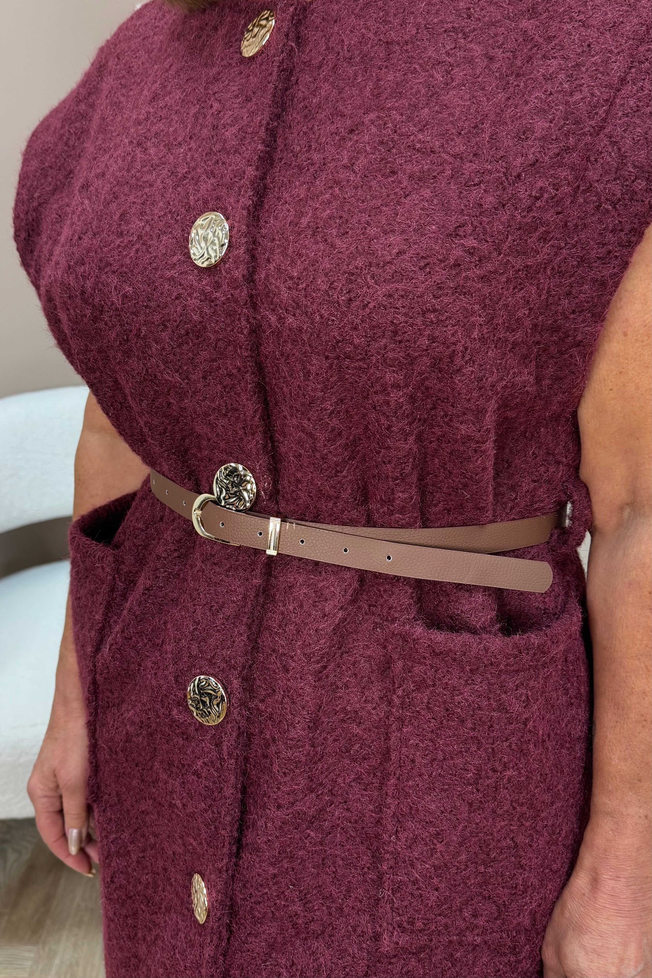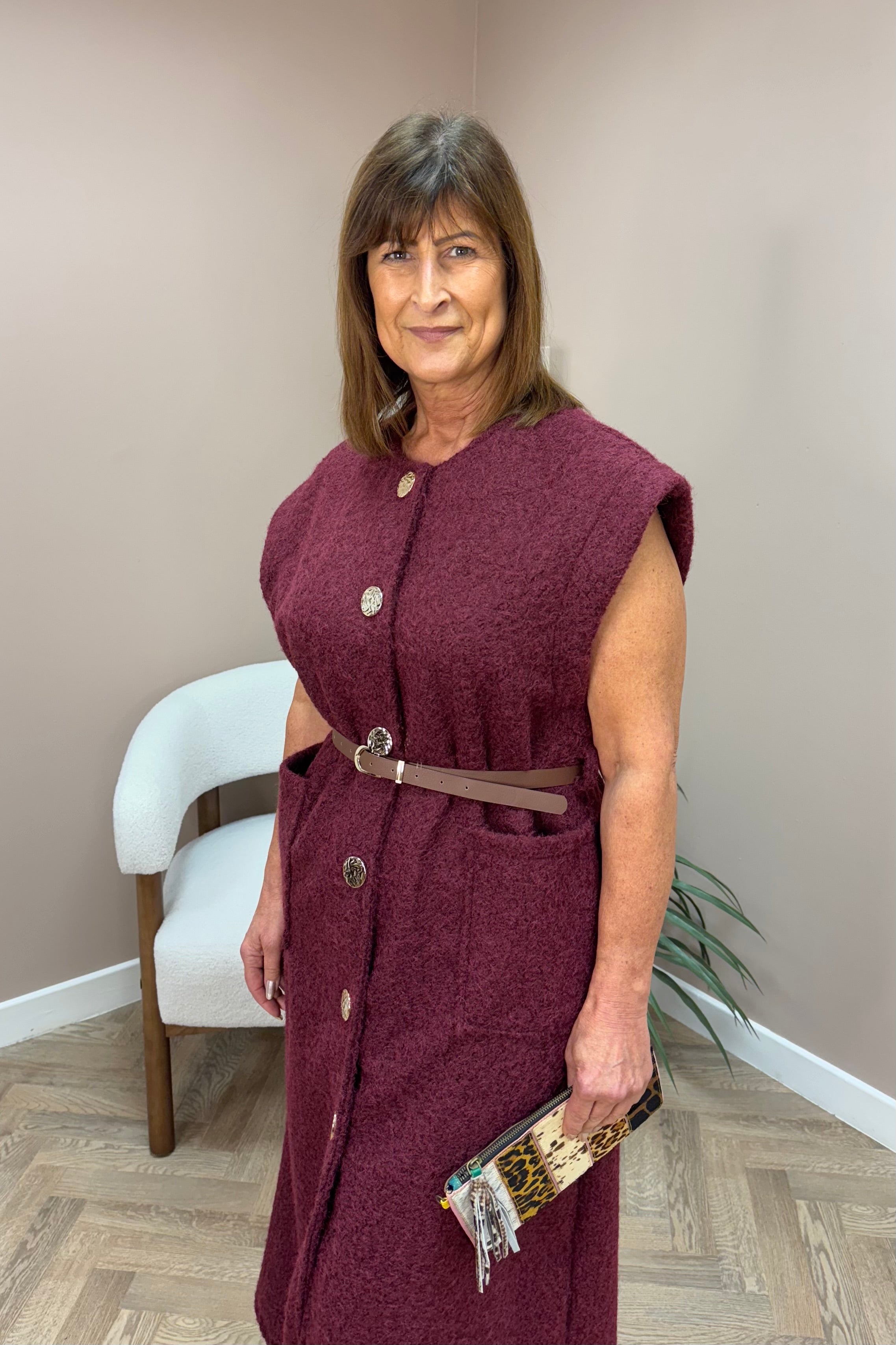 This long waistcoat is designed for versatility and style. Wear it as a dress or layer it as an extra piece for added flair. It features standout gold buttons, handy front pockets, and a brown belt to cinch the waist, offering both functionality and a polished look.
