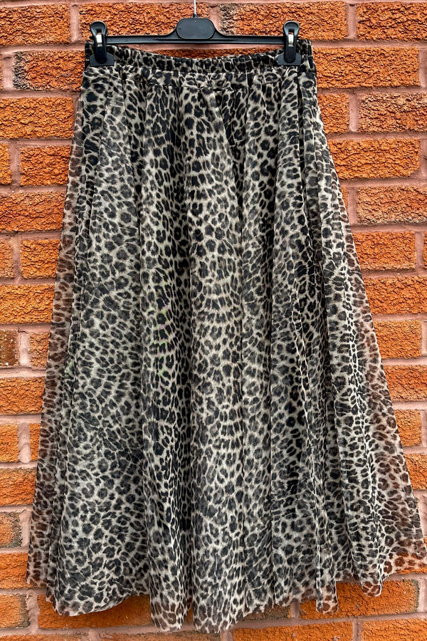 Beige Mini Leopard Printed Tulle Maxi Skirt