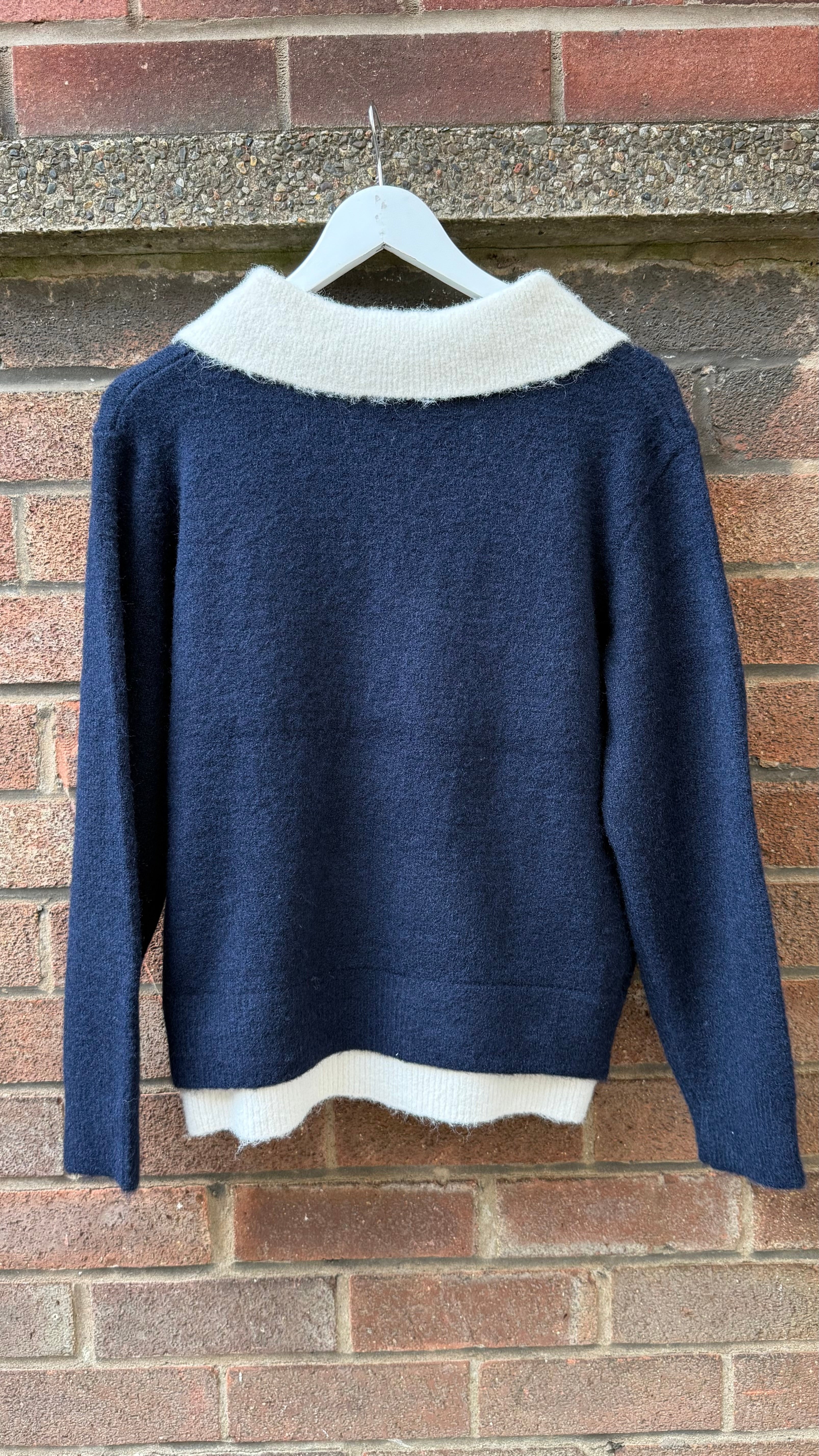 Rich navy knit with soft contrast collar and hem for a refined finish