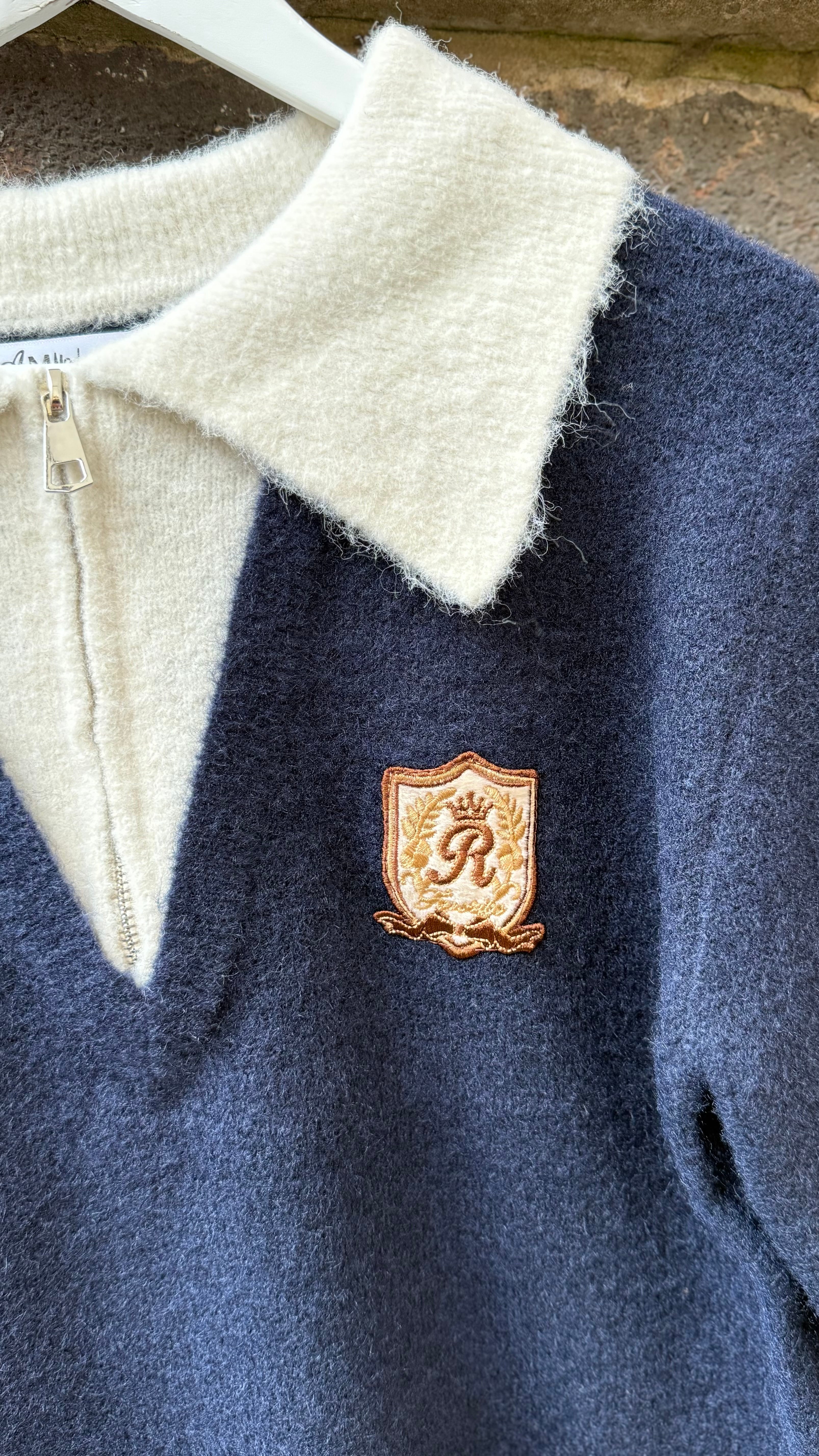 Channel timeless elegance with this rich navy knit sweater, complete with a plush contrast collar and hem for a touch of sophistication. The deep V-neckline with half-zip detail adds a modern twist, while the embroidered crest patch brings a classic heritage feel that nods to refined sporting traditions. Perfect for elevating your everyday wardrobe, this piece pairs beautifully with tailored trousers, denim, or layered over a crisp shirt for an effortlessly polished look.
