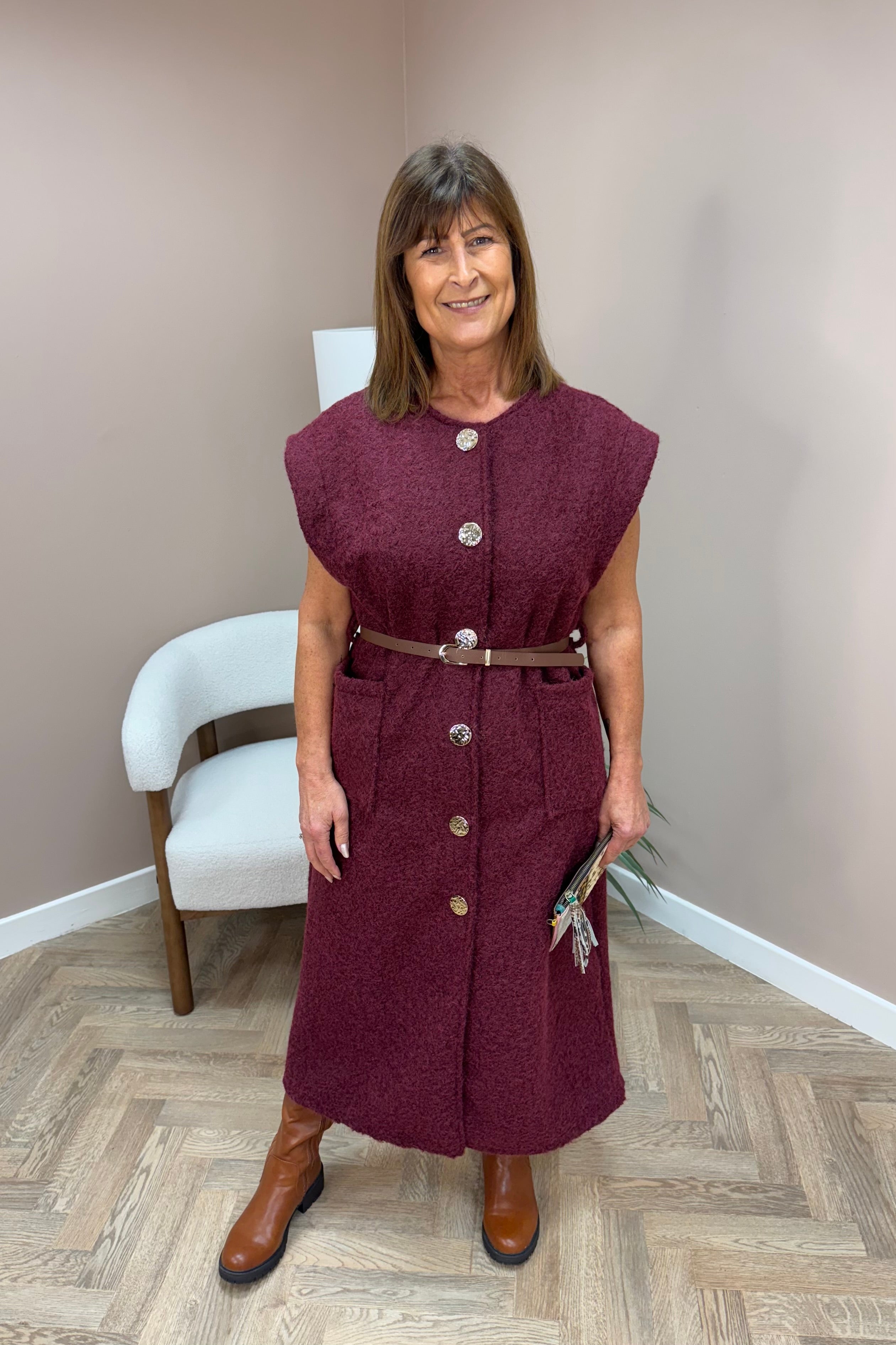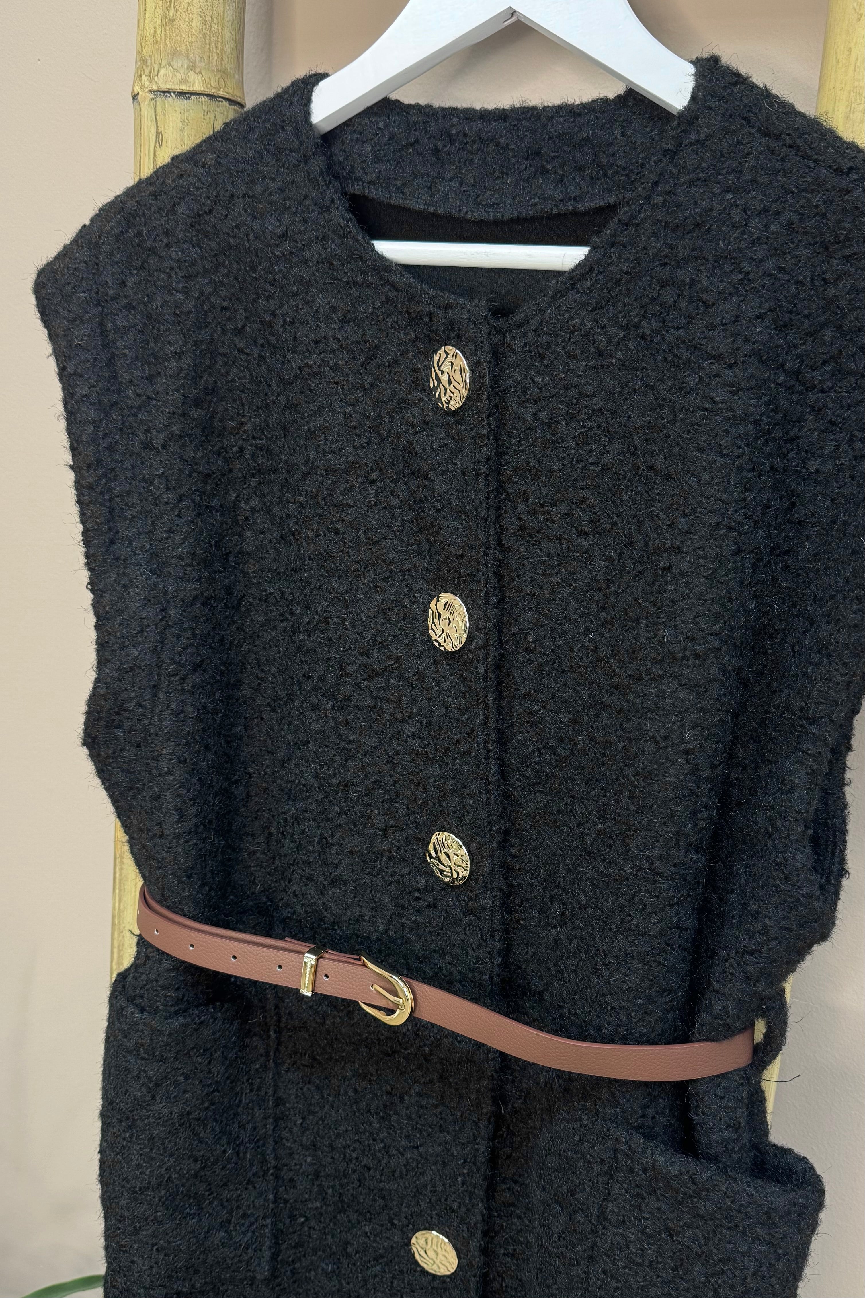 This long waistcoat is designed for versatility and style. Wear it as a dress or layer it as an extra piece for added flair. It features standout gold buttons, handy front pockets, and a brown belt to cinch the waist, offering both functionality and a polished look.