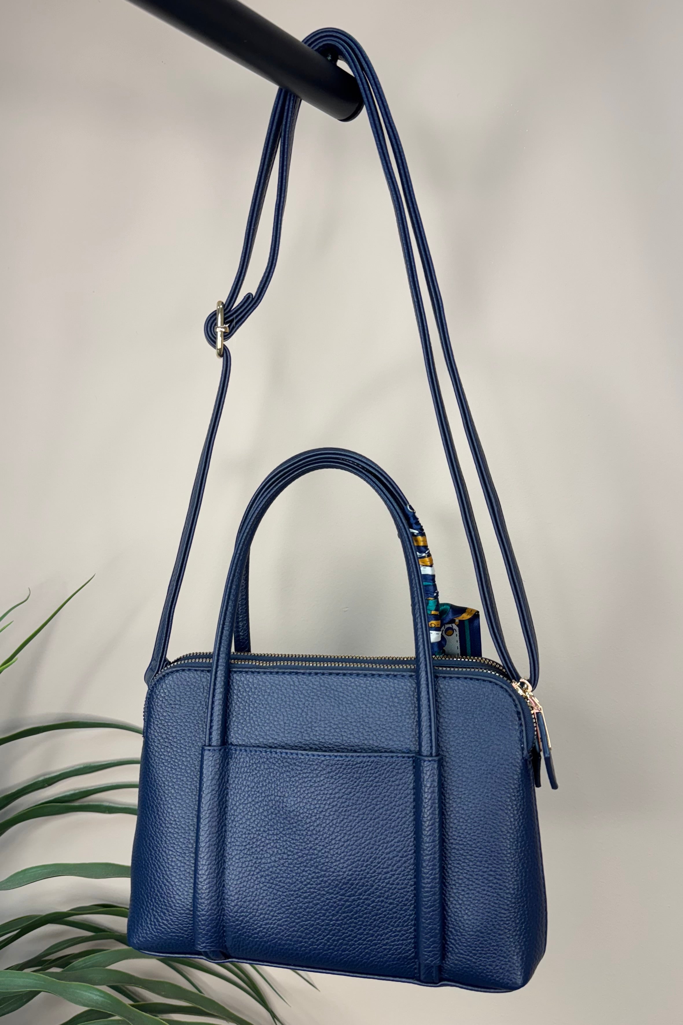 The Navy Silk Tie Handbag is a stylish and practical addition to your wardrobe essentials. It offers two zippered compartments and a handy side pockets to keep your items organised. Designed with large handles for easy carrying and a crossbody strap for versatility, it adapts to your daily needs. Finished with a luxurious silk tie featuring a chic chain design, this handbag combines elegance with everyday functionality.