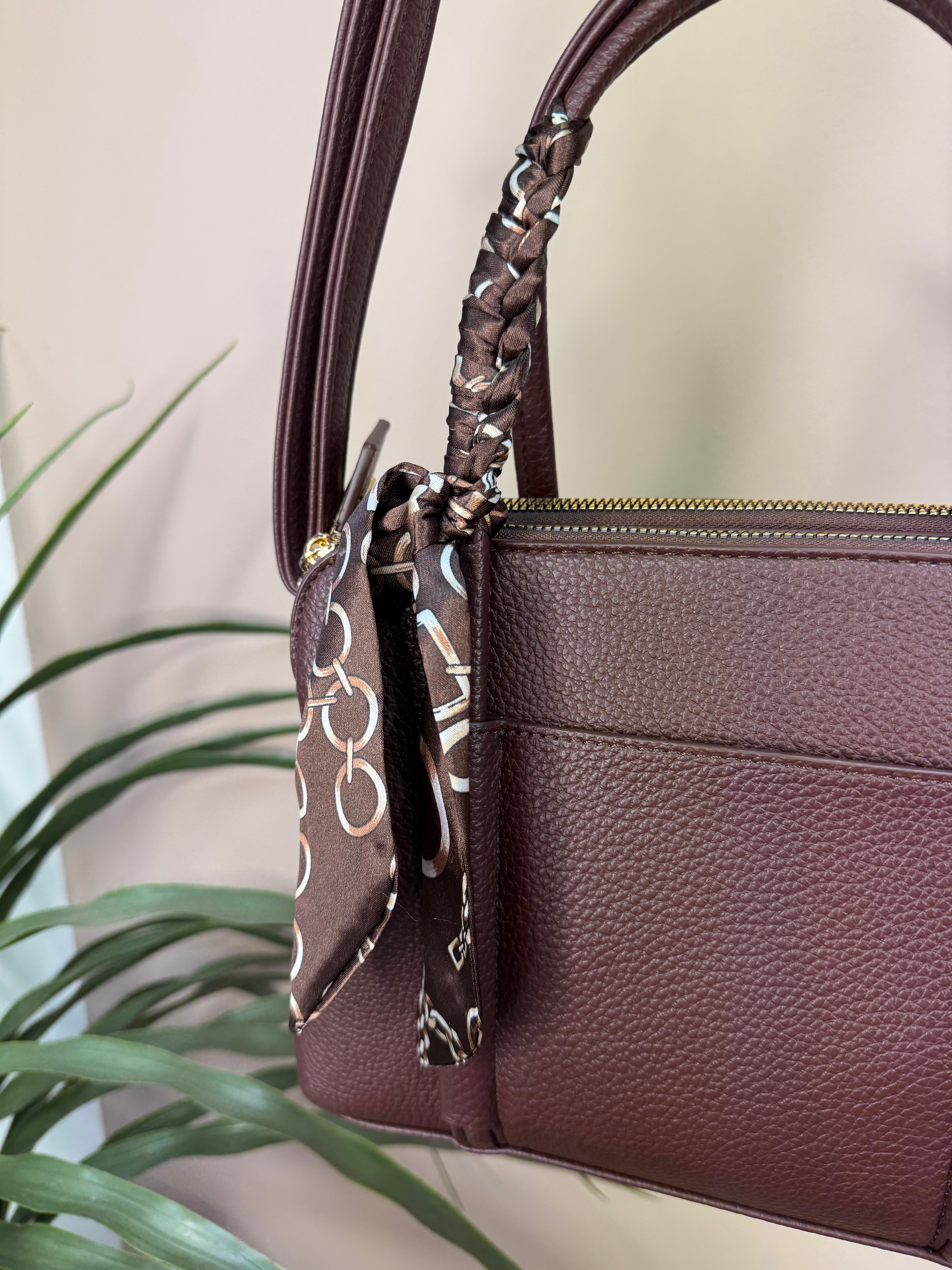 The Plum Silk Tie Handbag is a stylish and practical addition to your wardrobe essentials. It offers two zippered compartments and a handy side pockets to keep your items organised. Designed with large handles for easy carrying and a crossbody strap for versatility, it adapts to your daily needs. Finished with a luxurious silk tie featuring a chic chain design, this handbag combines elegance with everyday functionality.