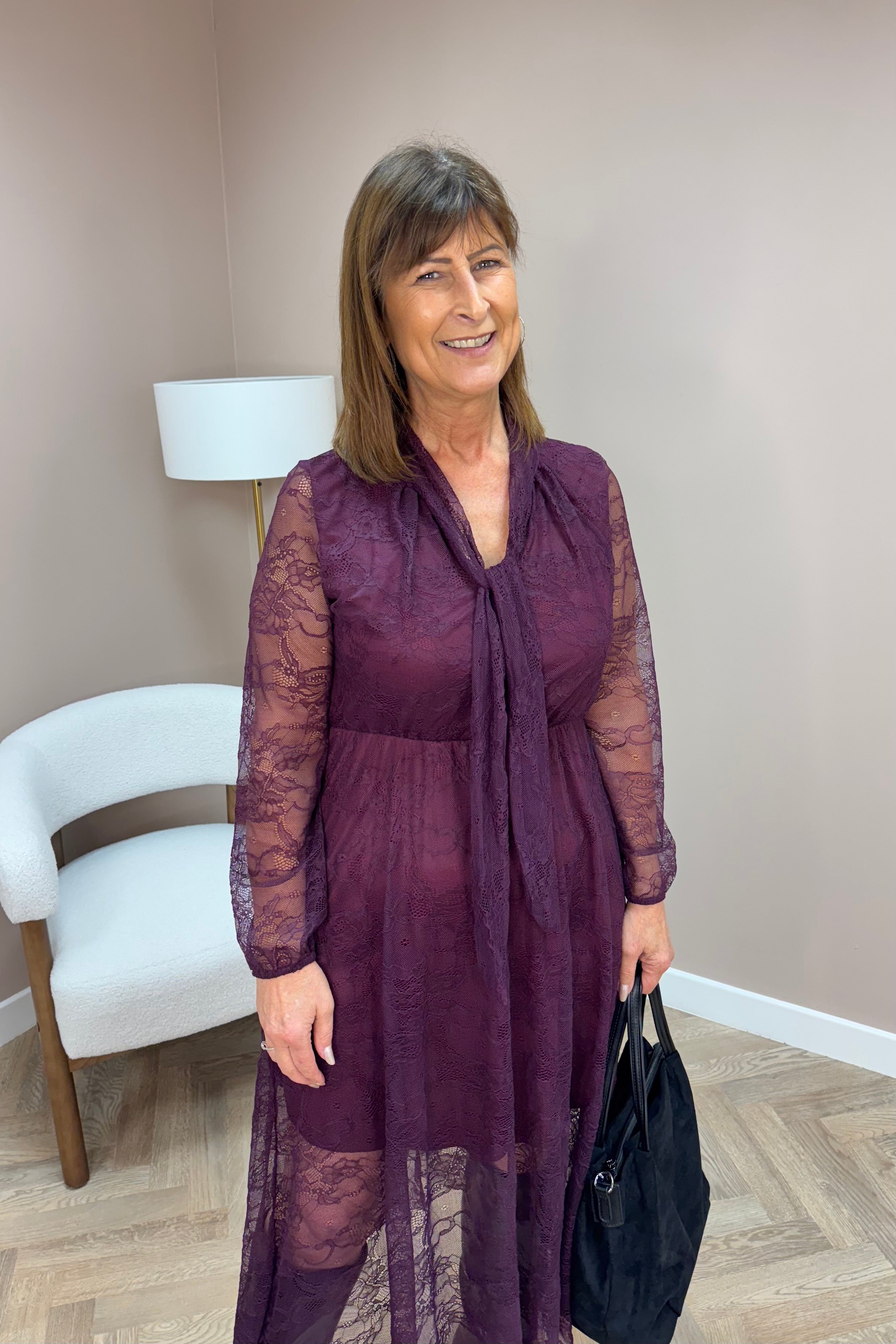 The Lace Pussy Bow Dress features exquisite full lace detailing complemented by a soft lining for gentle wear. A delicate tie at the neck enhances its elegant silhouette, while the mid-length design offers timeless sophistication suitable for any refined occasion.