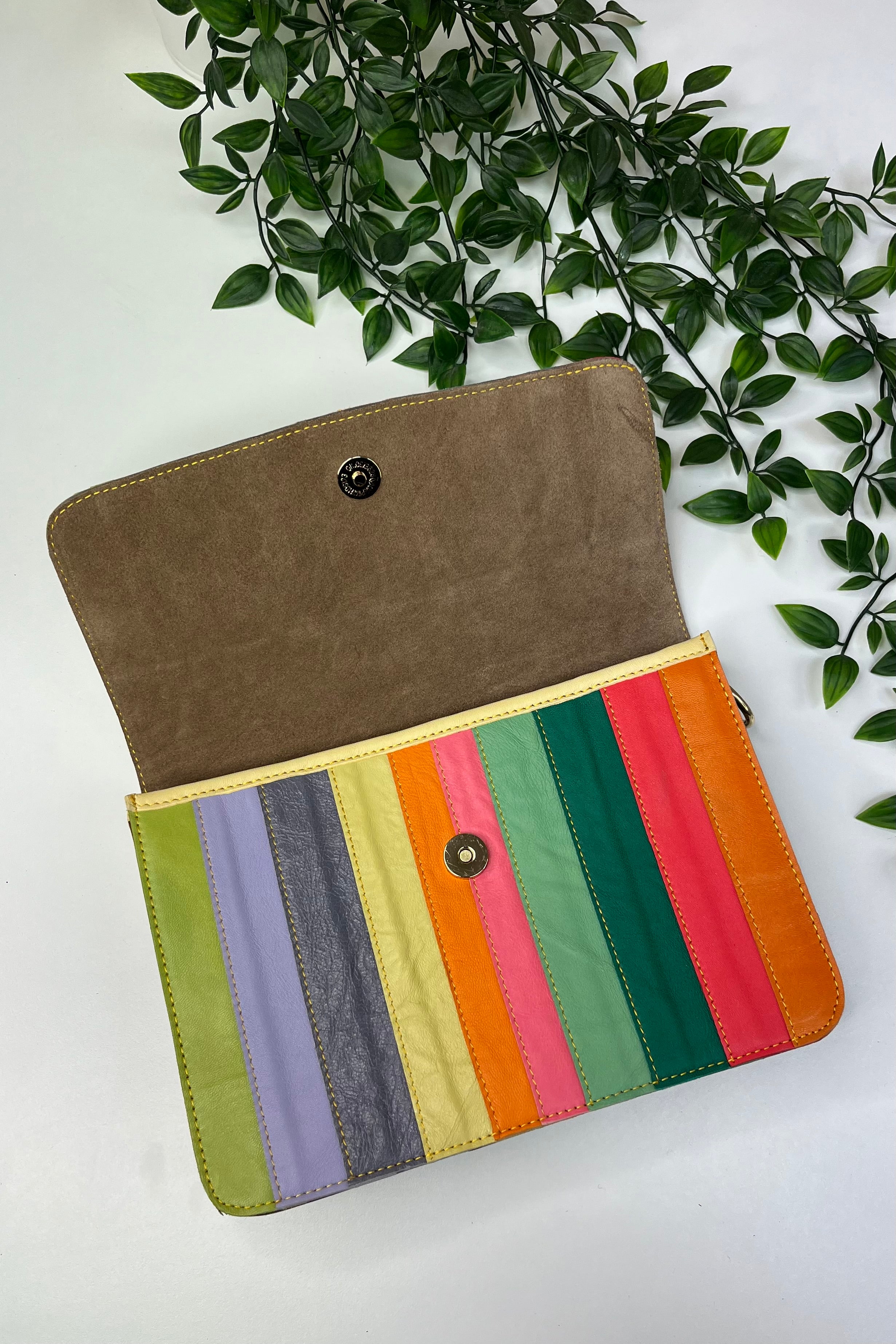 The Rainbow Crossbody Bag has a beautiful arrangement of colourful stripes down the front, perfect for adding some for to your outfit. With clasp closure for security and different sections to organise your belongings, you wont want to miss out on owning this!