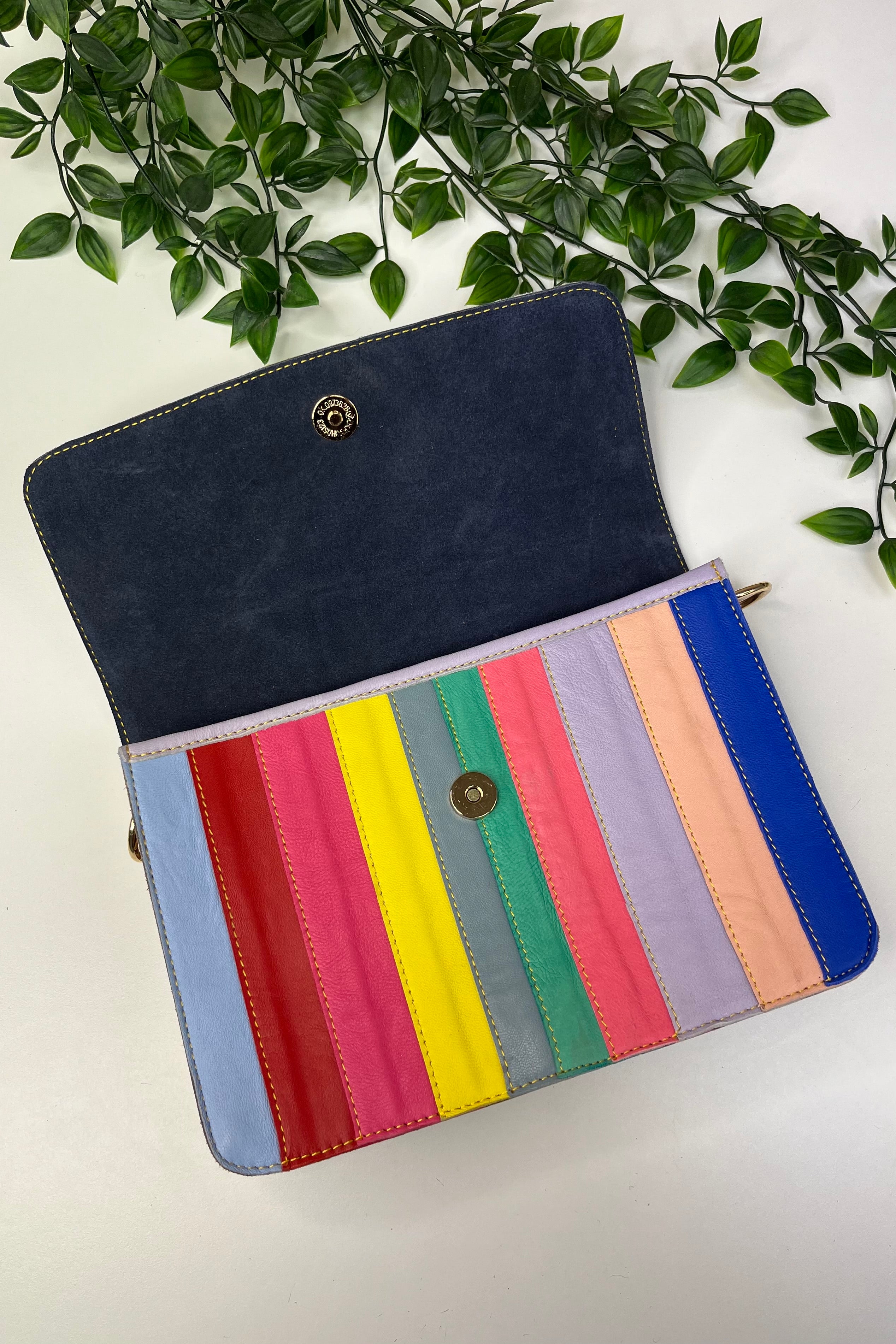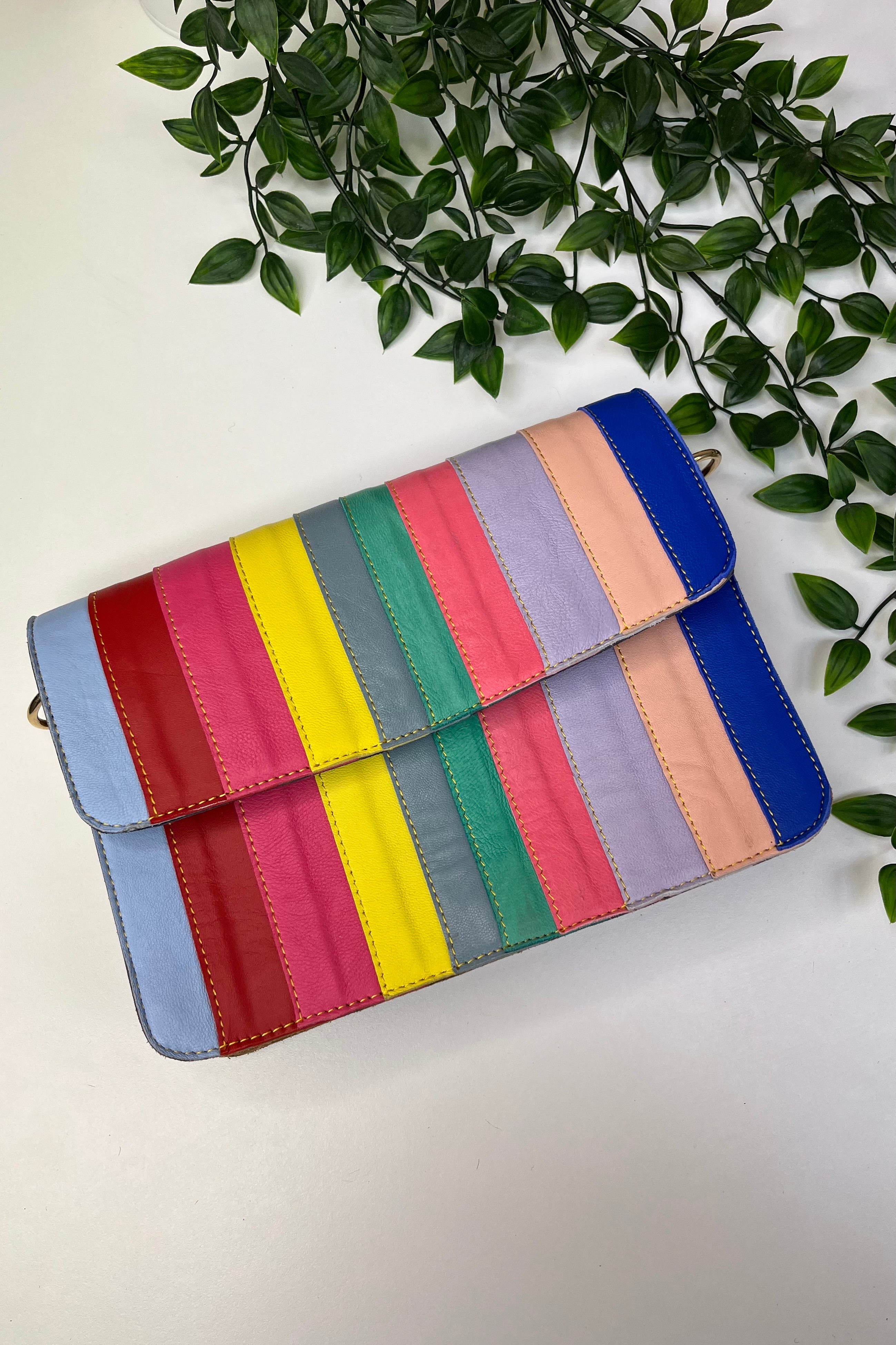 The Rainbow Crossbody Bag has a beautiful arrangement of colourful stripes down the front, perfect for adding some for to your outfit. With clasp closure for security and different sections to organise your belongings, you wont want to miss out on owning this!